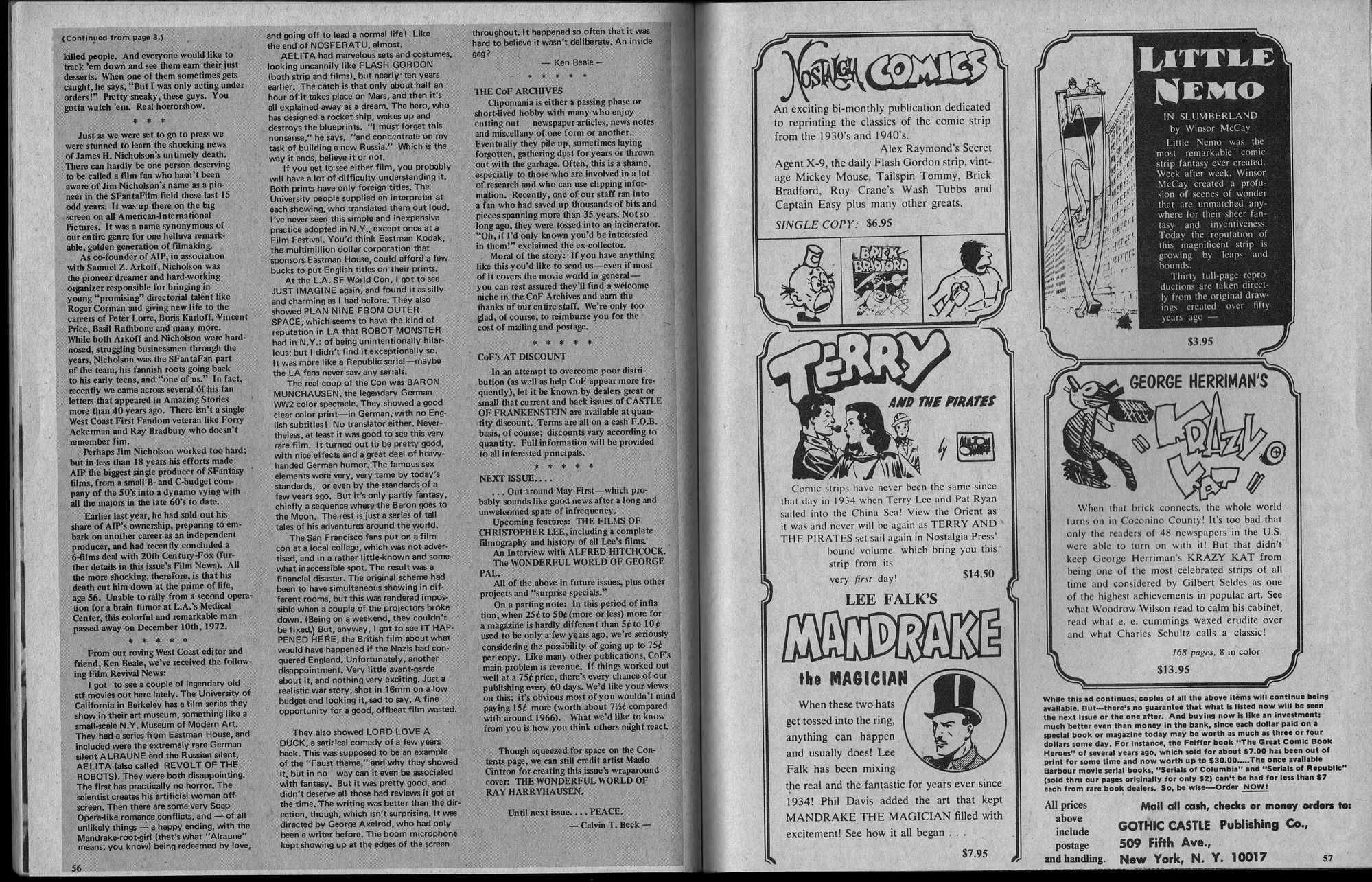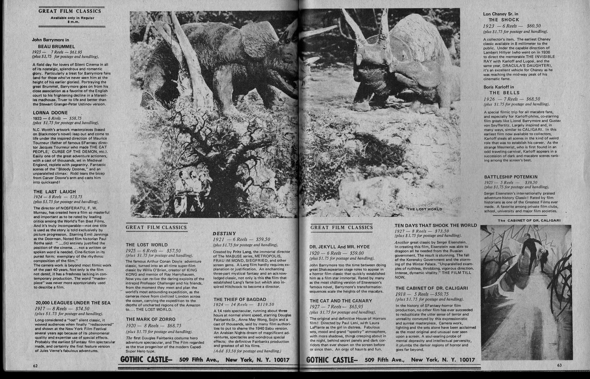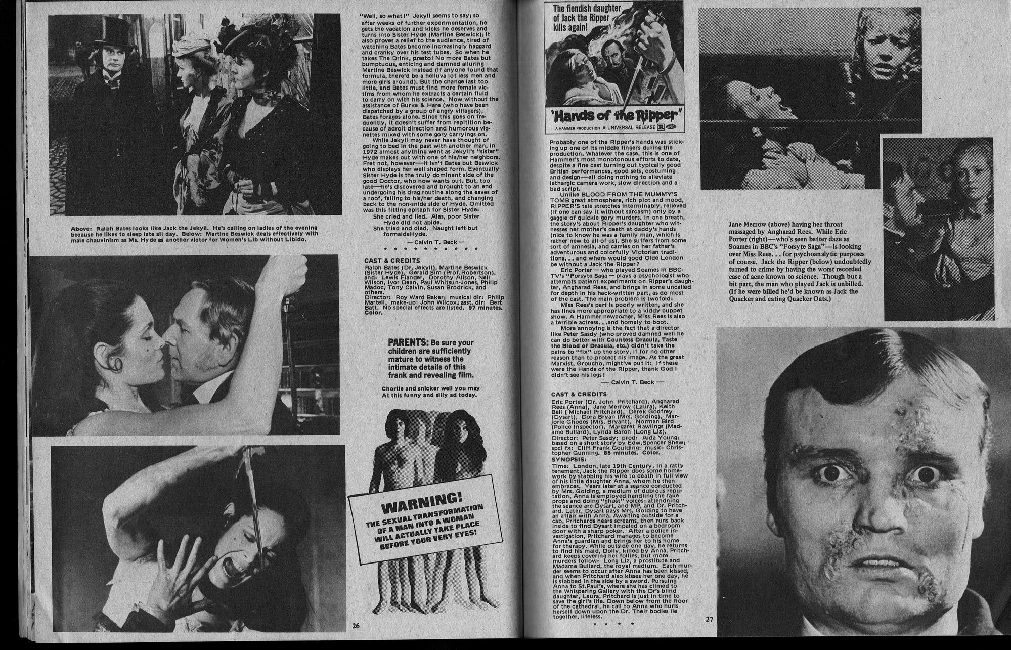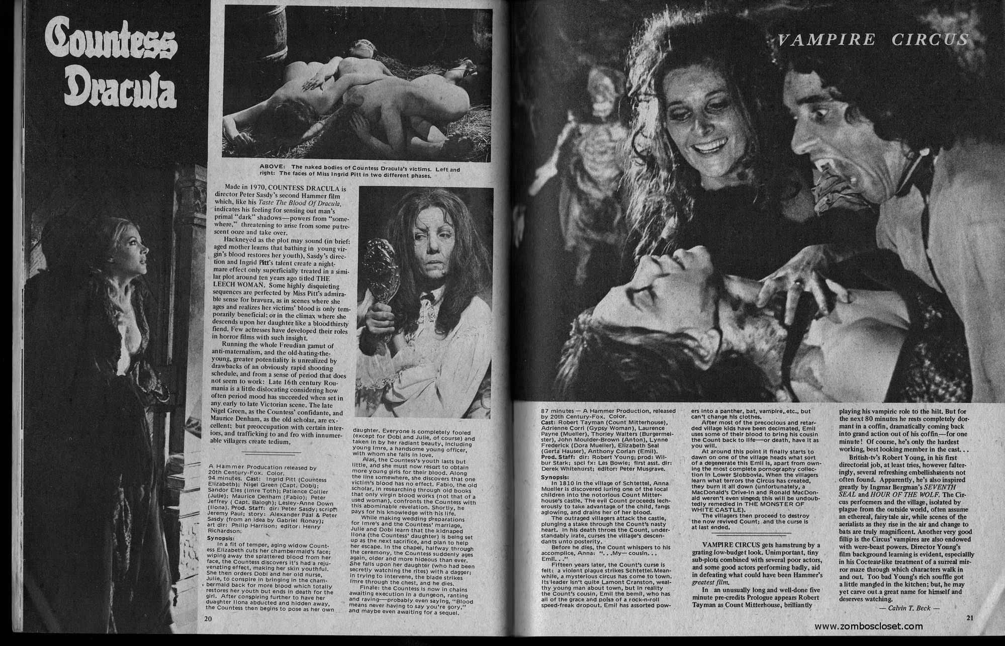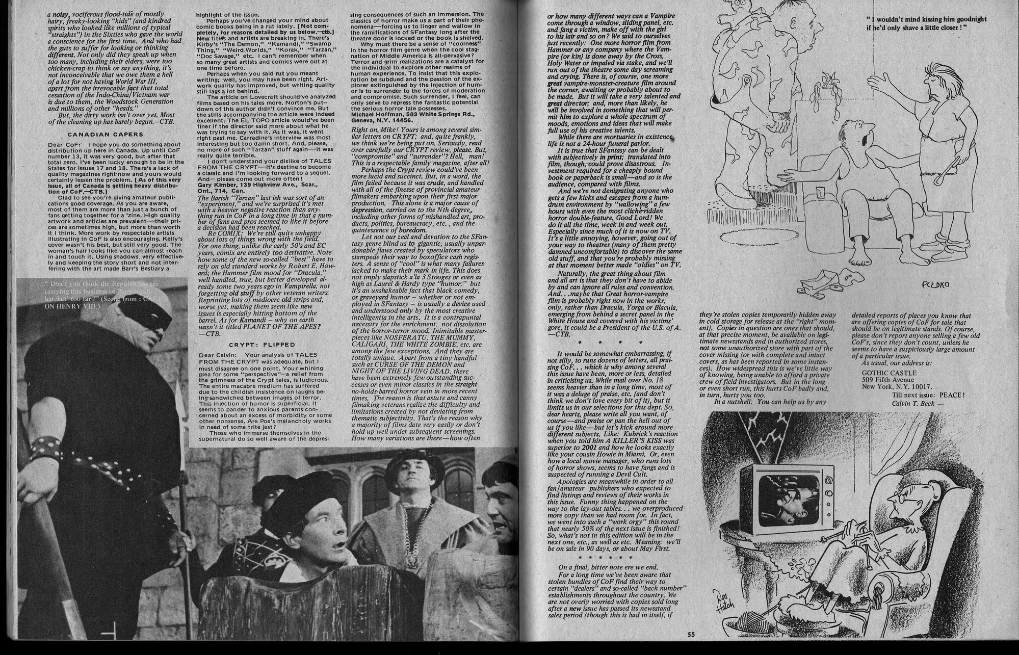 Issue 19 of Castle of Frankenstein contains the usual reviews (including Hammer Horror) and interviews (with Ray Harryhausen and Douglas Trumbull). Social commentary (this is the 1970s) enters with CoF's best horror film of the year choice: Vietnamese children running from a napalm attack.  A reader really dislikes issue 18 and wishes CoF would publish more frequently.