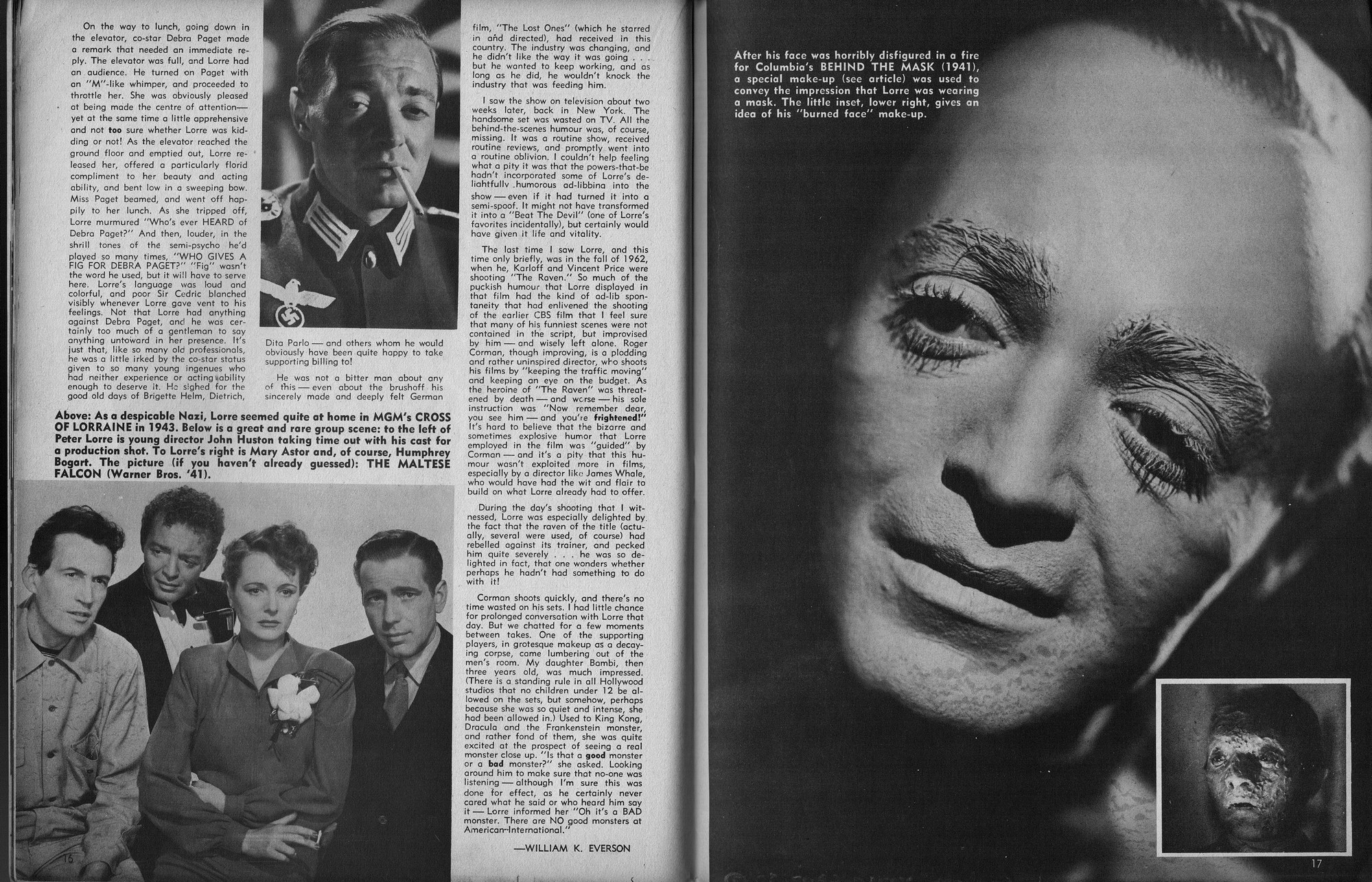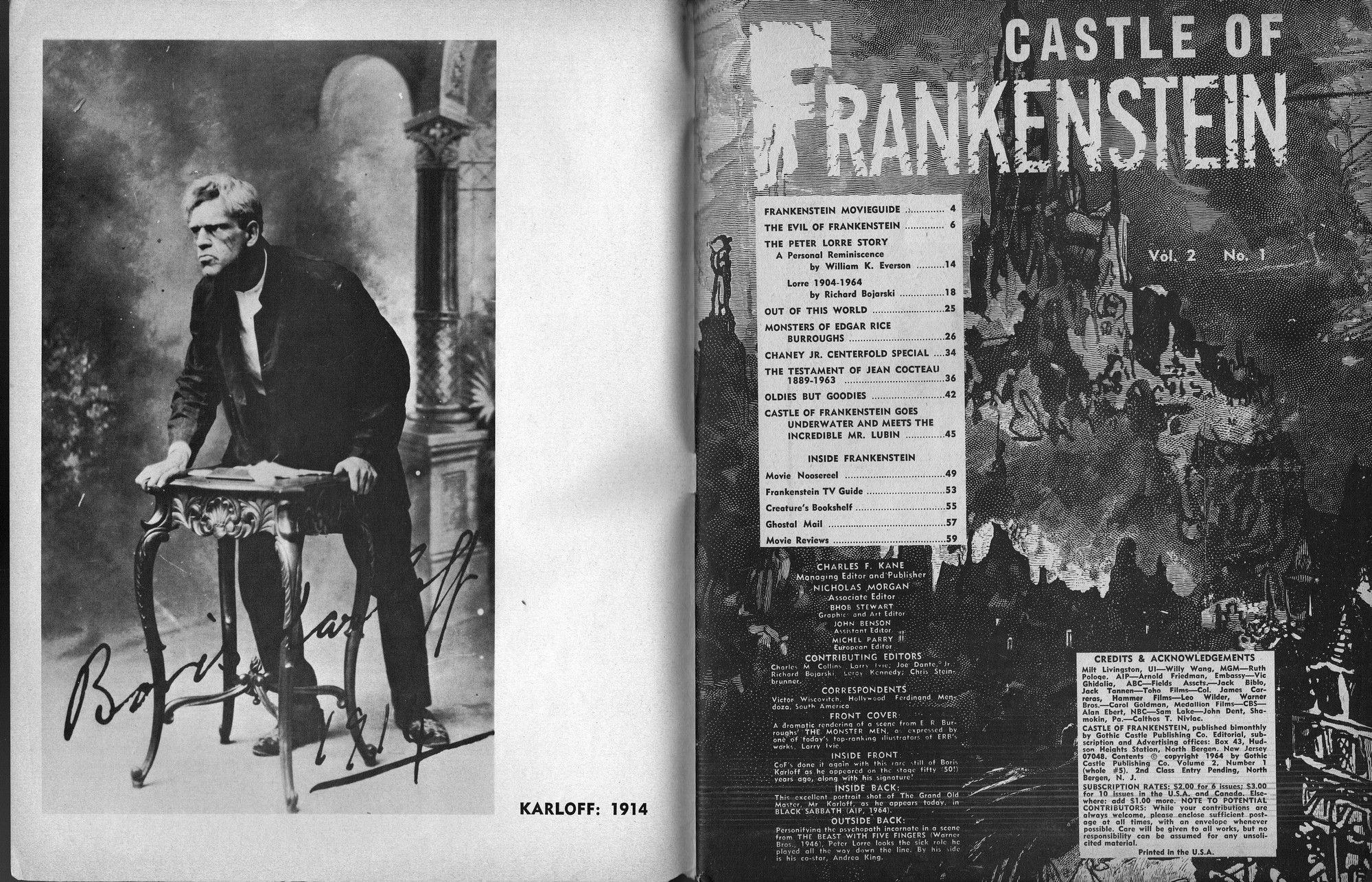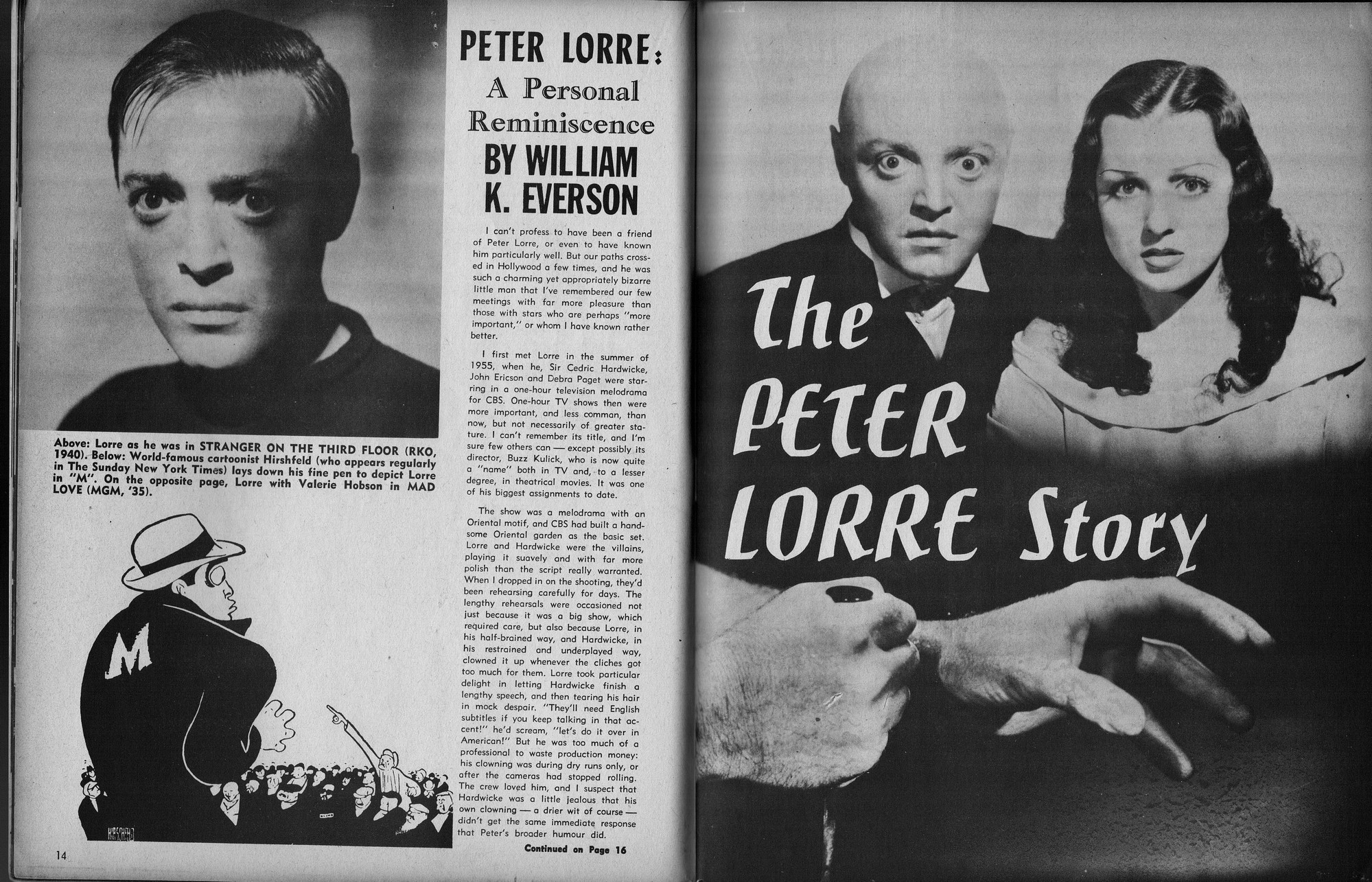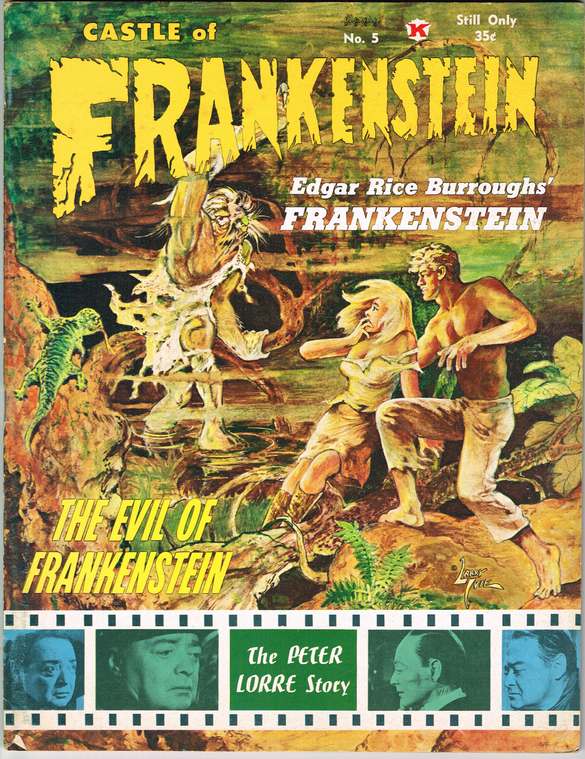 Peter Lorre receives attention from Richard Bojarski and William K. Everson in issue 5 of Castle of Frankenstein. This issue also marks the last of the illustrated covers. The Monsters of Edgar Rice Burroughs are revealed by Richard A. Lupoff and The Evil of Frankenstein is duly noted with lots of pictures. Directors Arthur Lubin and Jean Cocteau receive recognition, too. (This copy courtesy of Professor Kinema.) Here's the comic book reader version: Download Castle of Frankenstein Issue 5