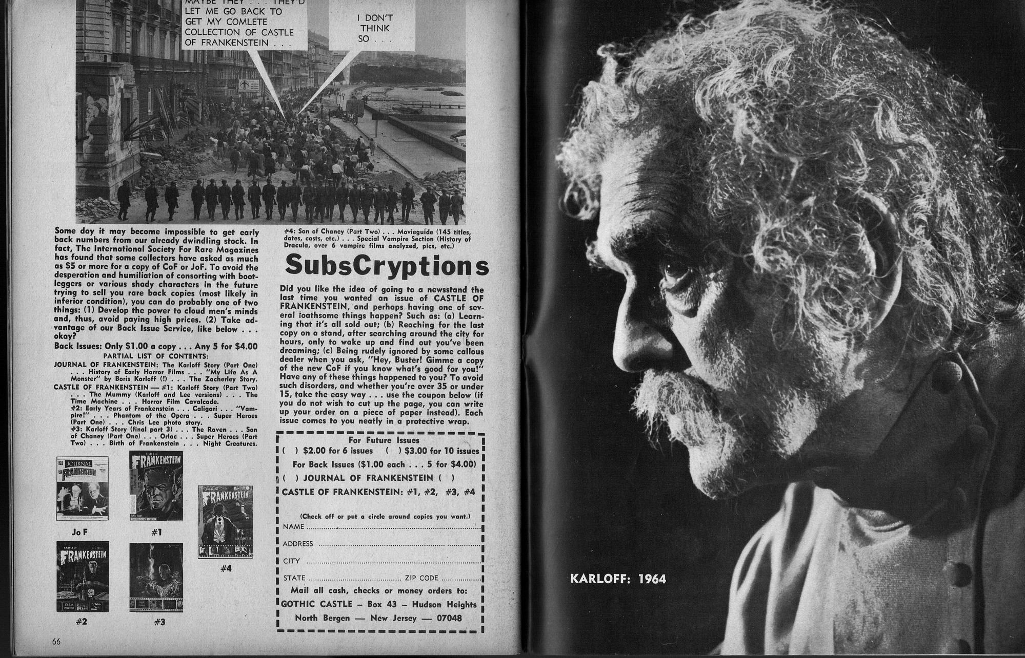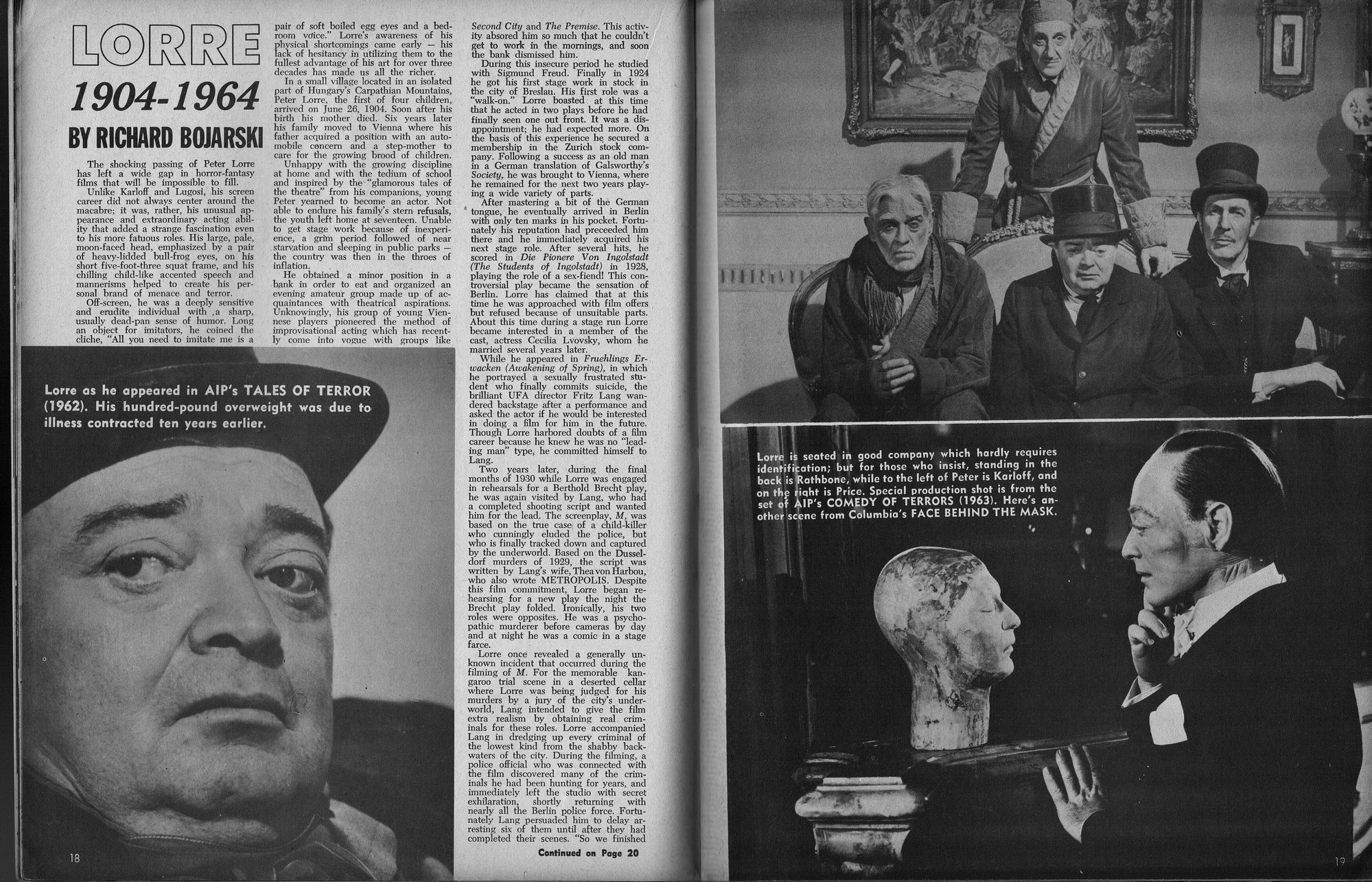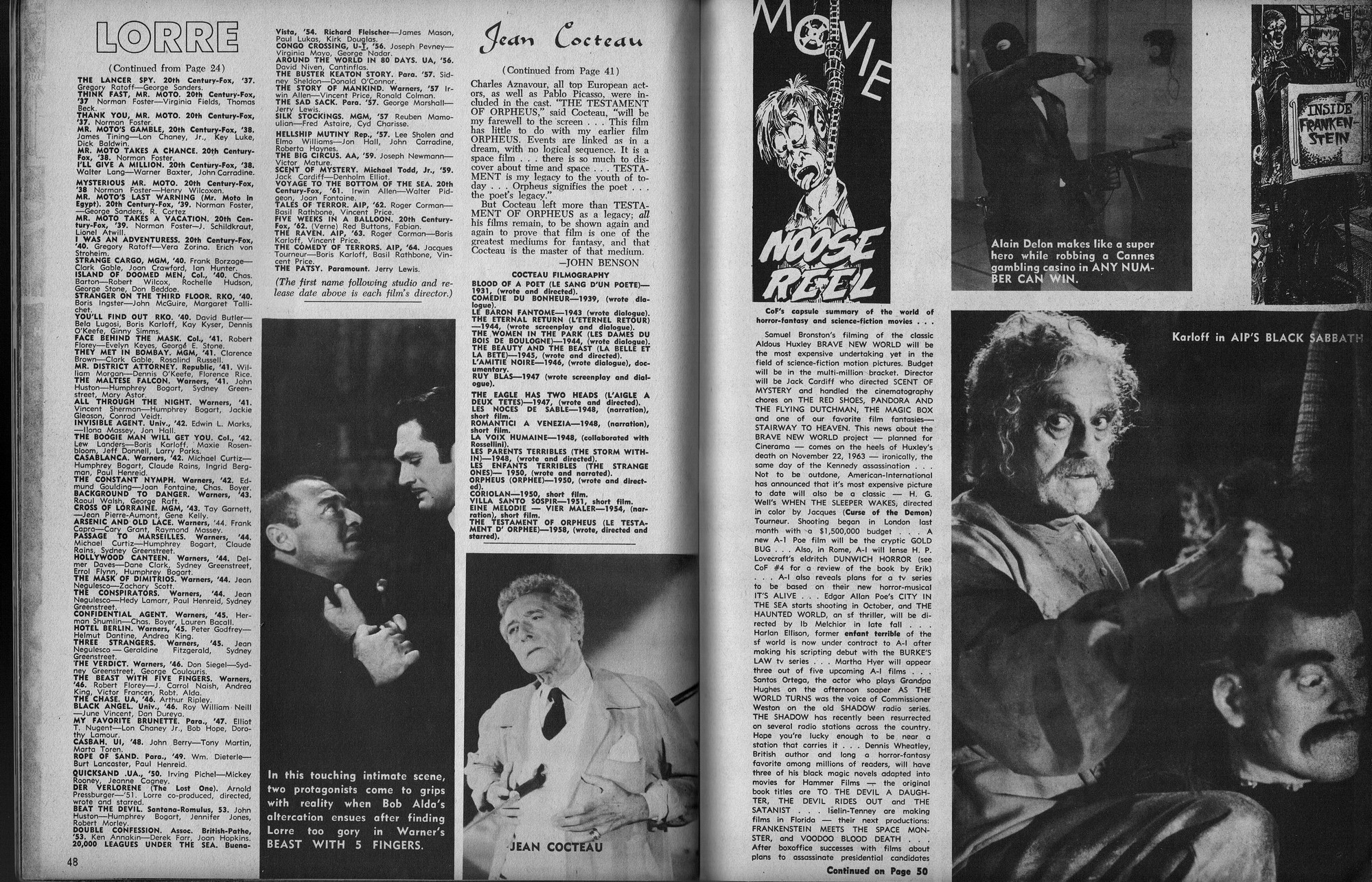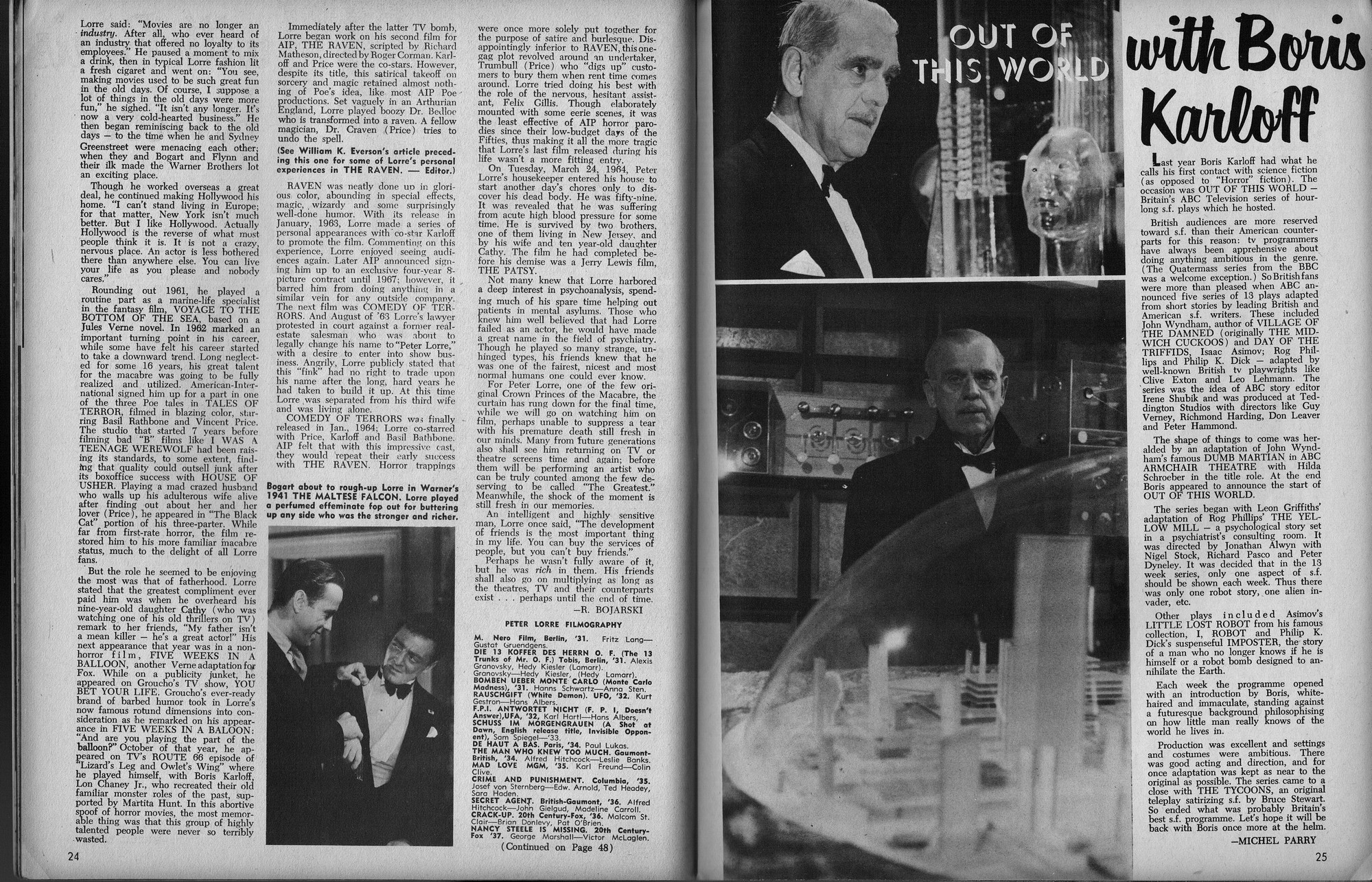 Peter Lorre receives attention from Richard Bojarski and William K. Everson in issue 5 of Castle of Frankenstein. This issue also marks the last of the illustrated covers. The Monsters of Edgar Rice Burroughs are revealed by Richard A. Lupoff and The Evil of Frankenstein is duly noted with lots of pictures. Directors Arthur Lubin and Jean Cocteau receive recognition, too. (This copy courtesy of Professor Kinema.) Here's the comic book reader version: Download Castle of Frankenstein Issue 5