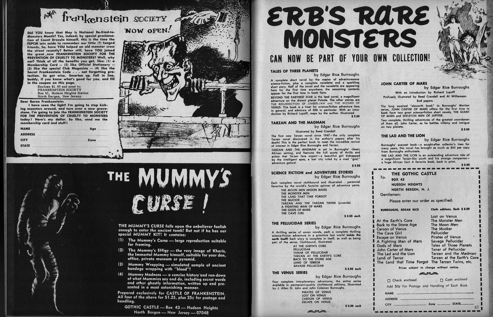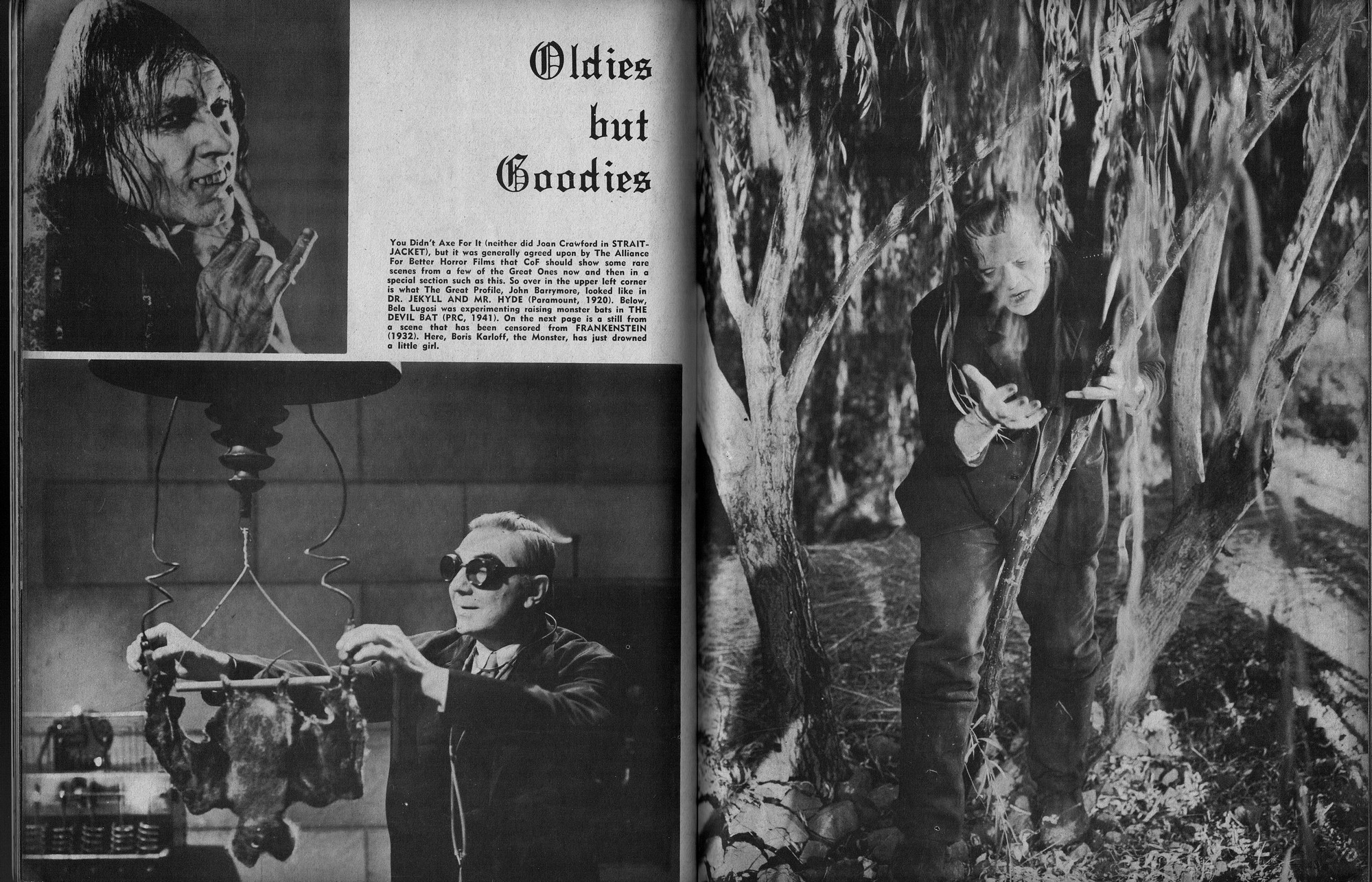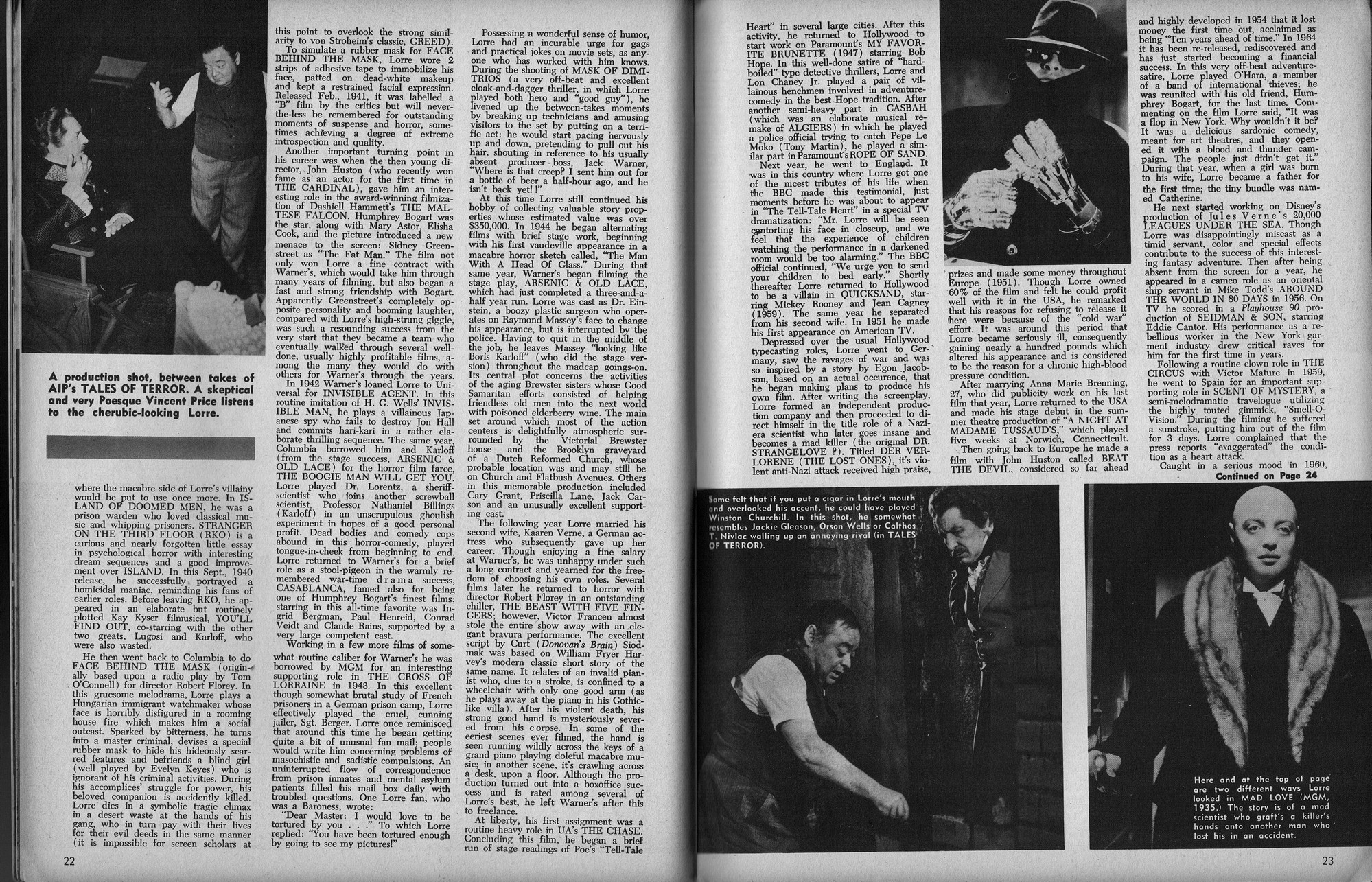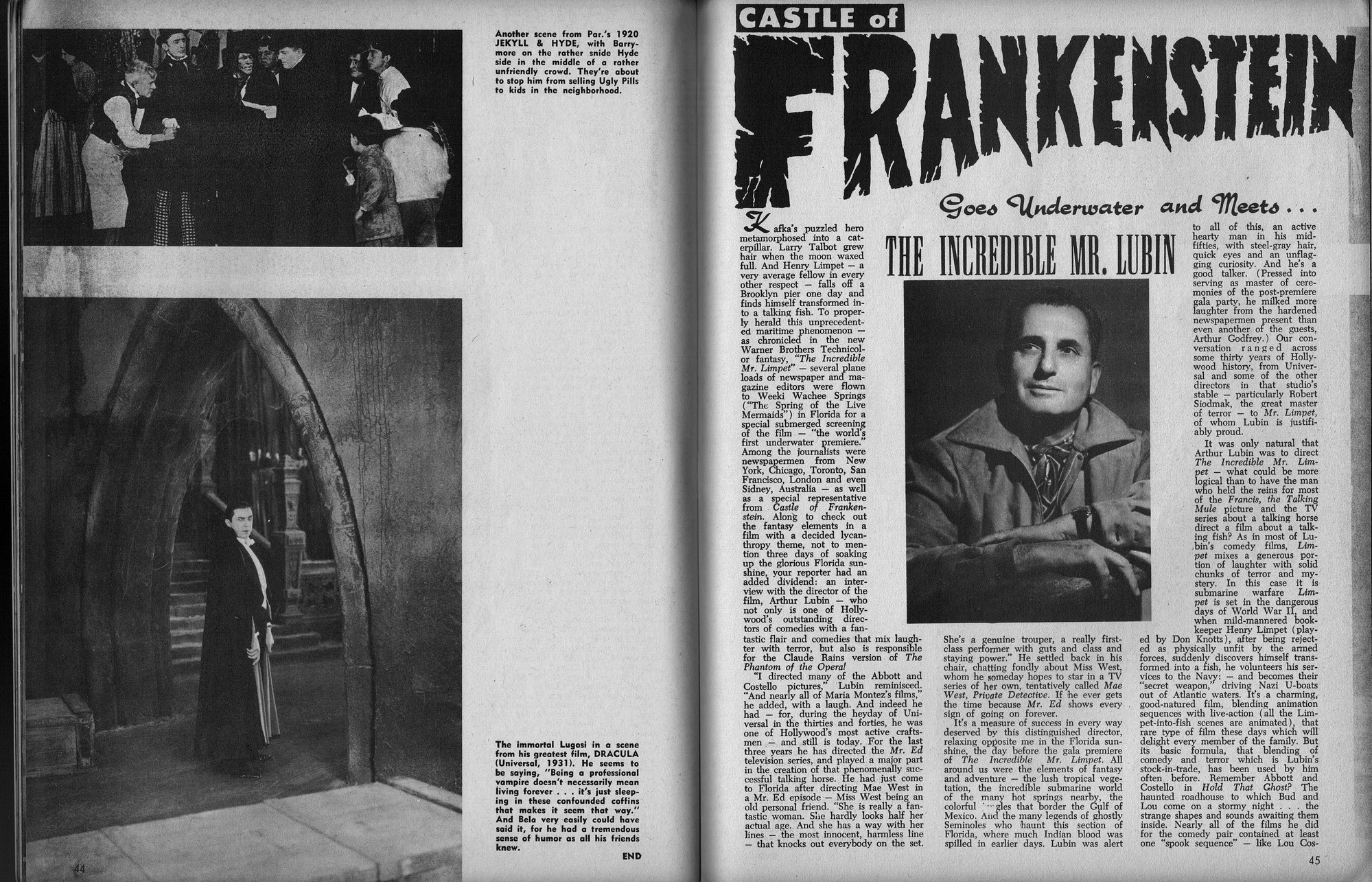 Peter Lorre receives attention from Richard Bojarski and William K. Everson in issue 5 of Castle of Frankenstein. This issue also marks the last of the illustrated covers. The Monsters of Edgar Rice Burroughs are revealed by Richard A. Lupoff and The Evil of Frankenstein is duly noted with lots of pictures. Directors Arthur Lubin and Jean Cocteau receive recognition, too. (This copy courtesy of Professor Kinema.) Here's the comic book reader version: Download Castle of Frankenstein Issue 5