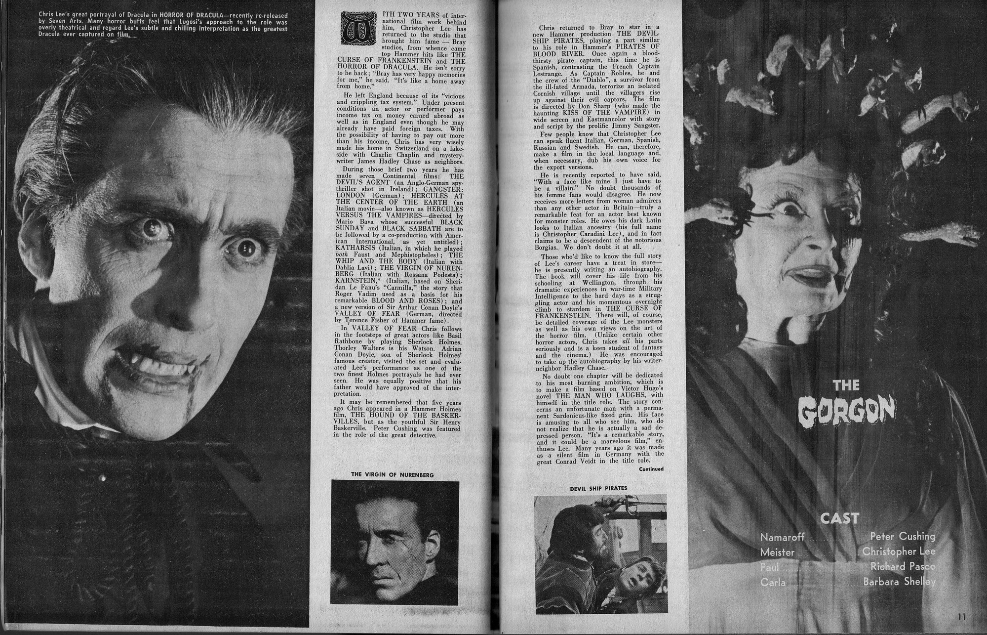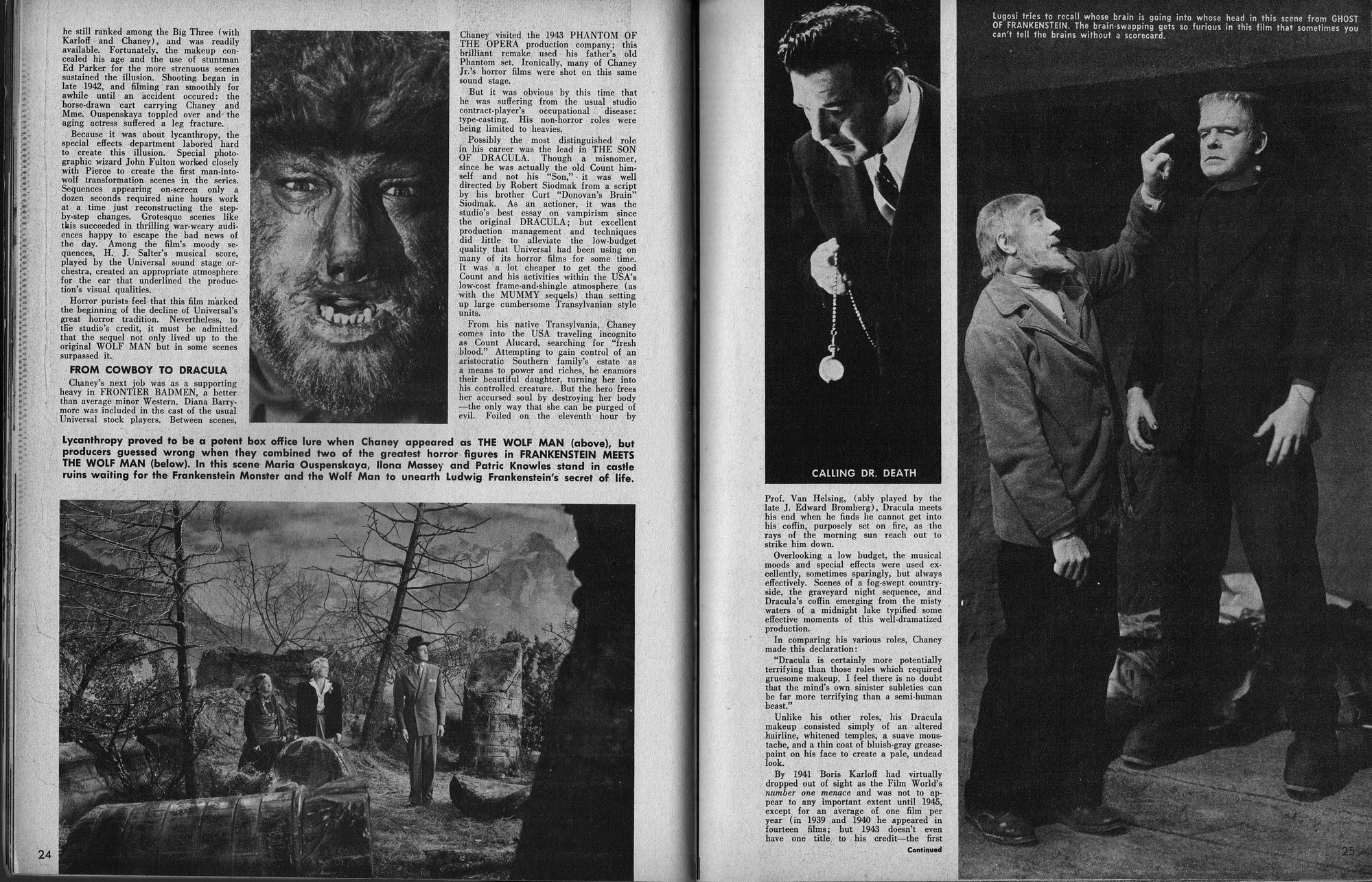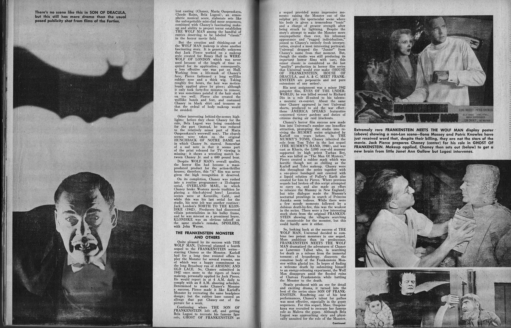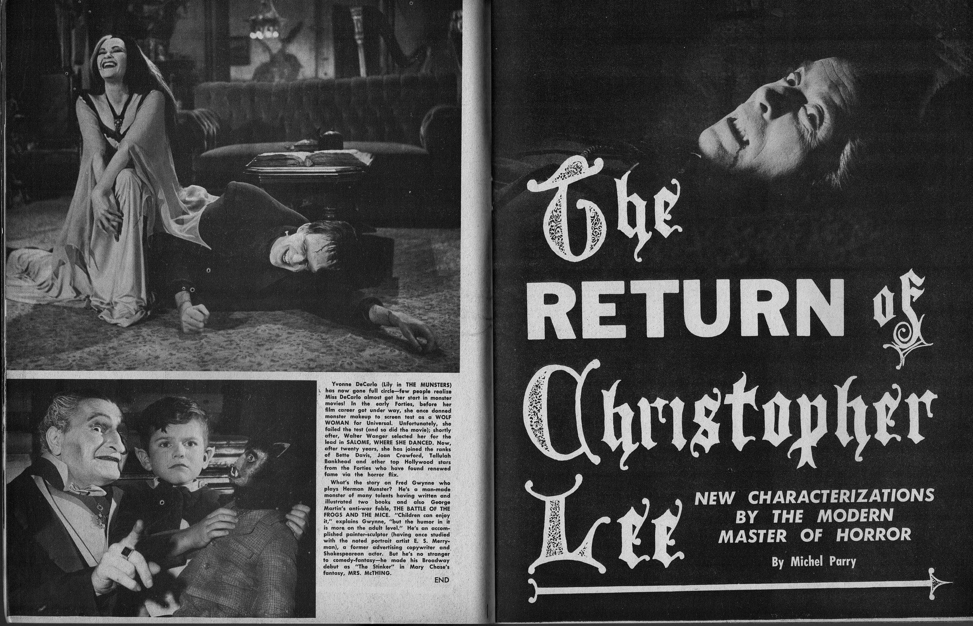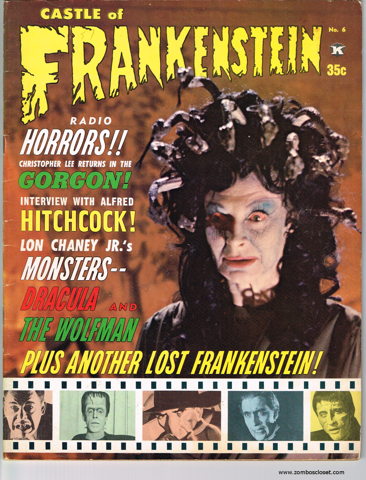 Lon Chaney Jr’s monstrous creations, The Munsters, and Christopher Lee kick off the 6th issue of Castle of Frankenstein. A timely article on Alfred Hitchcock (for me, that is: I had just watched the documentary, Hitchcock/Truffaut, and I’m reading the splendid book) is to die for, and a nostalgic look at Horror on the Air and those wonderful radio shows makes this a solid reading experience.