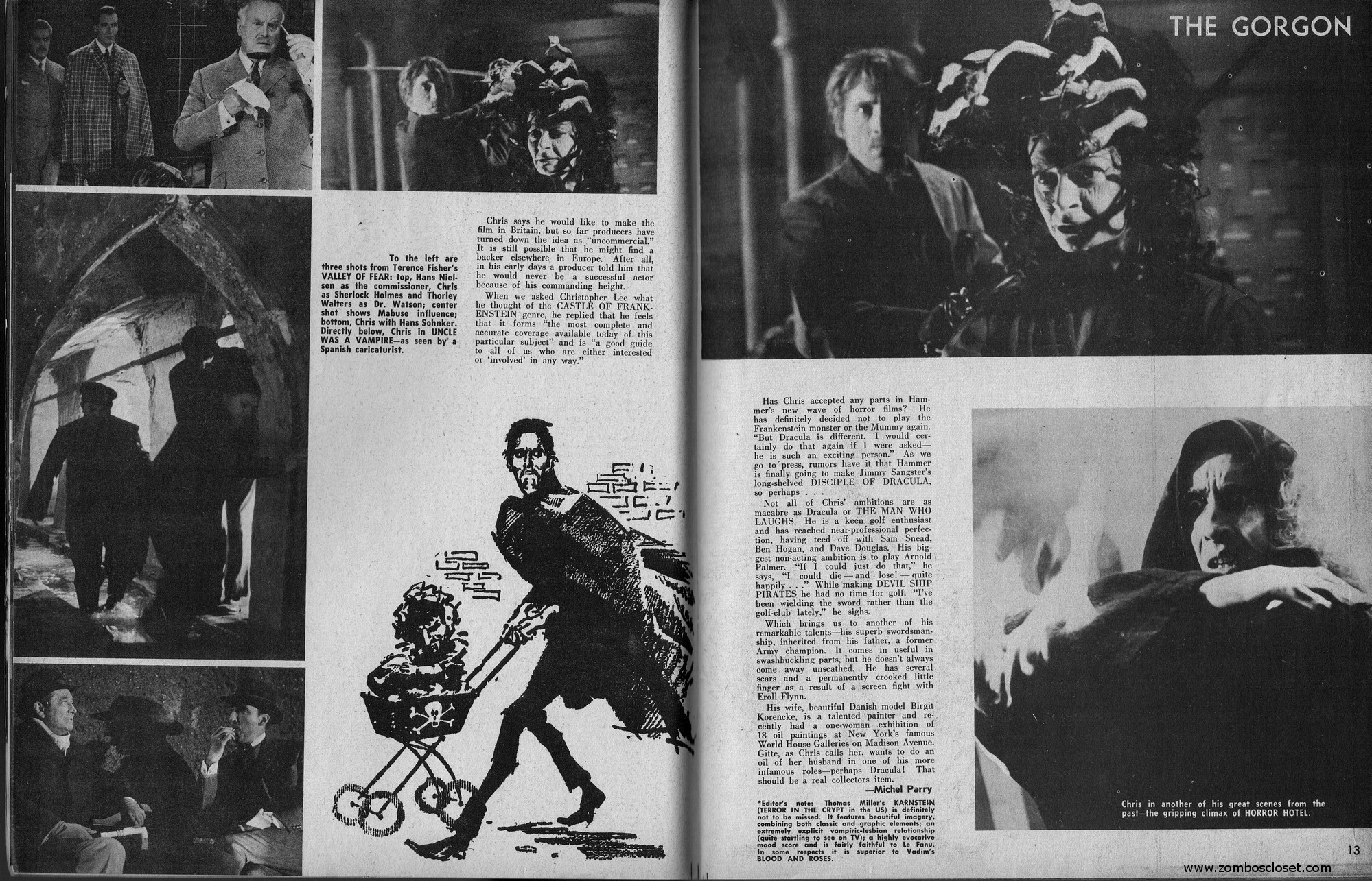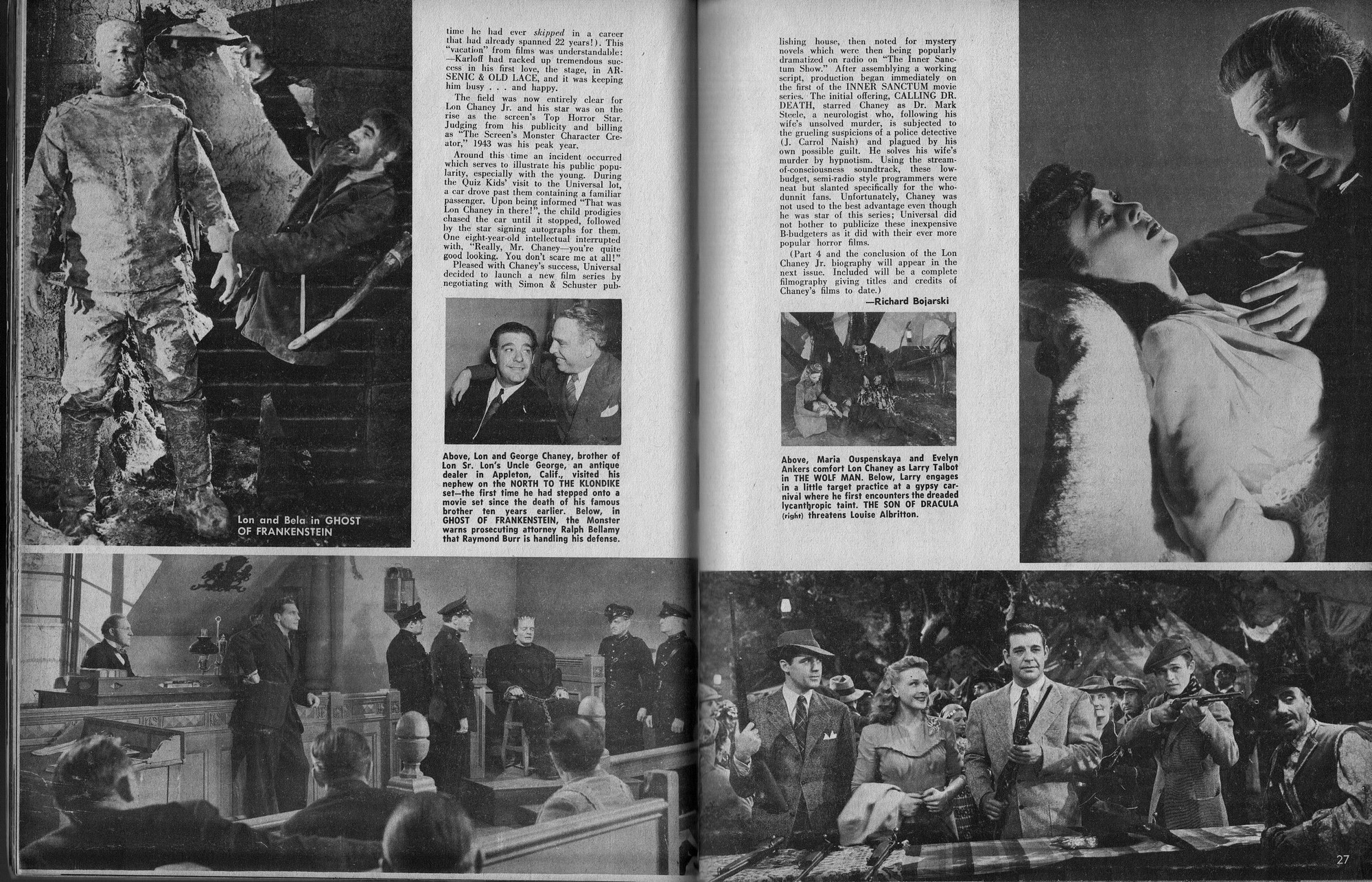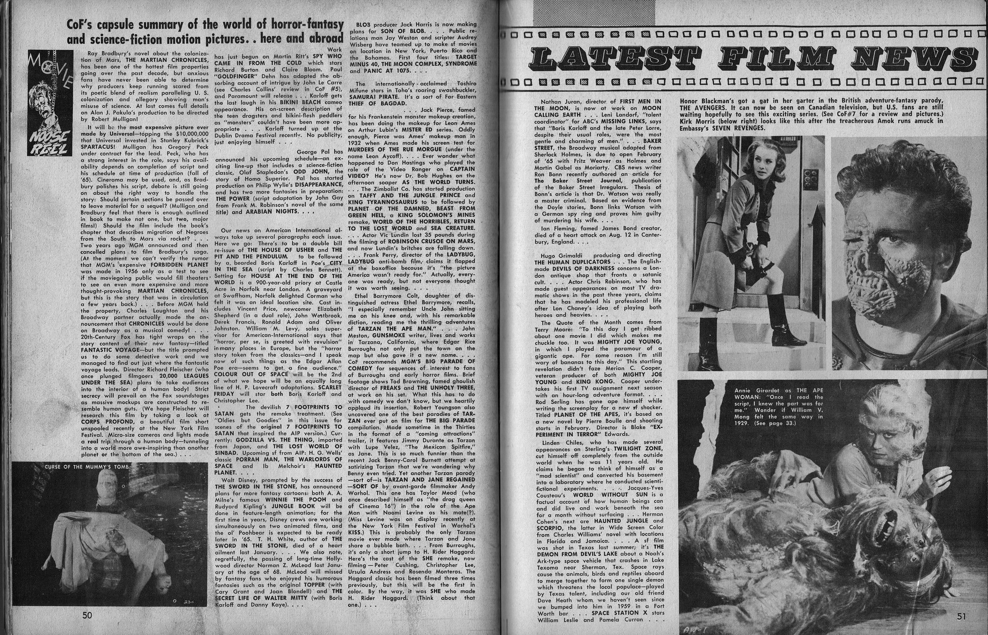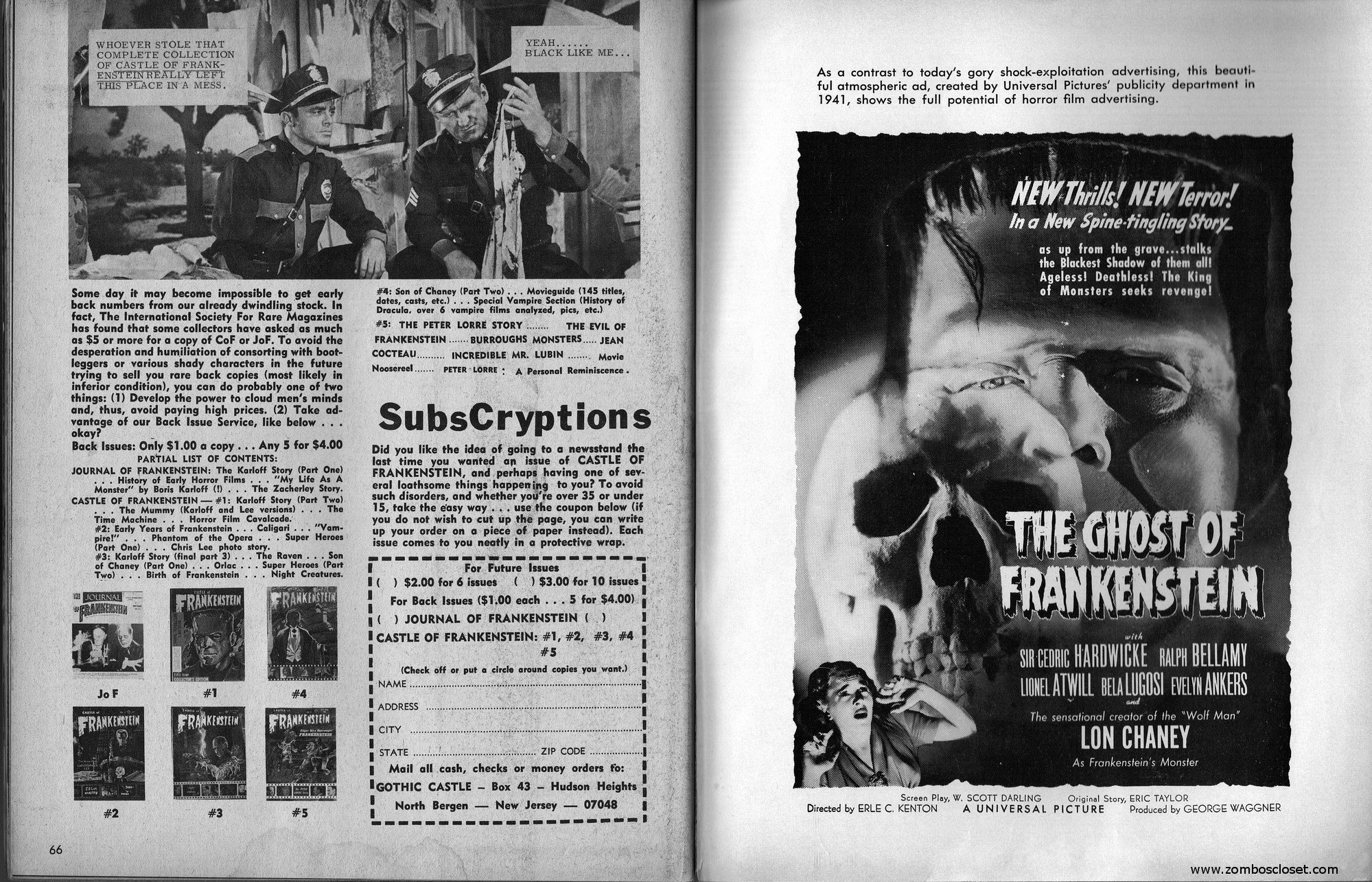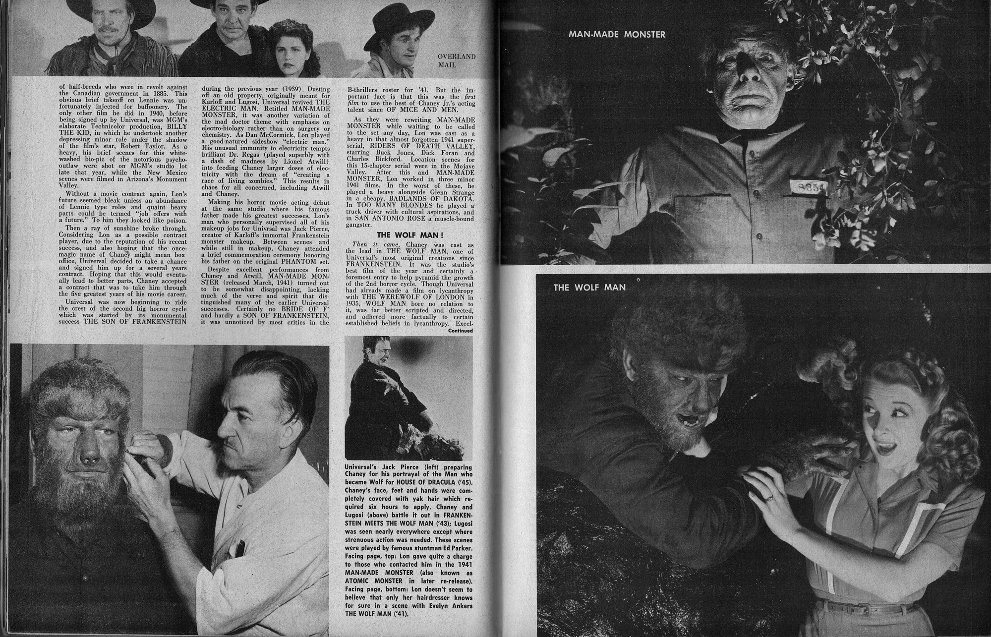 Lon Chaney Jr’s monstrous creations, The Munsters, and Christopher Lee kick off the 6th issue of Castle of Frankenstein. A timely article on Alfred Hitchcock (for me, that is: I had just watched the documentary, Hitchcock/Truffaut, and I’m reading the splendid book) is to die for, and a nostalgic look at Horror on the Air and those wonderful radio shows makes this a solid reading experience.
