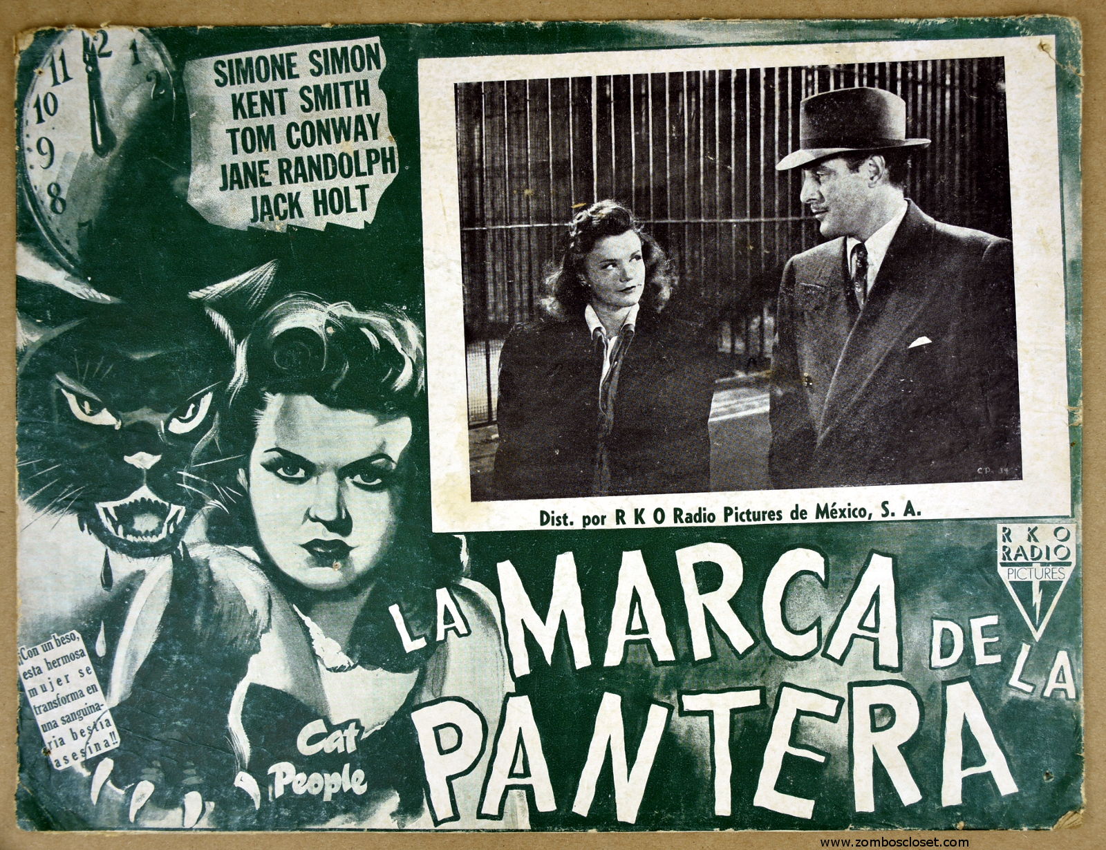 This is an unusual Mexican lobby card (at least for me) for Cat People (La Marca De La Pantera). There's no border and the paper stock is thick board. Not the type of card I am familiar with. But the green color and graphic were a no-brainer for me, so I grabbed it fast. You can view the Mexican lobby card for Curse of the Cat People here.