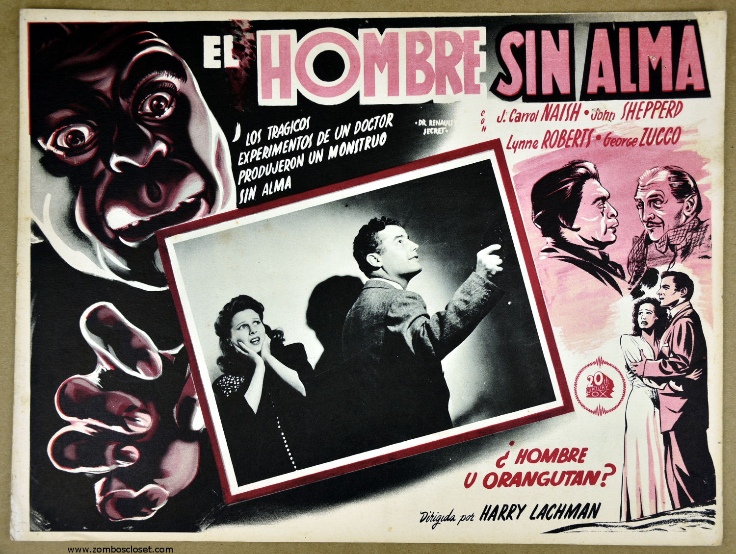 I always find it interesting to see lobby cards that stress a romantic angle for a horror movie. It seems so contrary to the selling point of the movie, which would be terror, scares, or jeers (depending on the quality). Of course, you don't see much romance at all today in horror cinema, but in the 1950s and 1960s it was either the monster wanted the girl or the hero wanted the girl, or the monster just wanted to eat both of them and be done with it. So on this Mexican lobby card for The Black Scorpion, we get a back-grounded monster and some military action, but a lot of romance up front. Go figure. On the plus side, the stop motion work was supervised by Willis O'Brien and Richard Denning is the hero. I like Richard Denning.