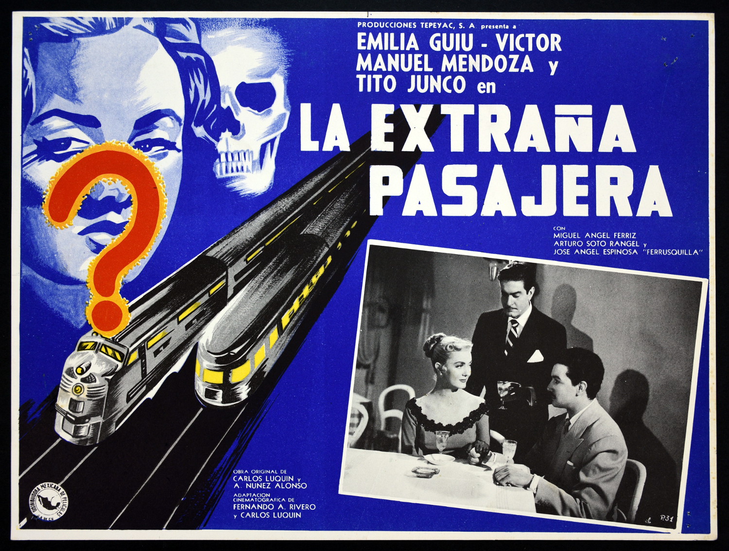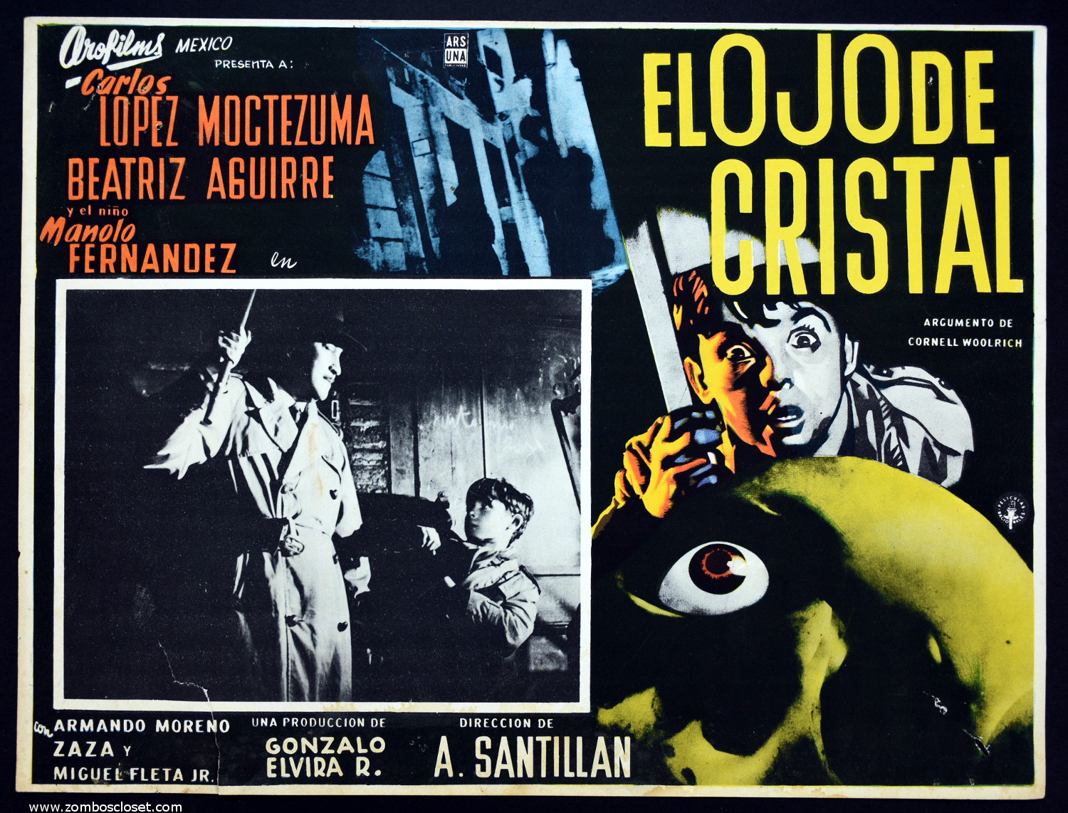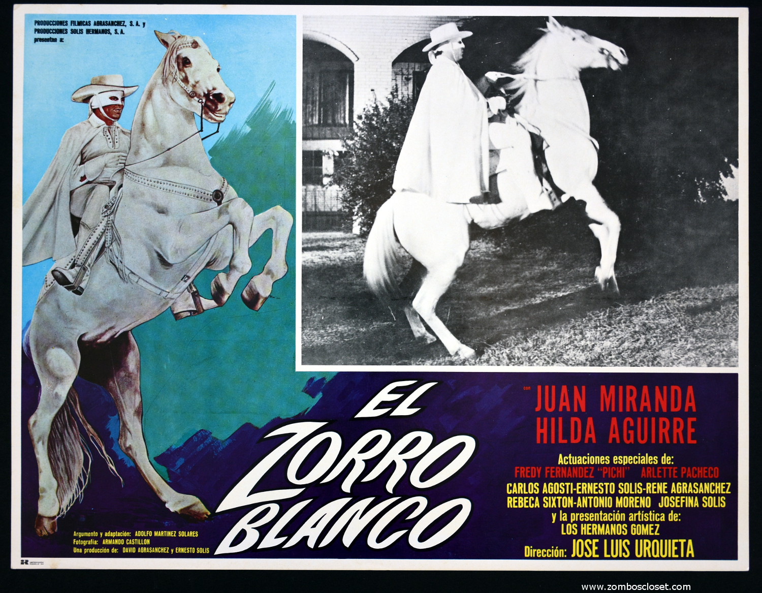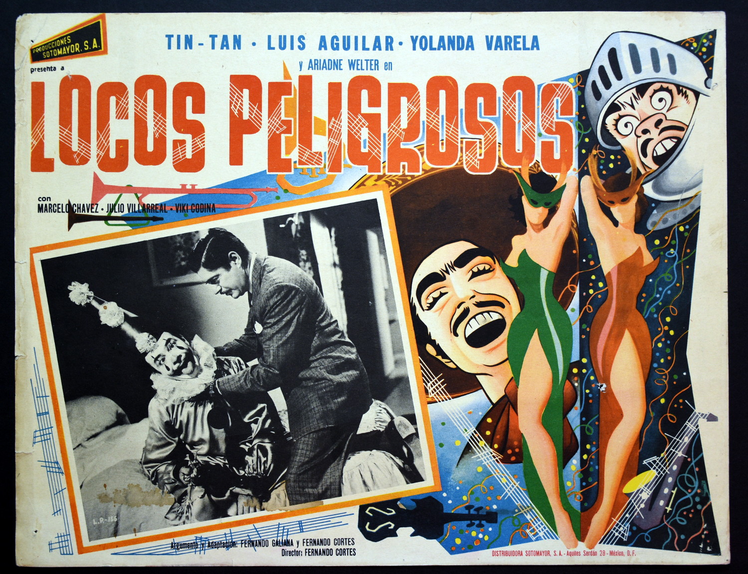 Now that's a hat. Quite a spook house set of elements is showing in this El Charro De Las Calaveras Mexican lobby card: werewolf, bat, headless person, skulls; added a bit randomly but still very effective.The whimsical nature of the headless person's posture softens the scares. This movie is featured in Mexican Monsters on the March by Something Weird Video. (Here's another version)