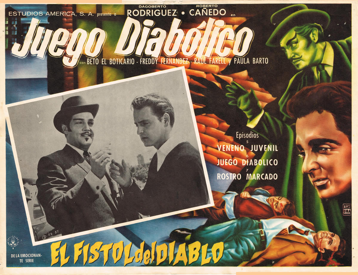 Another dynamic Mexican lobby card, this one for La Sombra Vengadora Contra La Mano Negra (1956). The plunging knife, the determined look on the masked wrestler, and the shadowy man dressed in black holding the unconscious female victim promise thrills and chills; which is backed up by the movie scene.