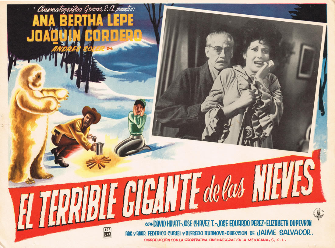 Two things I like about this Mexican lobby card for El Terrible Gigante De Las Nieves (1963): the giant is so damn furry cute I want to cuddle him, and the requisite screaming woman motif is in full force. I'll toss in a third thing for good measure: the slick, simple illustration that looks deceptively commercial artish, but really zings you with its tableau. Personally, I think the terrible giant just wanted to warm his paws over the fire, but I'll let you make the call.