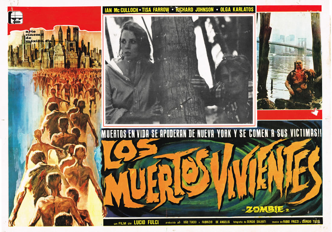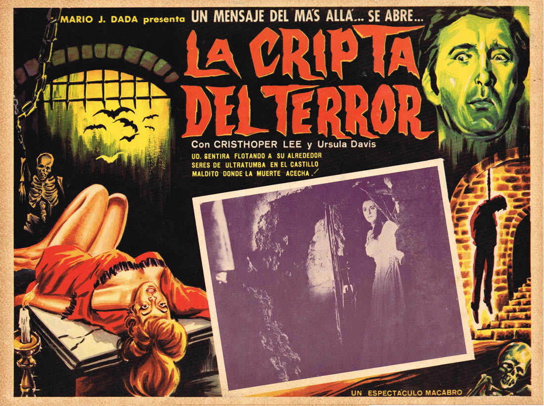 This Mexican lobby card for La Cripta Del Terror has it all: bats, skeleton, crypt, death, victim (suitably undressed), would be rescuer, moonlight, and a dollop of seedy exploitation guaranteed to bring in the audience every time. The colors are vivid, the promise of horror palpable. Oh, and having Christopher Lee in the movie doesn’t hurt, either.