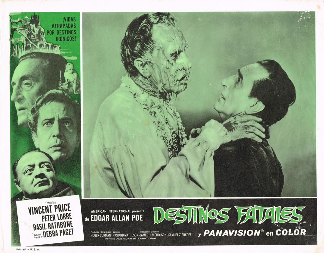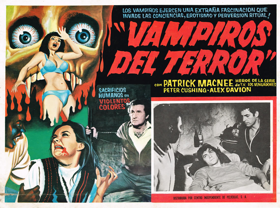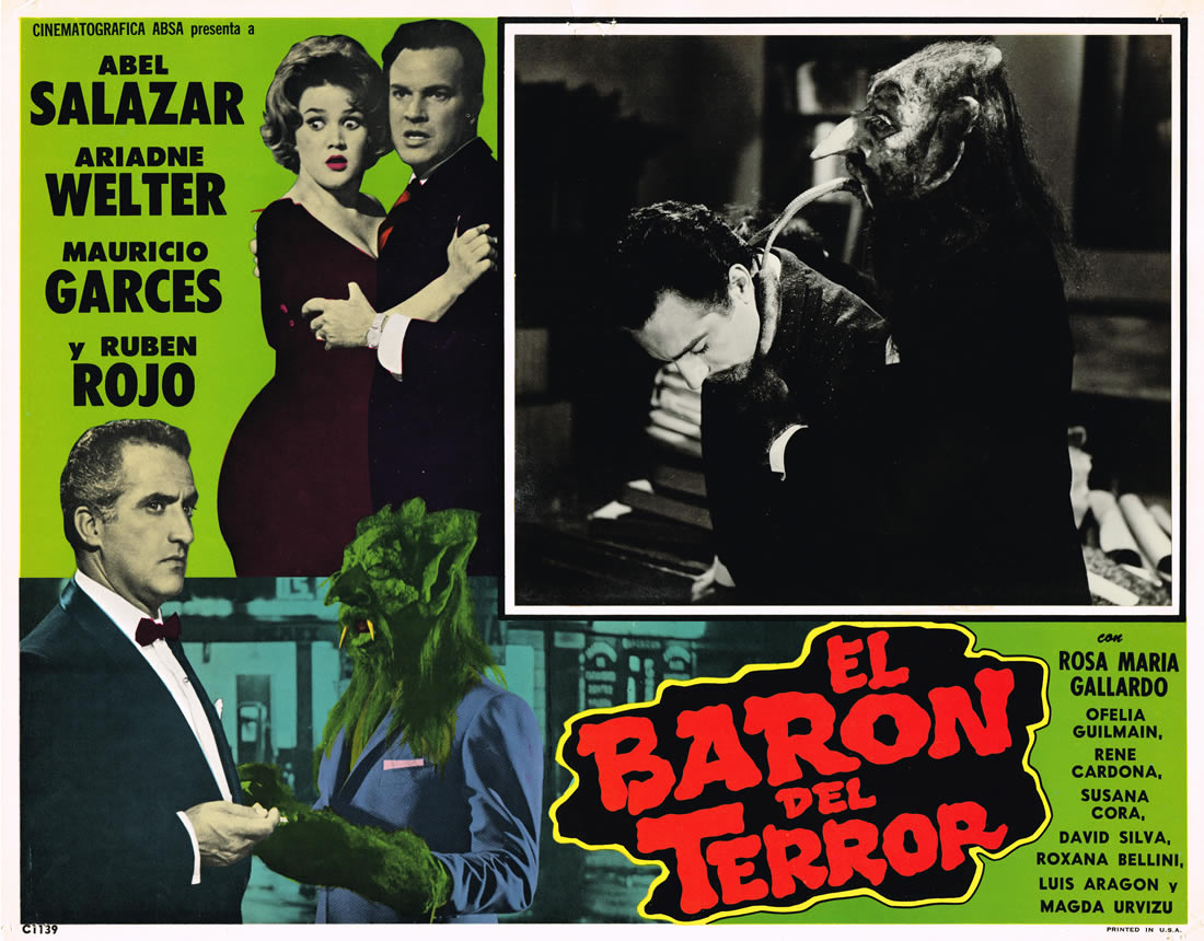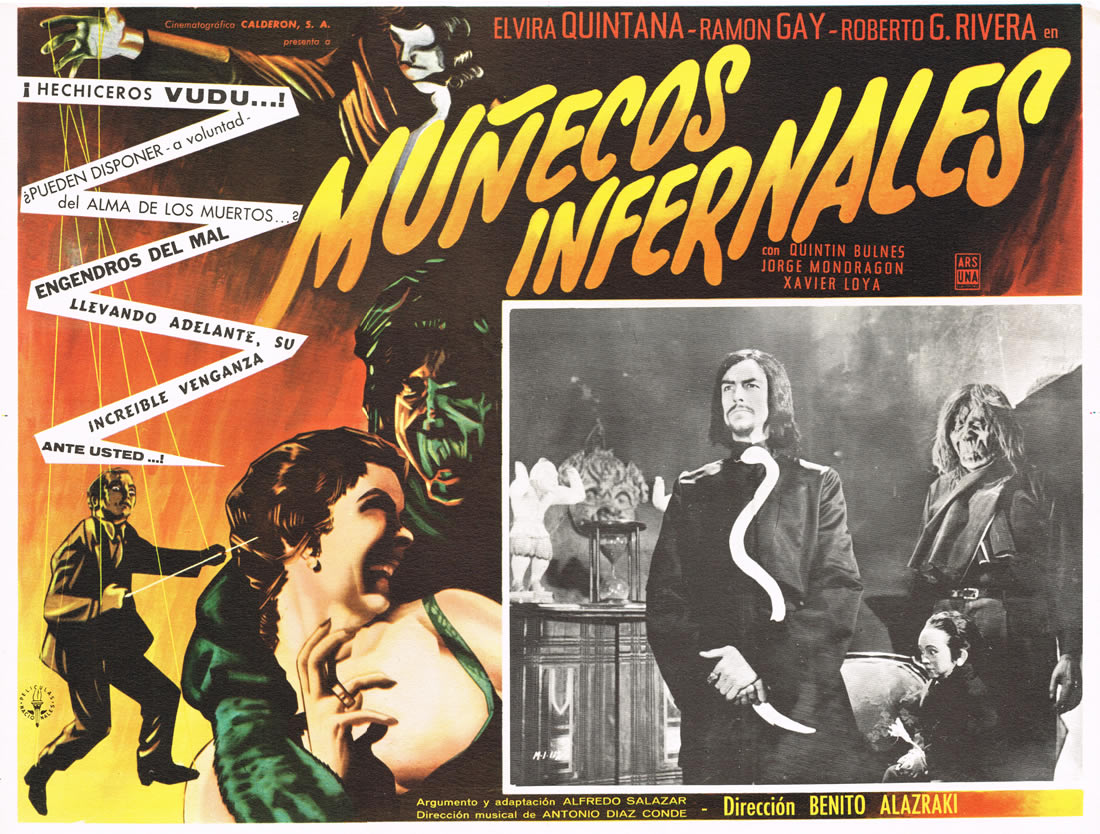 Devil Doll Men, also known as Curse of the Doll People (1961); Mirek Lipinski on his Mexican Horror Film website, Vampiros and Monstruos, sums it up best: “It is a splendid example of the outre nature of the fantastique emerging from Mexico at this time–wild and nearly ridiculous, but hypnotic and chilling at the same time.” This lobby card captures that air of fantastique and terror.