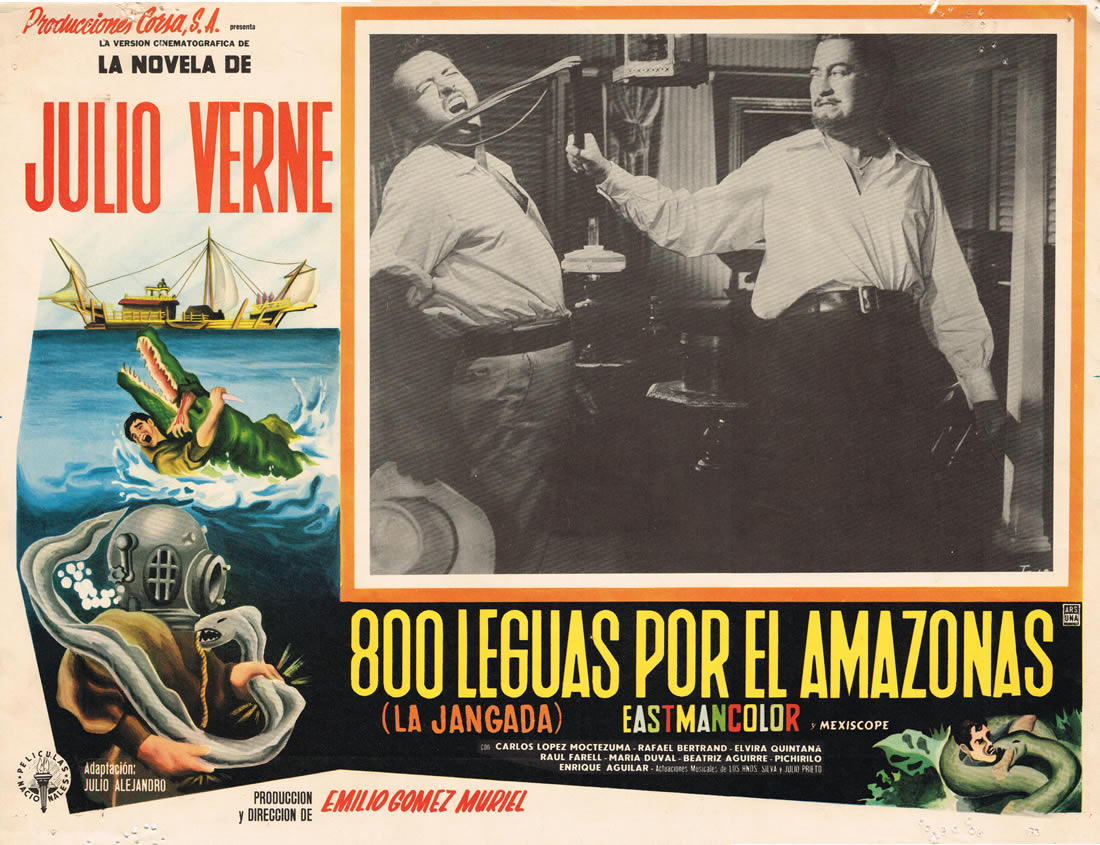 The three illustrated tableaus shown on this Mexican lobby card for 800 Leguas Por El Amazonas caught my eye; there's the crocodile-hugging man, a Diver Dan type casually holding onto the electric eel, and the poor fellow on the bottom right being hugged to death by a very large snake. Each is more cartoony than dramatic, but the style is noteworthy because it makes me want to see this adventure movie.