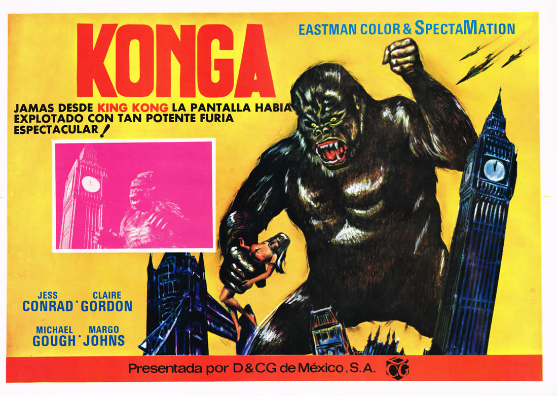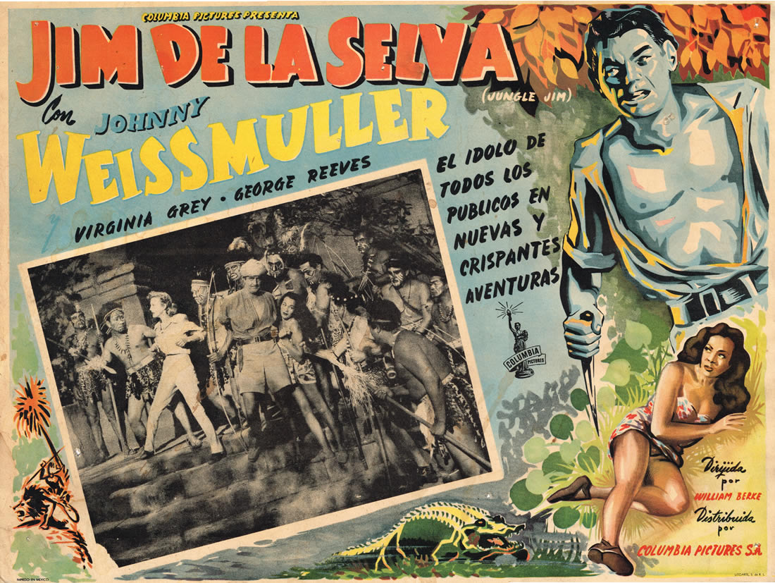 Tarzan and Jungle Jim were viewing staples for me every Sunday when they aired on the local New York City television channels. This Mexican lobby card for Jungle Jim exudes action, danger, romance, and manliness (an open shirt will do it every time). The colors and illustration style lead me to believe this card is not based on American poster art.