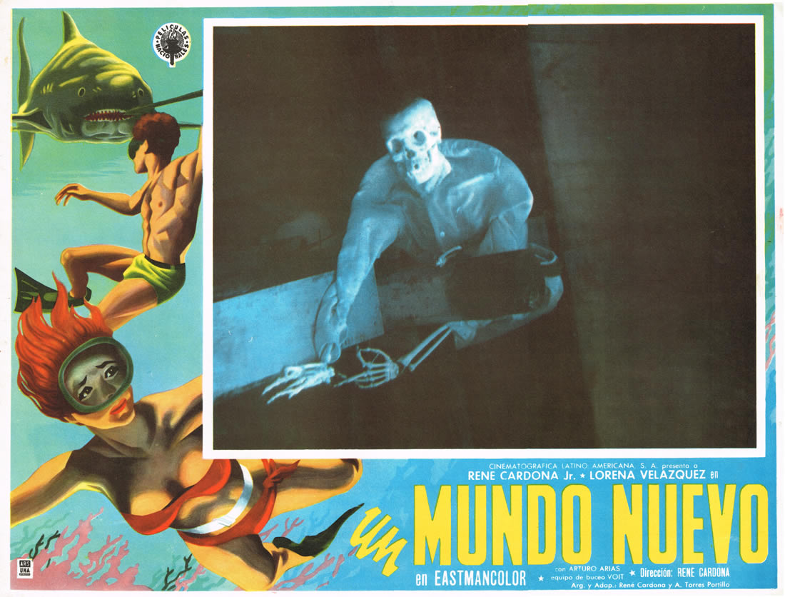 Sophisticated illustration combines with an eerie scene to make this Un Mundo Nuevo (1957) lobby card a stunning example of skillful movie promotion: reading counter-clockwise from the skull, the use of blue as it bleeds into the blue-tinted skeleton implies these people are swimming toward death. (Note: due to a scanning error, the photo’s border appears slightly broken at the top (to the right of center. I’ll try and correct this in the future).