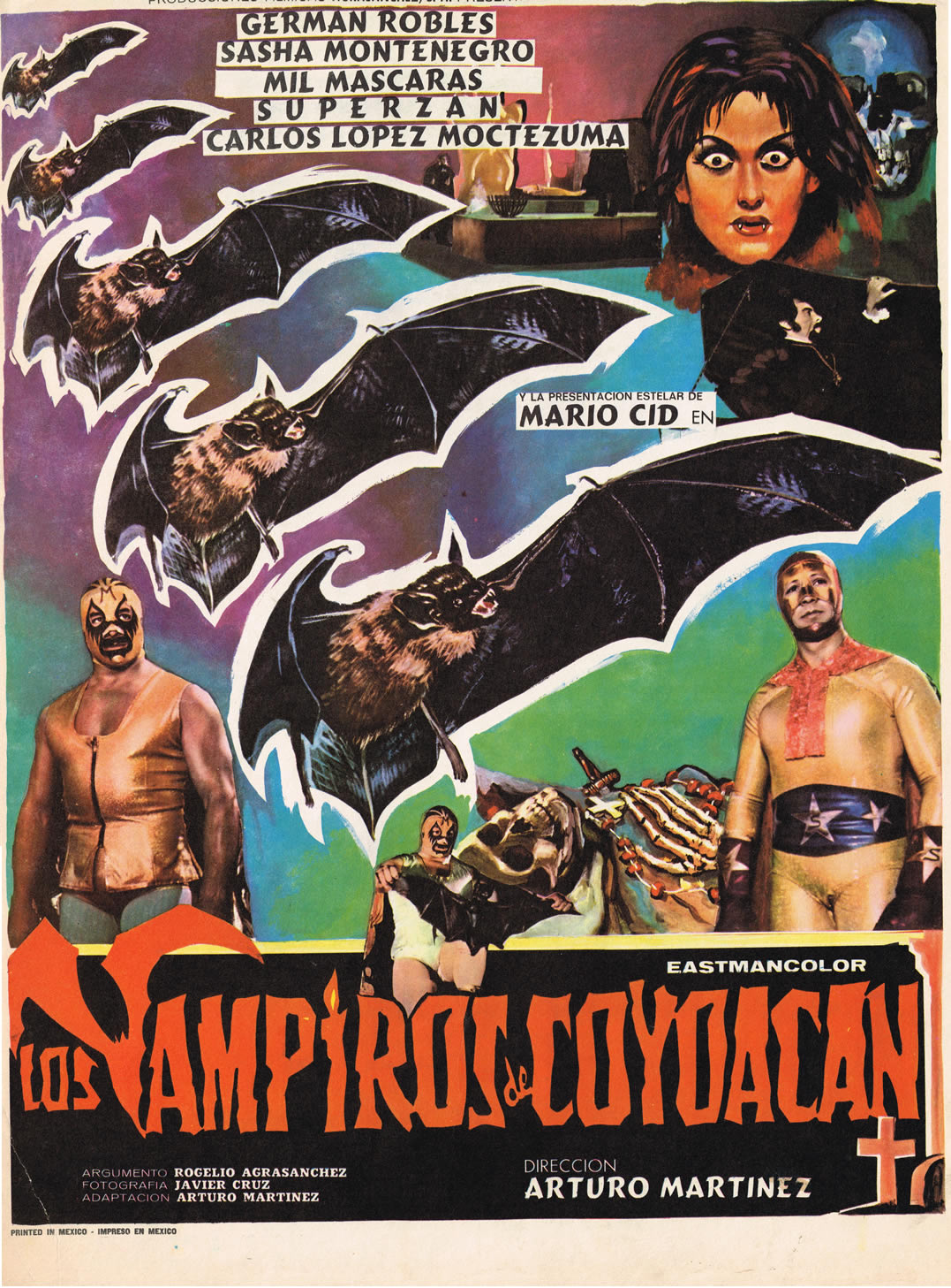 This crude, paste-up hodgepodge has its charms: the glaring vampire and skull faces, the positions of the masked wrestlers looking toward those faces, the repetition of the flying bat between them, and the skeleton holding onto a cross and rosary. Hammer Horror used Eastman Color for its vivid reds, so while I’ve not seen this movie, I wonder if the production team here was thinking the same thing?