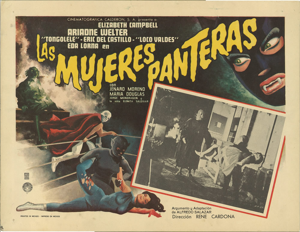 The inimitable German Robles and a colorful, sophisticated illustration provide the menace in another beautiful example of Mexican lobby card movie promotion.