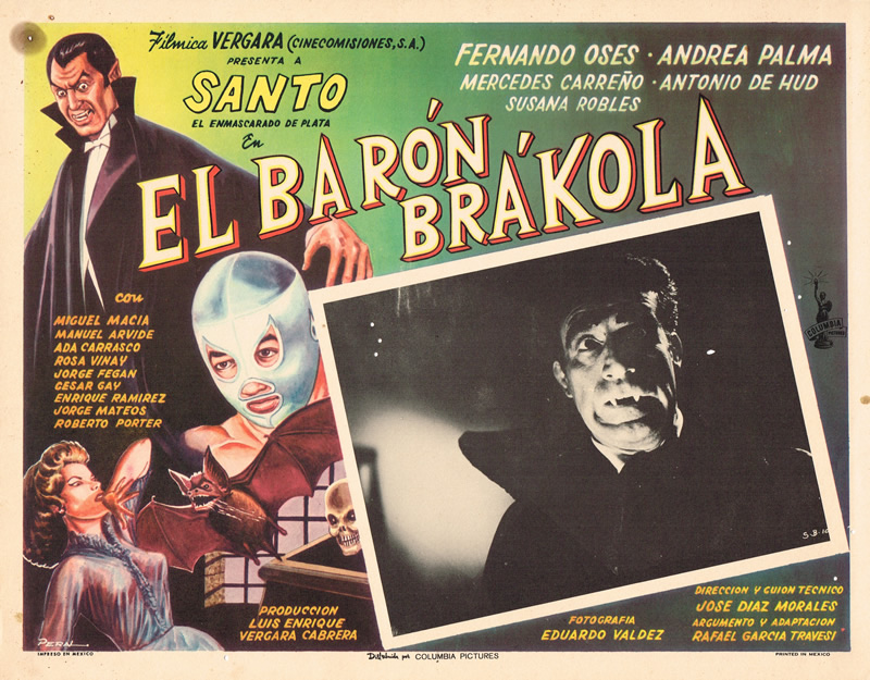 Beautifully balanced layout from left to right, effective choice of colors, and a weird, almost comical, vampire bat with human head make this lobby card visually appealing. And, of course, the sinister abode to complete the terror looms in the bottom right corner.