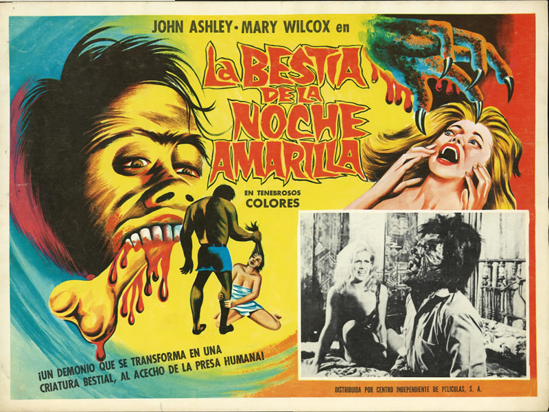 I don't know, but this lobby card seems too low key. What do you think? “La Bestia de La Noche Amarilla” is a great example of how bold a Mexican lobby card can be. The common element here, of domination over a provocatively dressed female victim, is highlighted by each illustration: the monster’s blood-dripping, bone-chewing mouth looming over her; the monster’s beastly hand reaching for yet another screaming female victim; the monster standing over a victim. The illustrations don’t connect visually except for themes of brutal dominance and helplessness. This movie is a Phillipino/U.S. production.