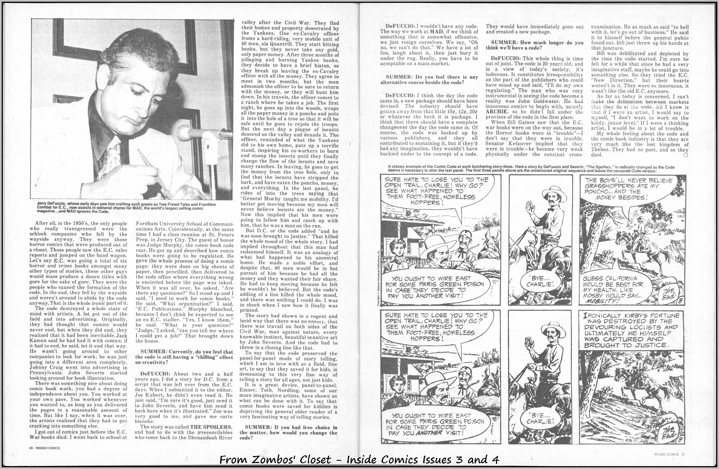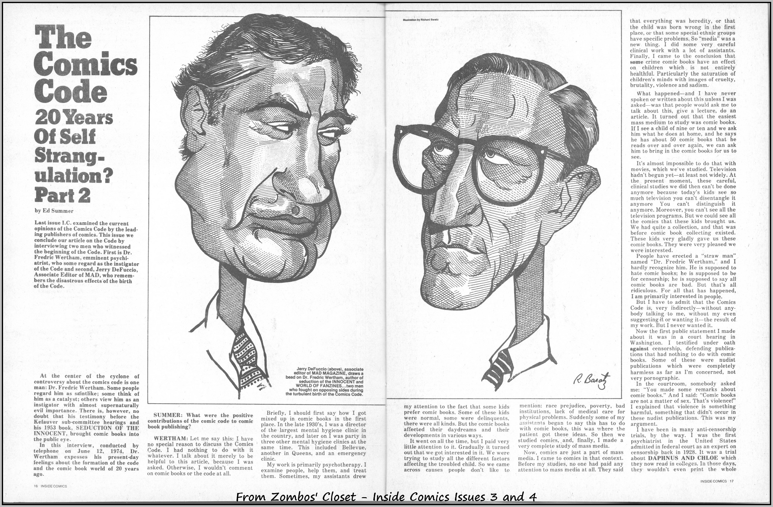 Here’s an interesting read for you older comic book geeks (like me) who remember the days of the comics’ code and its impact on both the comic and magazine racks. This article is taken from Inside Comics, issues 3 and 4, 1974. For you newbies, the Comics Code Authority (CCA) was formed in 1954 as a voluntary alternative to government regulation of the content in comics. It followed after a “moral panic” arose over the graphic violence, sexuality, gruesome horrors, and the supposed effect on juvenile delinquency, that comics packed in every issue. Said panic was promoted by one Fredrik Wertham, a psychiatrist, who wrote a book called Seduction of the Innocent. While he came to be reviled by comic book fans, it should be said that he was a progressive shrink who treated poor black patients at his Lafargue Clinic (from Wikipedia), and “his institutional stressor findings were cited when courts overturned multiple segregation statutes, most notably in Brown v. Board of Education.” So he wasn’t all that bad, just misguided about comics.