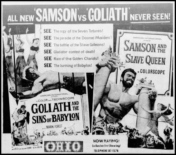 So, from early Spring, 1964, listen as Paul Frees tells us about the American International combo Goliath and the Sins of Babylon, with Mark Forest, and Samson and the Slave Queen, with Alan Steel. Thank you, Cousin Estil, for having the foresight to save this and the others for me to share on my site all these years later. Rest In Peace, and may “the hits just keep on comin.”