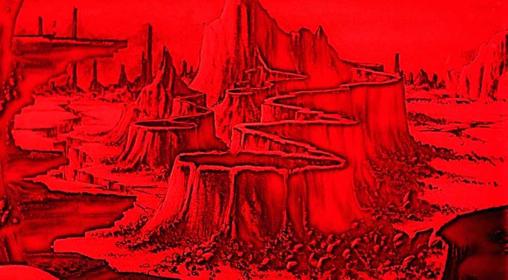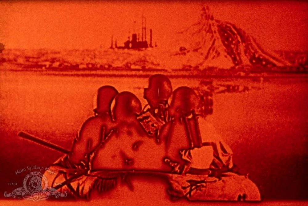 Ah, Cinemagic, a process discovered quite by accident. When it was decided to change filming from color to black and white to save money, a reel that was shot was accidentally mis-developed, either by an errant exposure to light or through a chemical mix-up. When viewed, the negative film took on a solarised effect where parts were in the negative and parts were positive. Shadows became white, and various elements shifted and glowed. The look appealed to producer Norman Maurer (The Three Stooges’ Moe Howard’s son-in-law) and director Melchior, and they decided it gave the perfect look to scenes shot on Mars, especially if the film were dyed red. It also would help disguise the cheaply-made studio sets. So, it was decided to shoot the non-Martian scenes in color and intercut the two.