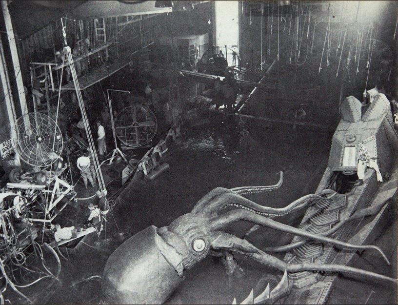How the squid fight was done! Using newly-built Stage Three, technicians built a full-size replica of part of the Nautilus and a giant squid, operated by hydraulics, overhead wires and compressed and vacuumed air in the tentacles. Wind machines, wave makers, water cannons and dump tanks rented from MGM Studios supplied the storm effects. The actors were really fighting against the elements!
