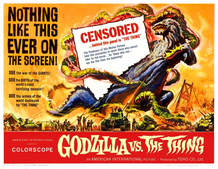 Done! And with that, he left. I was thrilled, but I had work to do. My five-part series had now turned into a six-part series and there was a new Part Five to write. Godzilla vs The Thing! Ahh, what was “The Thing”? The one-sheet poster had a giant question mark with Godzilla, and the half-sheet depicted a tentacled beast which was censored in its entirety, being too horrible to see. What was it? The scary, horrible monster turned out to be….Mothra! What? Cute little (big) Mothra? Hmmm. Okay, it was a reworking of Toho’s Mothra vs Godzilla, but the gang at American International Pictures decided to take a different approach in their marketing campaign and played up the “what is it?” angle. But no matter: It was a fun movie with the usual good effects.