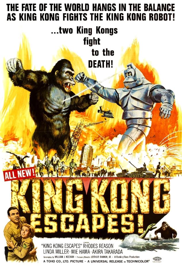 King Kong Escapes was equally fun with Haruo Nakajima portraying King Kong and Hiroshi Sekita playing Mechani-Kong and Gorosaurus. There are many similarities to the original King Kong (1933), and the effects and battles are especially good. The new King Kong suit was an improvement over the one used in King Kong vs Godzilla.
