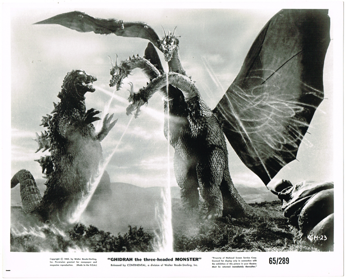 What a collection! The monsters featured include Godzilla, Anguirus, Rodan, Manda, Kumonga, Varan, Baragon, King Ghidorah, Minilla, Mothra, and Gorosaurus. The final battle of the good-guy monsters against King Ghidorah set at the base of Mount Fuji tasked the costumed performers and the wire-specialists to the hilt. It was spectacular and every monsterkid’s dream.