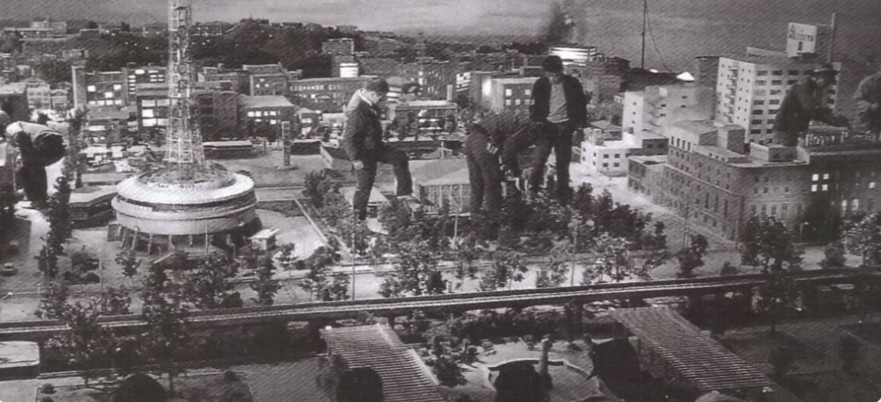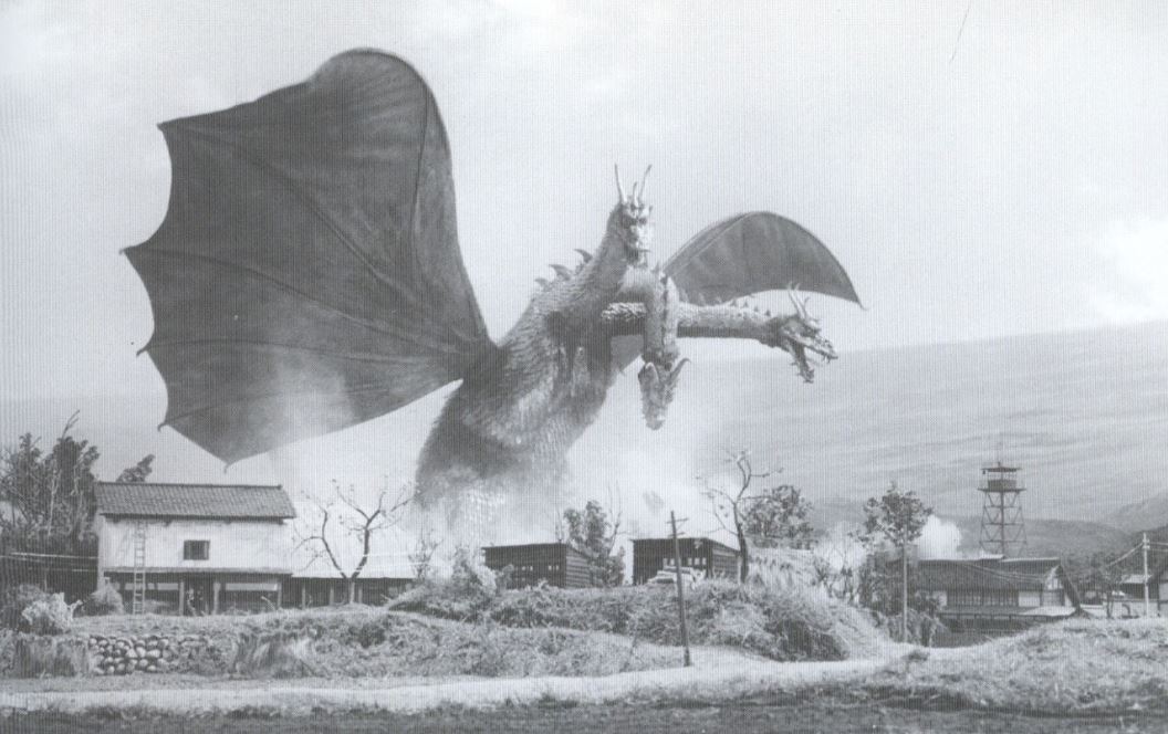 Crane apparatus allowing Ghidrah to fly.The elaborate, detailed miniature set constructed by Toho Technicians that will soon be destroyed by Ghidrah.The monsters attack! Godzilla, Rodan and Mothra battle Ghidrah.Shoichi Hirose inside the impressive Ghidrah costume.