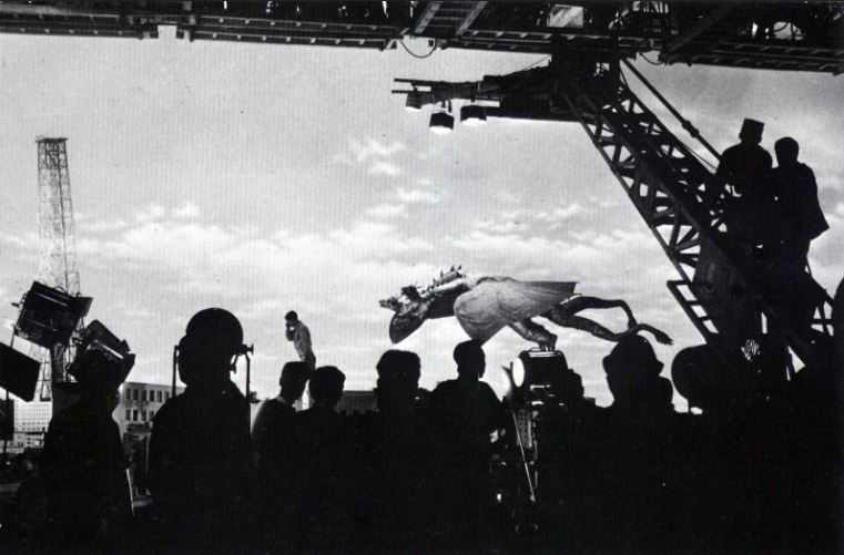 Technicians make some final adjustments before filming a scene with the giant Rodan prop.