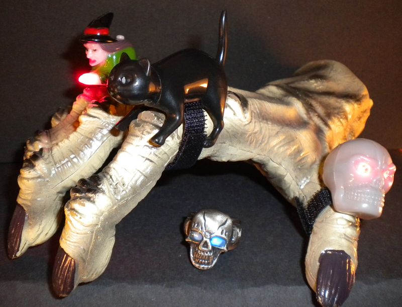 What every fashionable ghoul like you needs to wear on Halloween night: flashing ring light-ups adorning your claws. The witch, skull, and cat are made by Illuminix. They can either blink slow, or fast, or you can leave the red light on. I don't recall who makes the metal skull ring in the middle, but you twist the skull a little to turn on his eyes, which change colors as they blink. The witch has all the right colors and demeanor to be Halloween-witchy, but the black cat is my favorite. His eyes glow red (but the battery's too weak to show it in the photo).