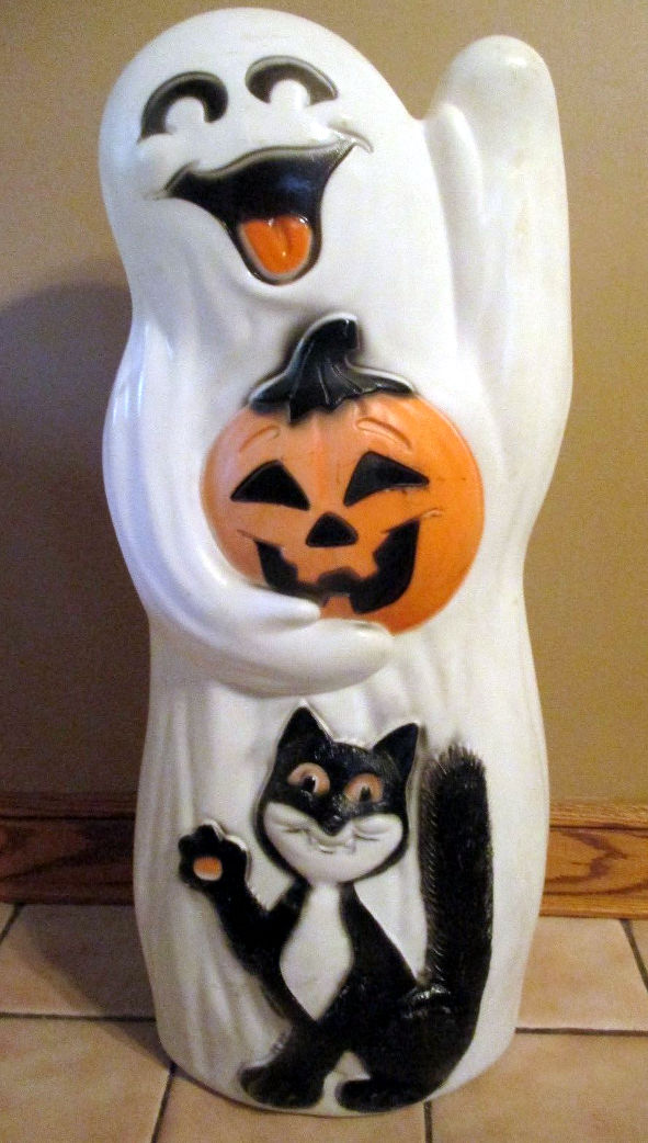 I picked this Halloween Totem Pole up at a local old-fashioned hardware store last week. It was out front with the shiny garbage cans, new rakes, clean brooms, and other summer to fall utensils, along with a pumpkin-holding ghost and a somber witch. This one appealed to me most because it has the essential elements for a super Halloween: pumpkin, skull, black cat, and ghost. It's 32 inches high and a small light brightens up the skull for foggy Autumn evenings. Genfoam Plastics in Virginia makes this one, along with other Halloween blow molds including a modish Frankie and Dracula.