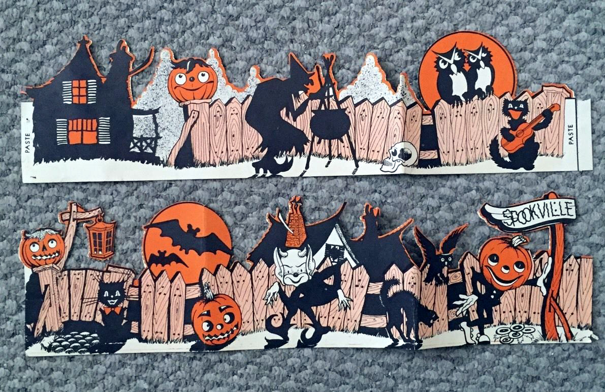 This is a simple Halloween witch with honeycomb cauldron from Paper Art. While you could tape it to a wall and show one side, it's really meant to be hung so both sides of the honeycomb cauldron, and witch, can be seen. The style is neither here nor there, and seems about right for a 1970s to 1980s approach to Halloween decorations: more child friendly and cheaply printed.