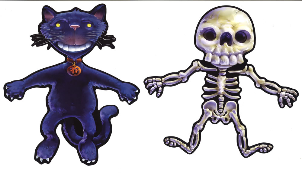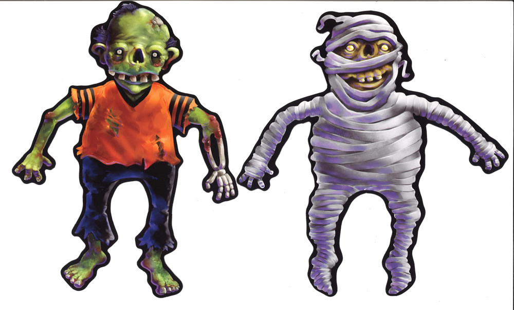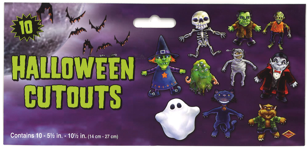 I found these newer Beistle monster designs in my local discount store. They tip toward cutesy, but each illustration shows style. Strangely, the Frankenstein Monster is smaller than Dracula, and the Witch is the largest cutout. Date on the label says 2012, but the backside of the label is for a different decoration than these cutouts. It reads No. 01022, Glittered Happy Halloween Streamer. The number for these cutouts is 01630.