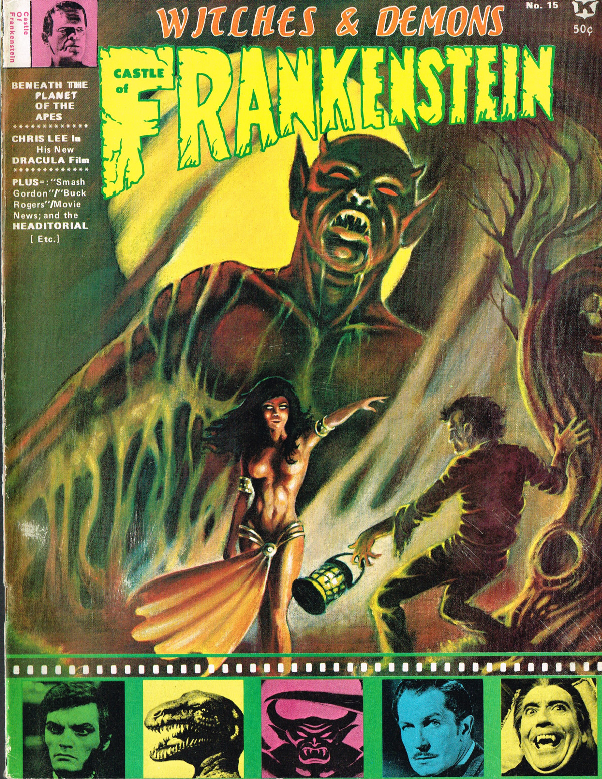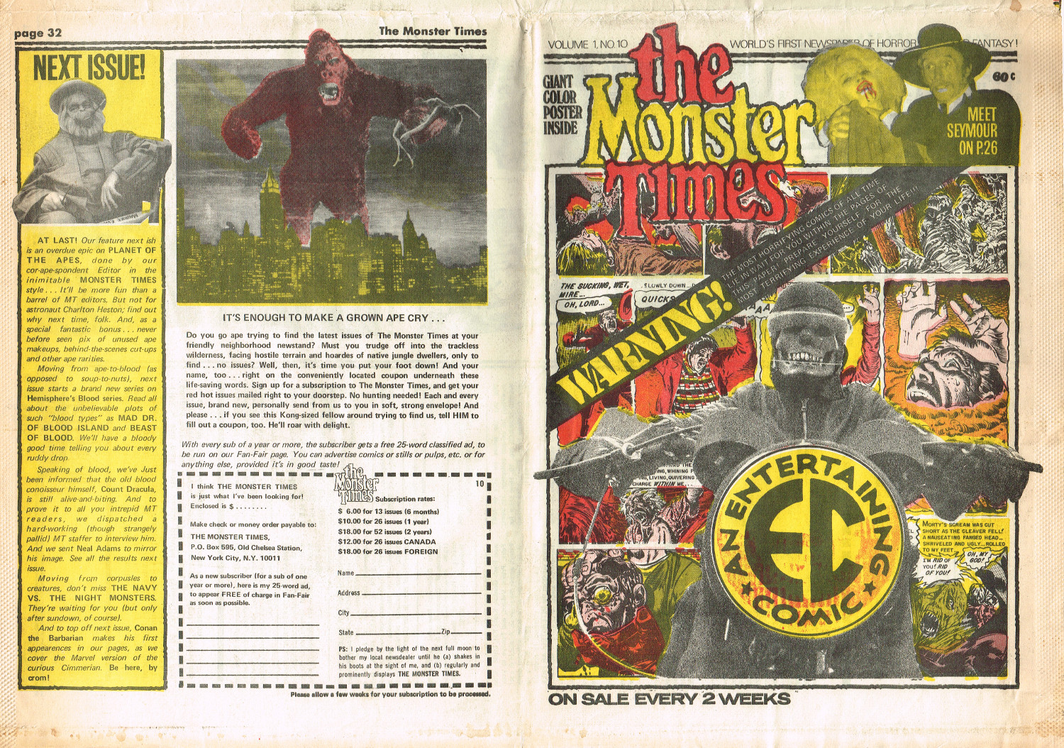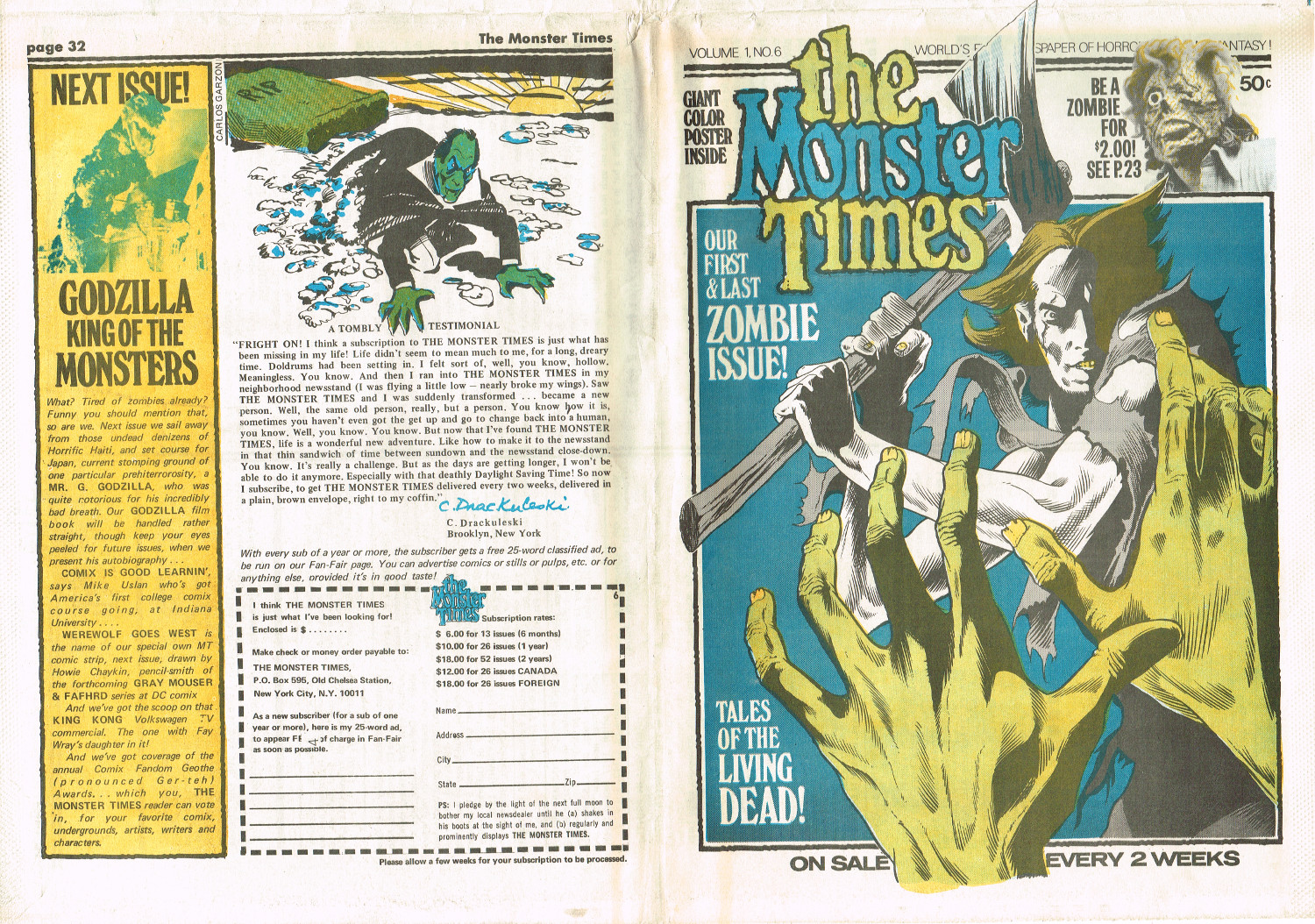 Jumping ahead this time to issue 24 of The Monster Times. Of course publishing is no longer bi-weekly but monthly, and the cover price is now 60 cents. Steranko's History of the Comics Volume Two is reviewed, Rodan spreads his wings, and monster towels clean up for $1.50 each. Caesar takes a stand with the Battle for the Planet of the Apes and the plot sickens in Blood Feast with a "bad movie roasting." Of particular note (aside from the cool monster towels, that is) are coverage of Basil Wolverton's weird-tastic art, the nifty Create Your Own Monster Kits ad on page 31, and Lon Chaney Jr's life and times howls. (Read issue 24 of The Monster Times)