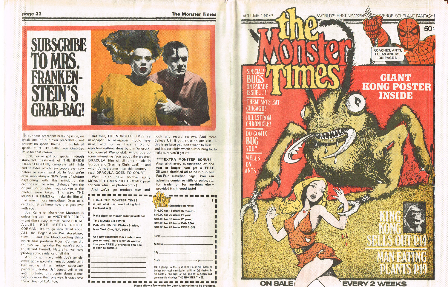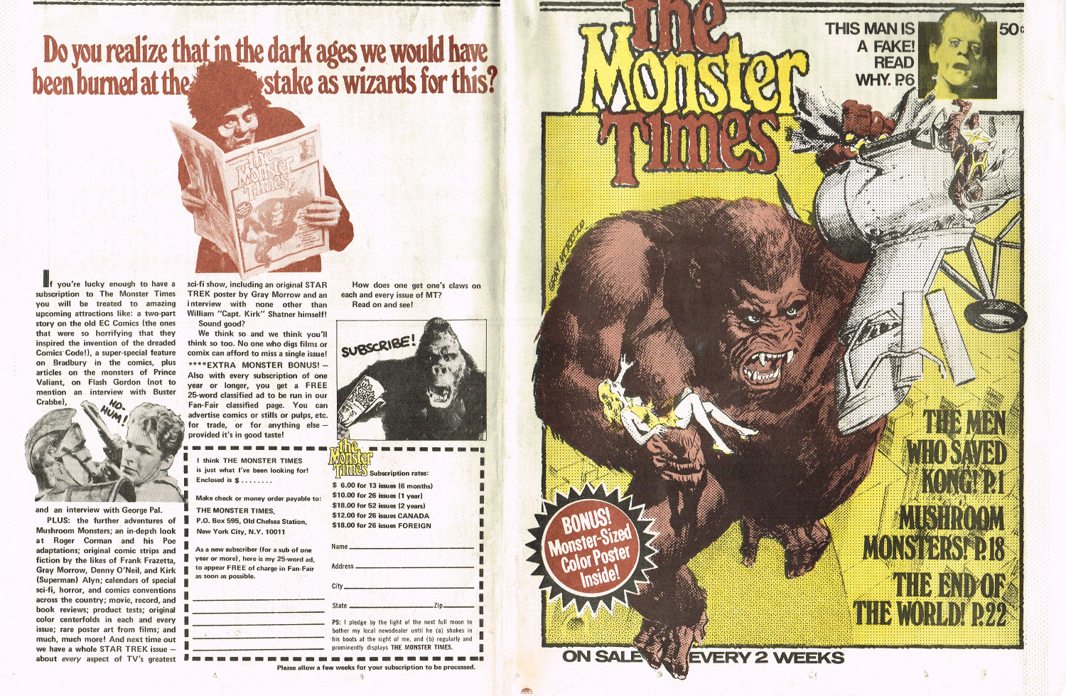 The shift from the mostly monster photos and gags-filled magazine format to a more genre-diverse and informative coverage was inevitable and hit a high mark with The Monster Times. I discovered and rediscovered TMT when it originally launched in 1972, and again in 1981 when I began working at the Magic Towne House in New York City. I manned the small magic shop during the weekdays and did the kids magic shows on the weekends. I fondly remember using an Osborne 1 computer while working there, my first taste of computing. One day I was asked to ship hundreds of copies of The Monster Times, various issues, to the same address. I don't recall why. I paused now and then to peruse the issues I was stuffing into the shipping boxes and became a fan all over again. I wonder what happened to all those copies I shipped?
