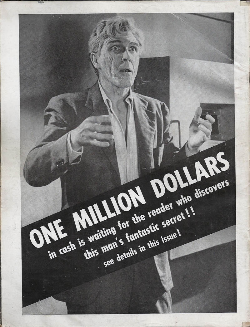 More promotional Famous Monsters of Filmland back covers from Professor Kinema. I seriously doubt any reader wound up with one million dollars, fantastic secret or not, but I'll bet lots of kids spent the money in their imagination while trying to win it. I met Robert Lansing (4D Man) and sold an accounting program to him way back in the 1980s, while I was working at B. Dalton's Software Etc. store on 5th Avenue in New York City. He was shorter than I imagined.