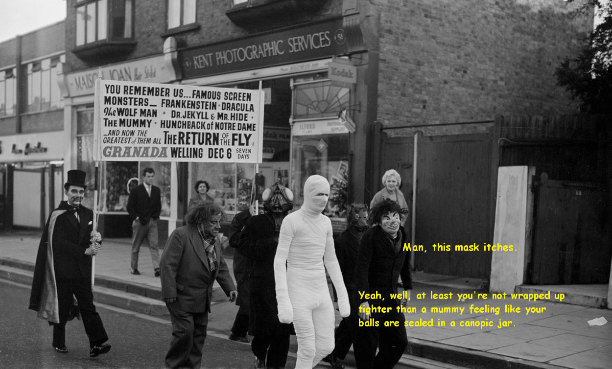 Here's a great test of whether you're a true horror fan or not: which part of this picture did you focus on first? You'll need to add your own caption for this one. I'm stymied between soap on a rope and clean mind gags. (Kim Parker in a publicity still for Fiend Without a Face)