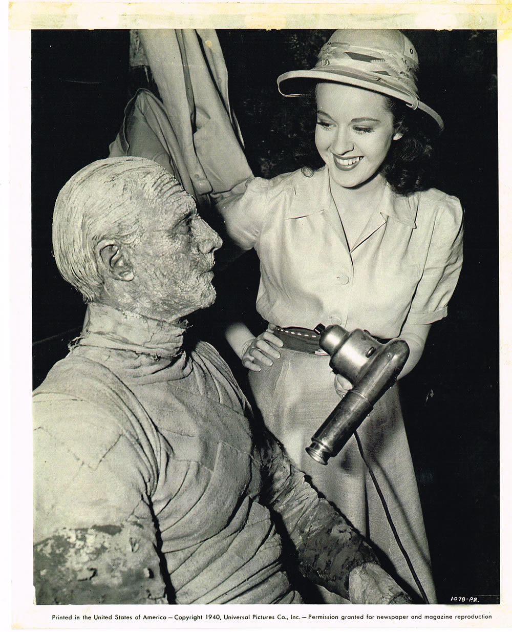 “Peggy Moran assists her screen nemesis, Tom Tyler, with his make-up by holding a hand dryer over the coat of paint applied to his mummy wrappings. Miss Moran has the [femine] lead and Tyler plays a 3000-year-old mummy in Universal’s horror drama, “The Mummy’s Hand.” “– (1078-P. 2 accompanying press photo information)