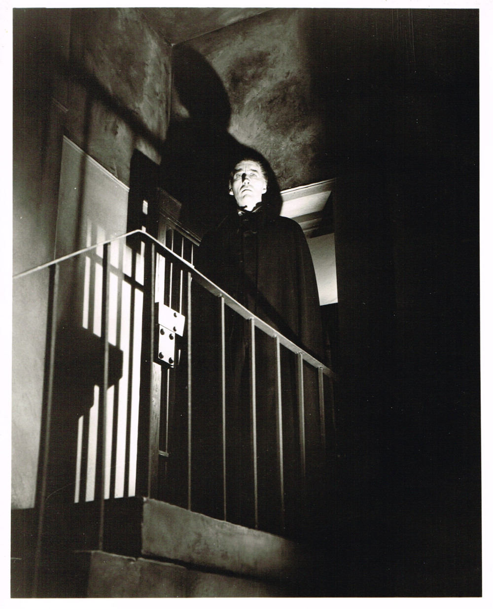 "This is such an iconic horror image it's easy to forget that scene doesn't actually appear in the final release print of Universal's 1931 horror classic DRACULA. Short scene of Renfield (Dwight Frye) pledging his fealty to Dracula (Bela Lugosi) appears in the shooting script, was recorded as filmed (by the numbered scene still), but was cut from the release print for unknown reasons. The footage itself has been lost, and this photo is all that remains. Item is an older print (from the 1970s) on 8×10 glossy fiber stock, bordered, in pristine condition (has been carefully stored for the last twenty years). Custom darkroom print with unusually nice gray scale–the folds of Dracula's cape, for instance, are sharply visible. No marks, crimps, pinholes. or damage of any kind. A few very small spots in background are negative artifacts, not a flaw of the print. From the personal research collection of David J. Skal, author of HOLLYWOOD GOTHIC and THE MONSTER SHOW."