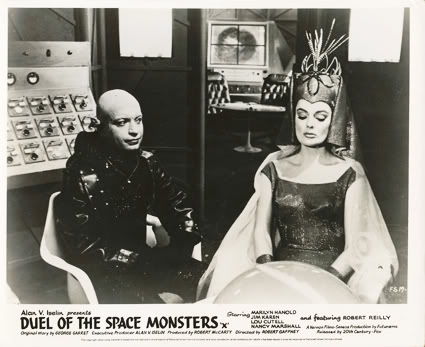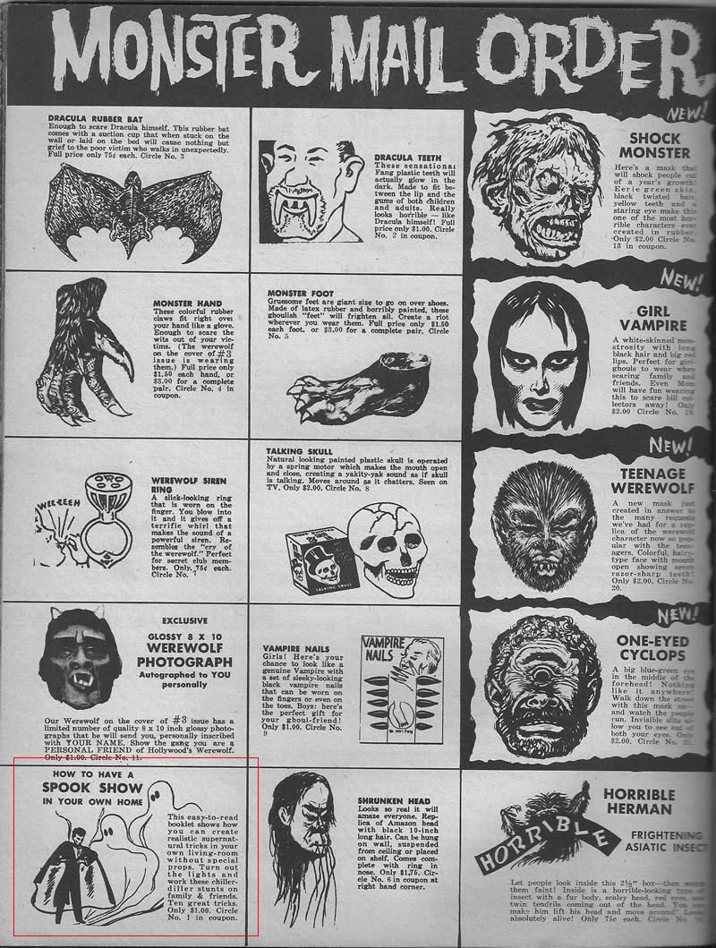 Prior nods to the not-the-greatest horror and sci-fi films had been in the pages of FMoF and another Ackerman-edited magazine running concurrently, Spacemen. The premier issue of FMoF (1958) in the Out of This World Monsters article featured a still of the Ro-man with the caption "Robot Monster, the film so horrible it was not released, it escaped." One could easily ascertain the usage of the word "horrible" was used here not to mean anything horror-filled, but rather to imply a bad quality. The premier issue of Spacemen (July 1961) ran a full page photo of the aliens from Invasion of the Saucermen with the less-than-complimentary comments of them resembling "cabbage heads" and "heads that resemble meatballs with spaghetti" in the Orbituary Department. Issue #3 (April, 1962) contained a request from readers (one cheekily named 'Hans Orlac'), also in the Orbituary Department, to see a photo of "those unbelievably ridiculous popeyed planetmen from Killers From Space."