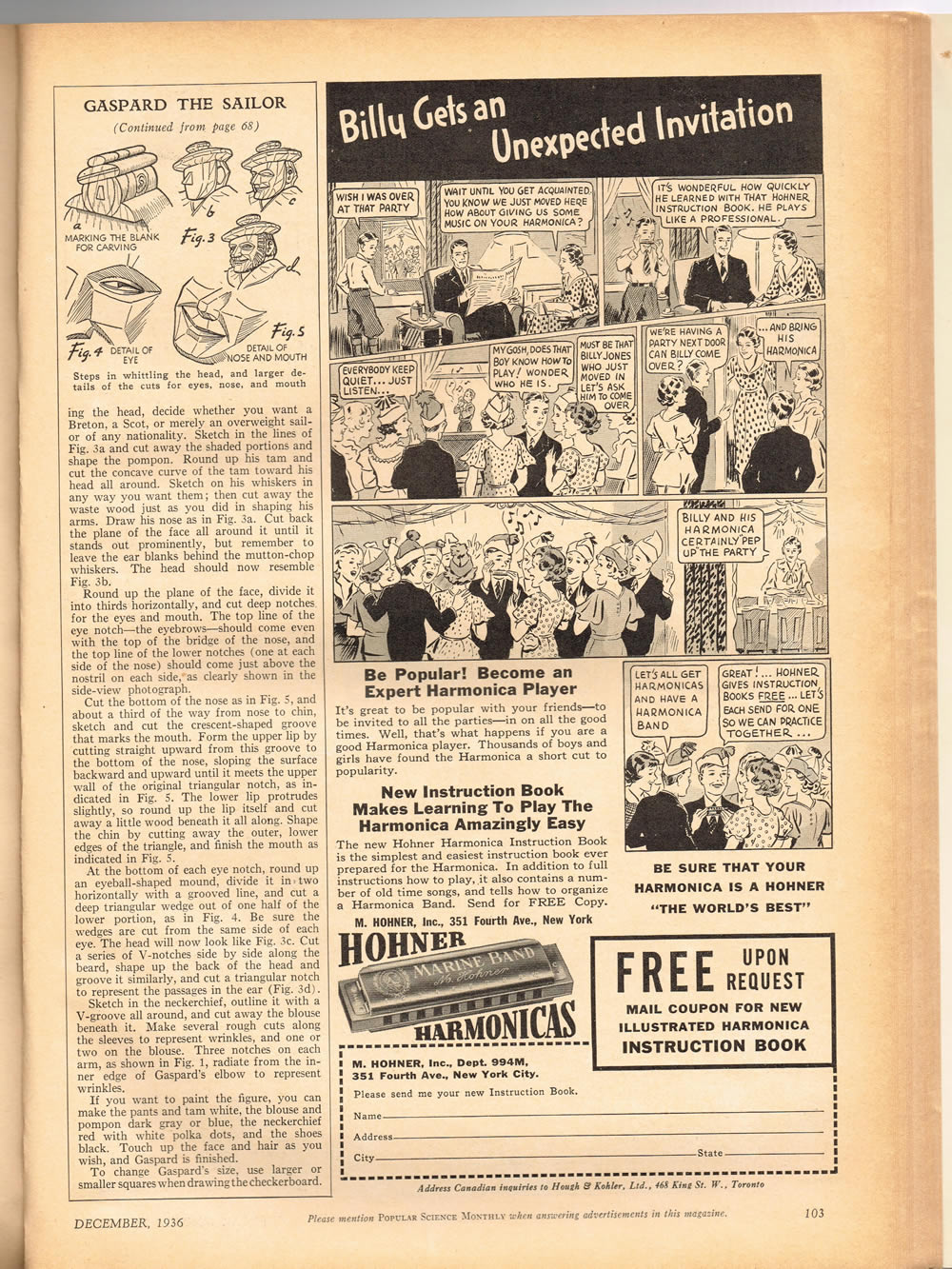 No one inviting you to their parties? Then here you go. Of course, any party patrons that can hear you playing in your home from across the street may not be as lively as you'd like. As a backup plan, just in case no one continues to invite you to their parties even after all that Harmonica practice, I suggest you take up whittling Gaspard the Sailor, too. It will help make all that idle time pass quickly. (Hohner Harmonicas Ad from Popular Science, December, 1936)