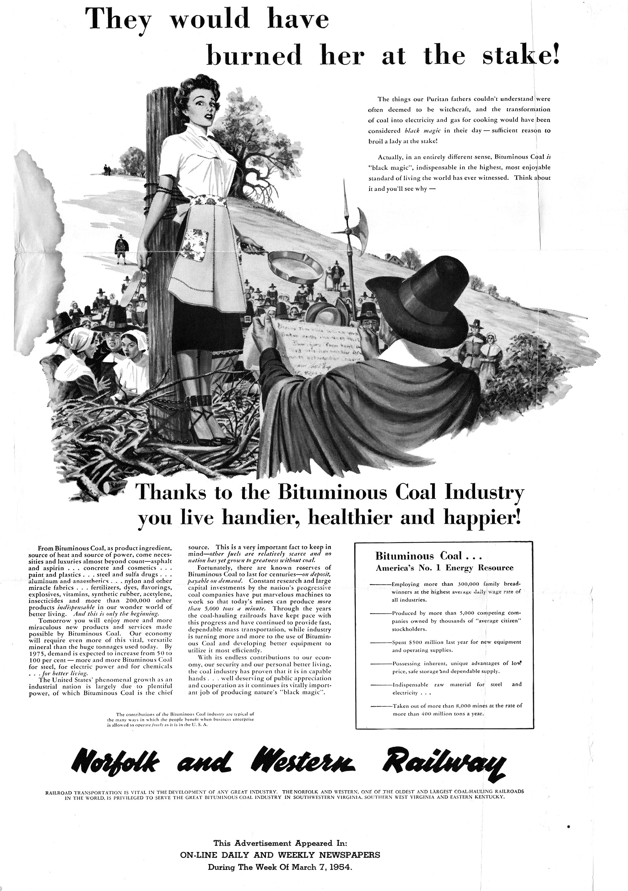 Those were the days, weren't they? Now we're all kind of being burnt at the stake because of our use of coal, oil, and all that burning stuff that did make us 'handier' and 'happier' for a long time. 'Healthier' is debatable, though, at least now. Of course, hindsight is always perfect. What's intriguing in this advertisement for the bituminous coal industry are the use of the stereotypical 1950s housewife taking some serious umbrage from the Puritans, and the small-print patriotic blurb that reads "The contributions of the Bituminous Coal Industry are typical of the many ways in which the people benefit when business enterprise is allowed to operate freely as it is in the U.S.A." My impression is said industry was getting some flack even then for their practices, and we all know how unregulated enterprise doesn't always benefit the people. But the 1950s was a great time to be naive, so we may find amusement in this kind of advertising now, but don't kid yourself: we're all still pretty naive.