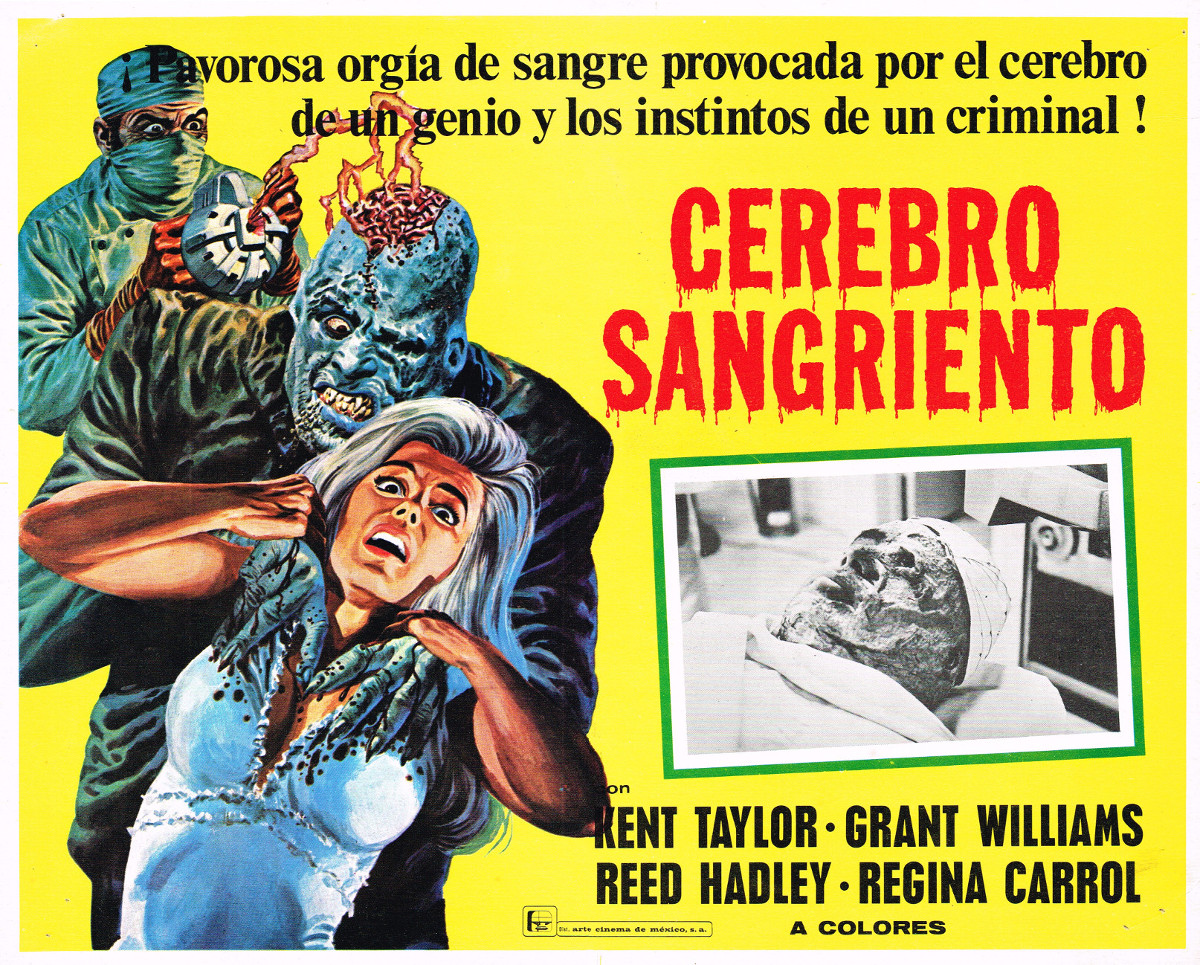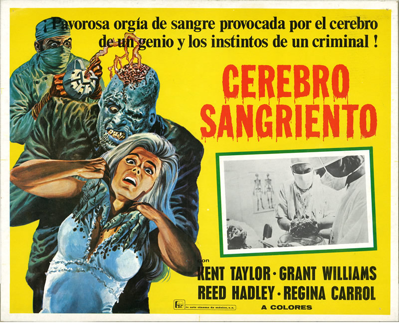 The determination on the doctor’s face, the weird device he’s holding shooting out an energy beam, the savage determination on the ghoul’s face, and its strategic grappling around a bosomy chest; what more can you ask for in a lurid Mexican lobby card for Brain of Blood?