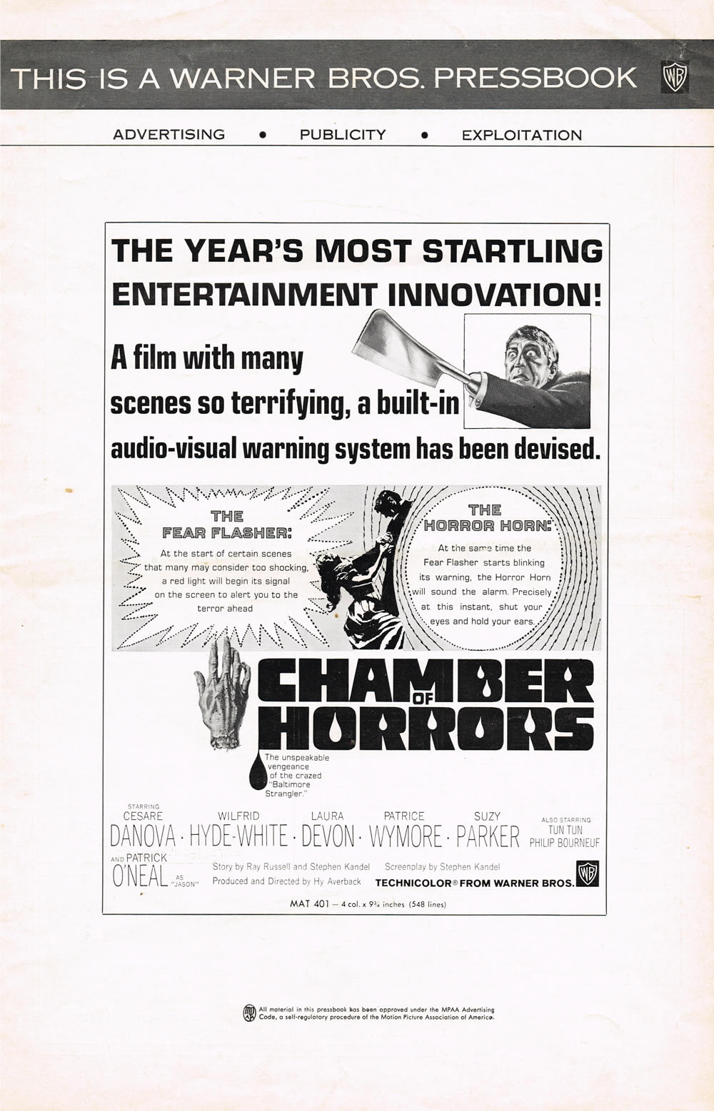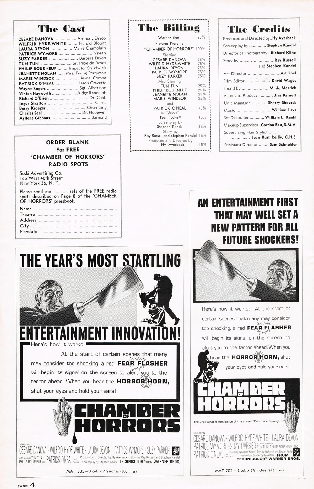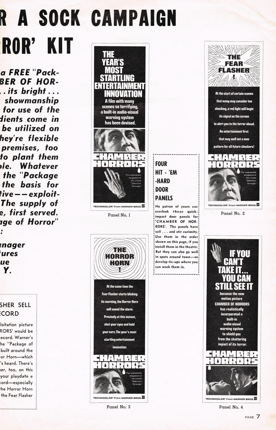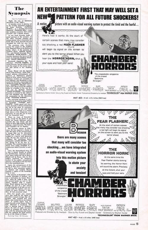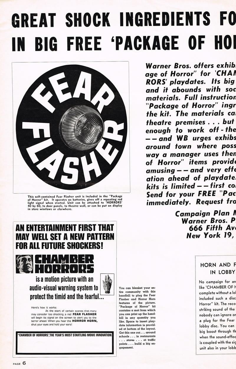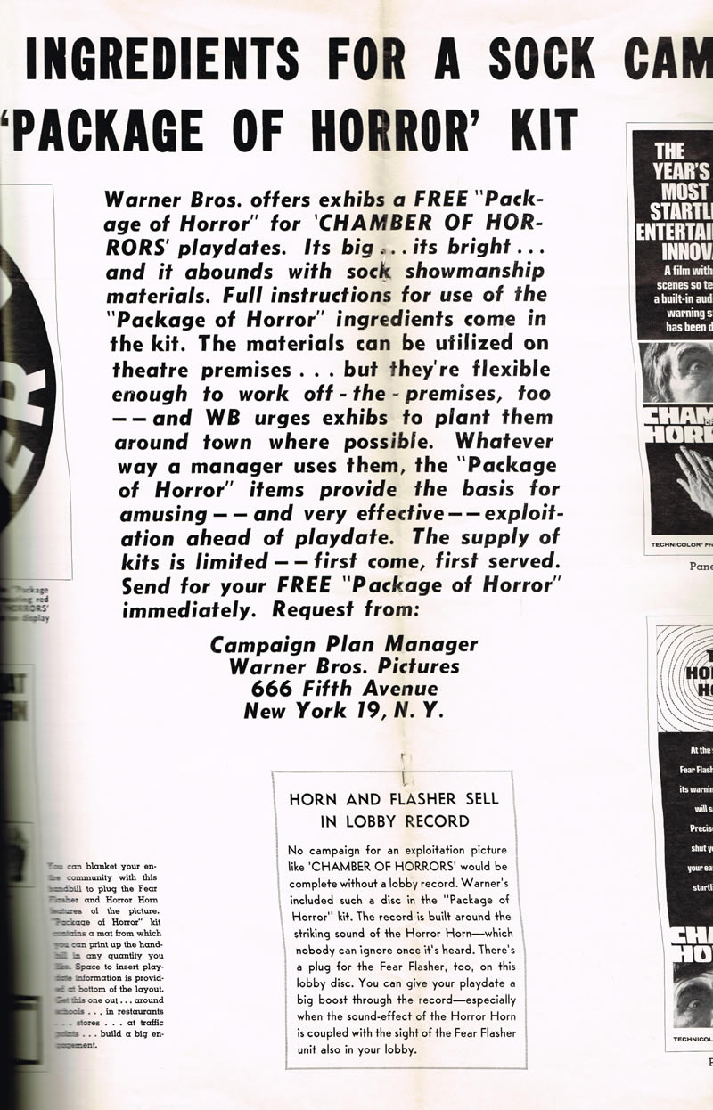 Here's a terrific pressbook for Chamber of Horrors, filled with lurid illustrations and nifty theater giveaways like horror rings and a herald. Also noteworthy are the gimmicks to get butts in seats like the Fear Flasher and the Horror Horn. (I had to break the centerfold spread into three scans due to its size, and the pages are not in exact sequence.) The pressbook size is 11 inches by 17 inches.