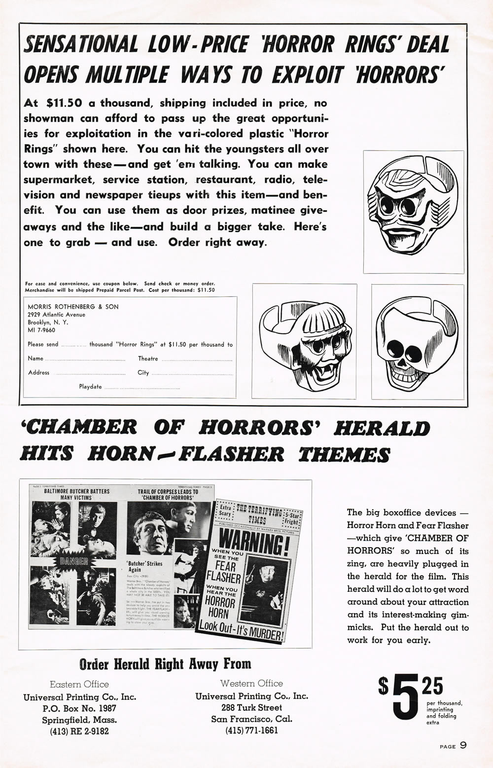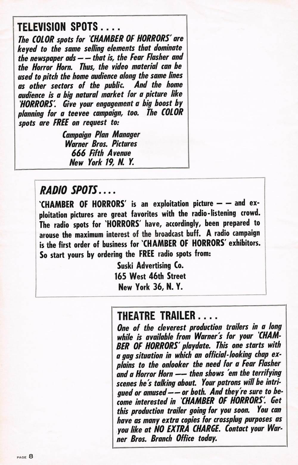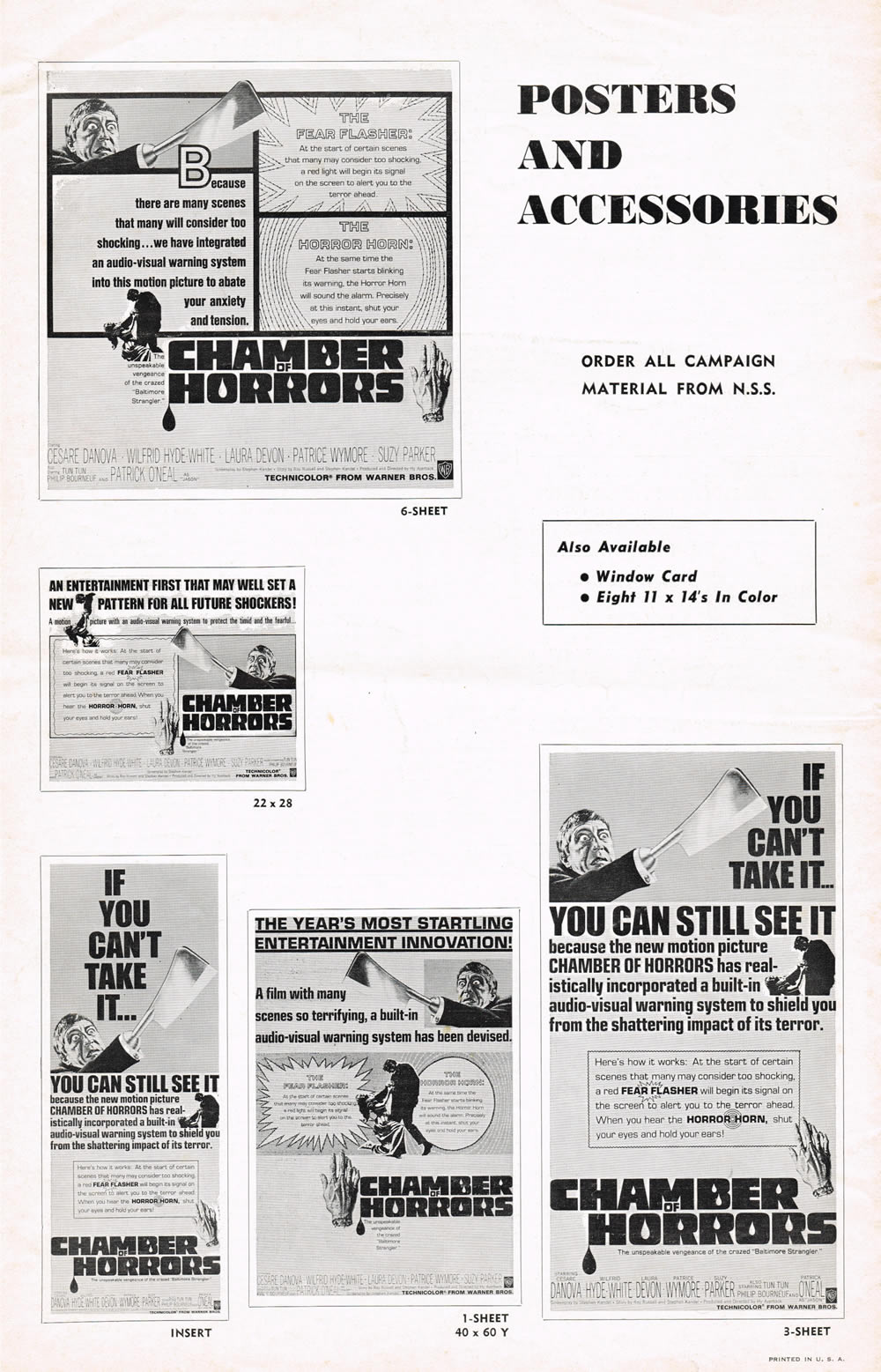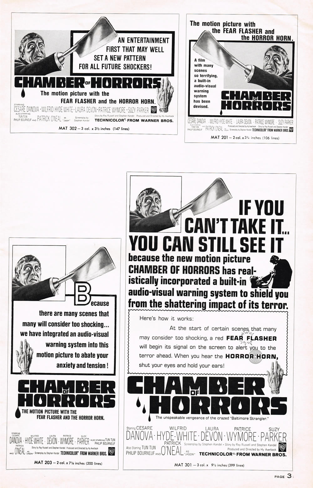 Here's a terrific pressbook for Chamber of Horrors, filled with lurid illustrations and nifty theater giveaways like horror rings and a herald. Also noteworthy are the gimmicks to get butts in seats like the Fear Flasher and the Horror Horn. (I had to break the centerfold spread into three scans due to its size, and the pages are not in exact sequence.) The pressbook size is 11 inches by 17 inches.