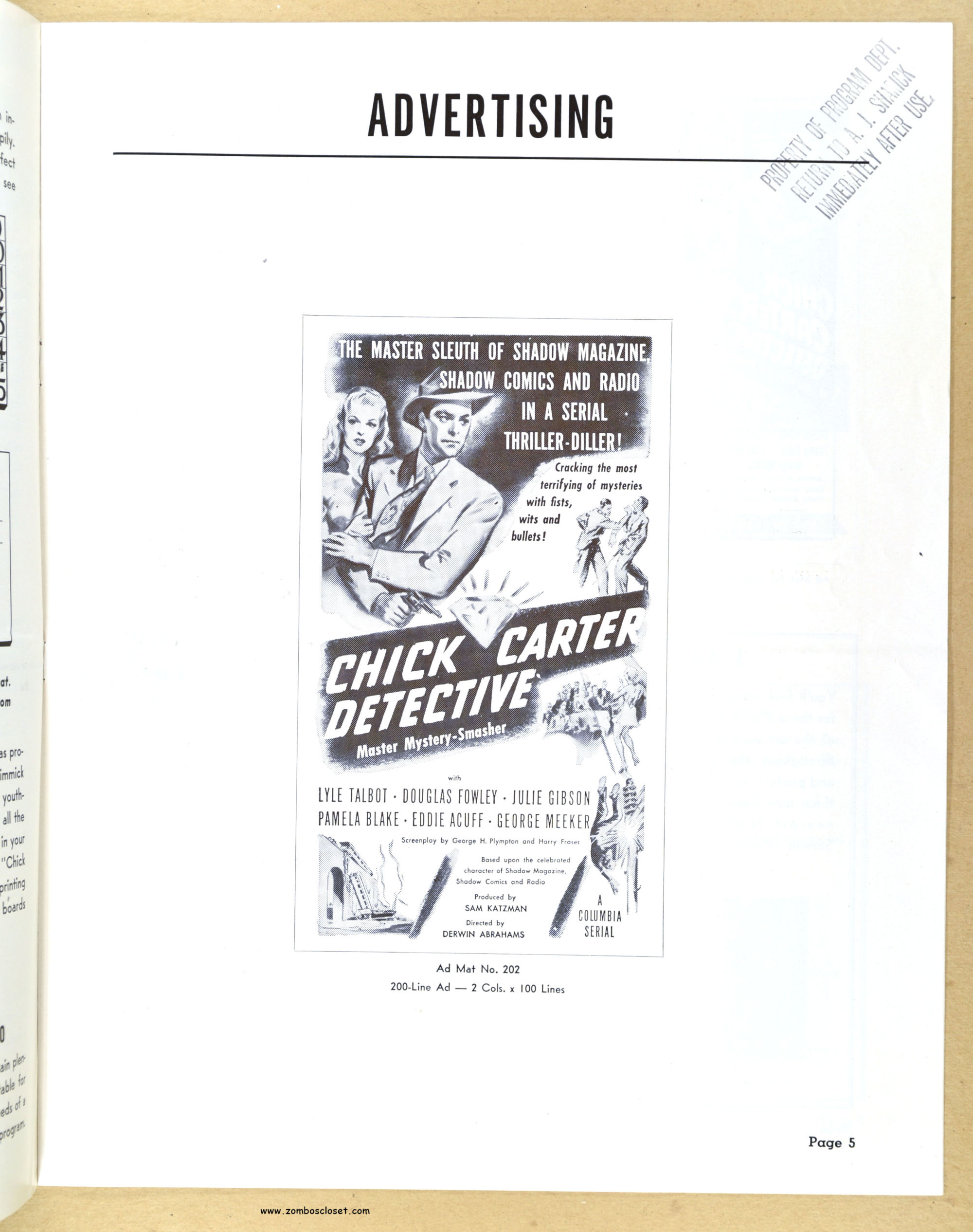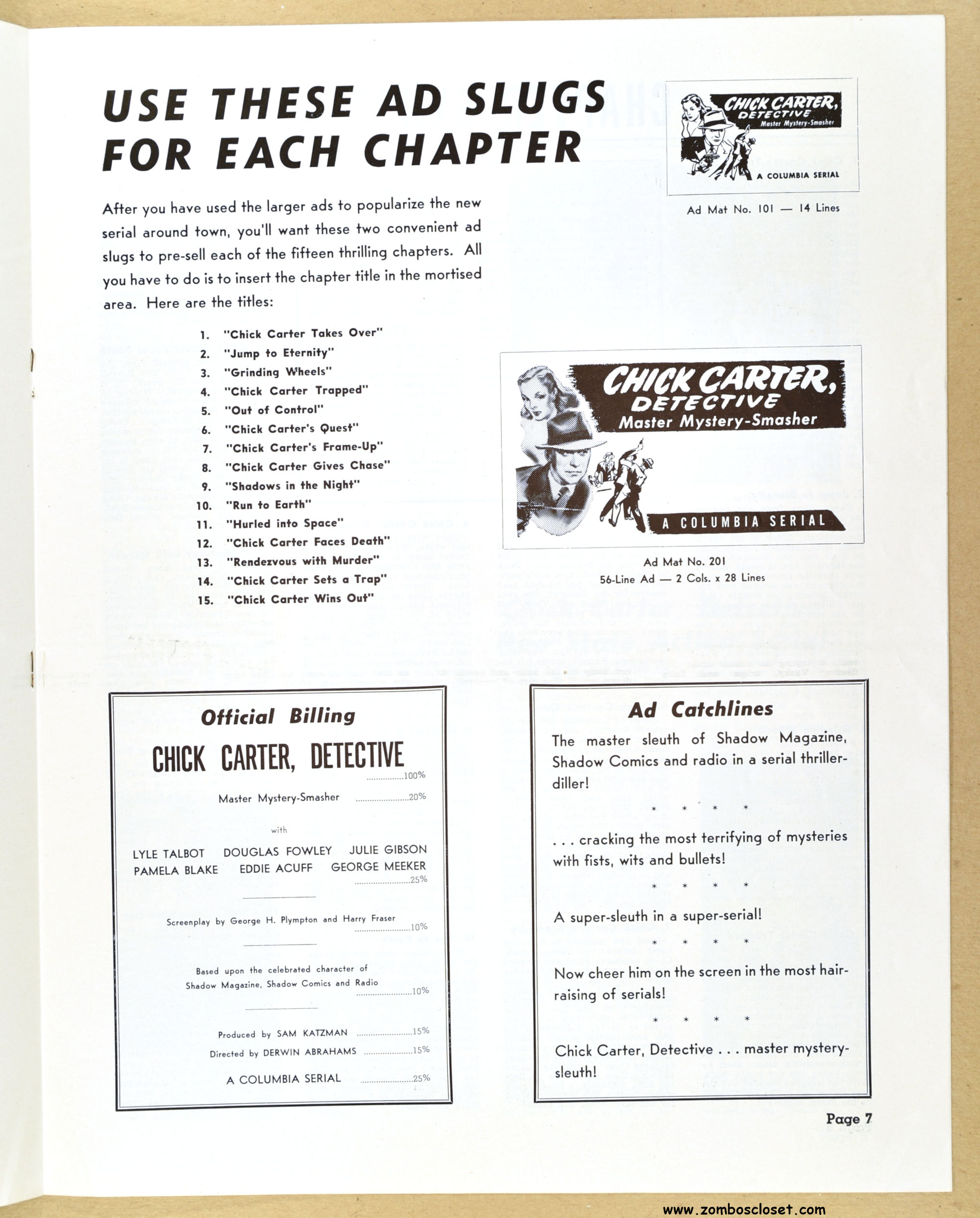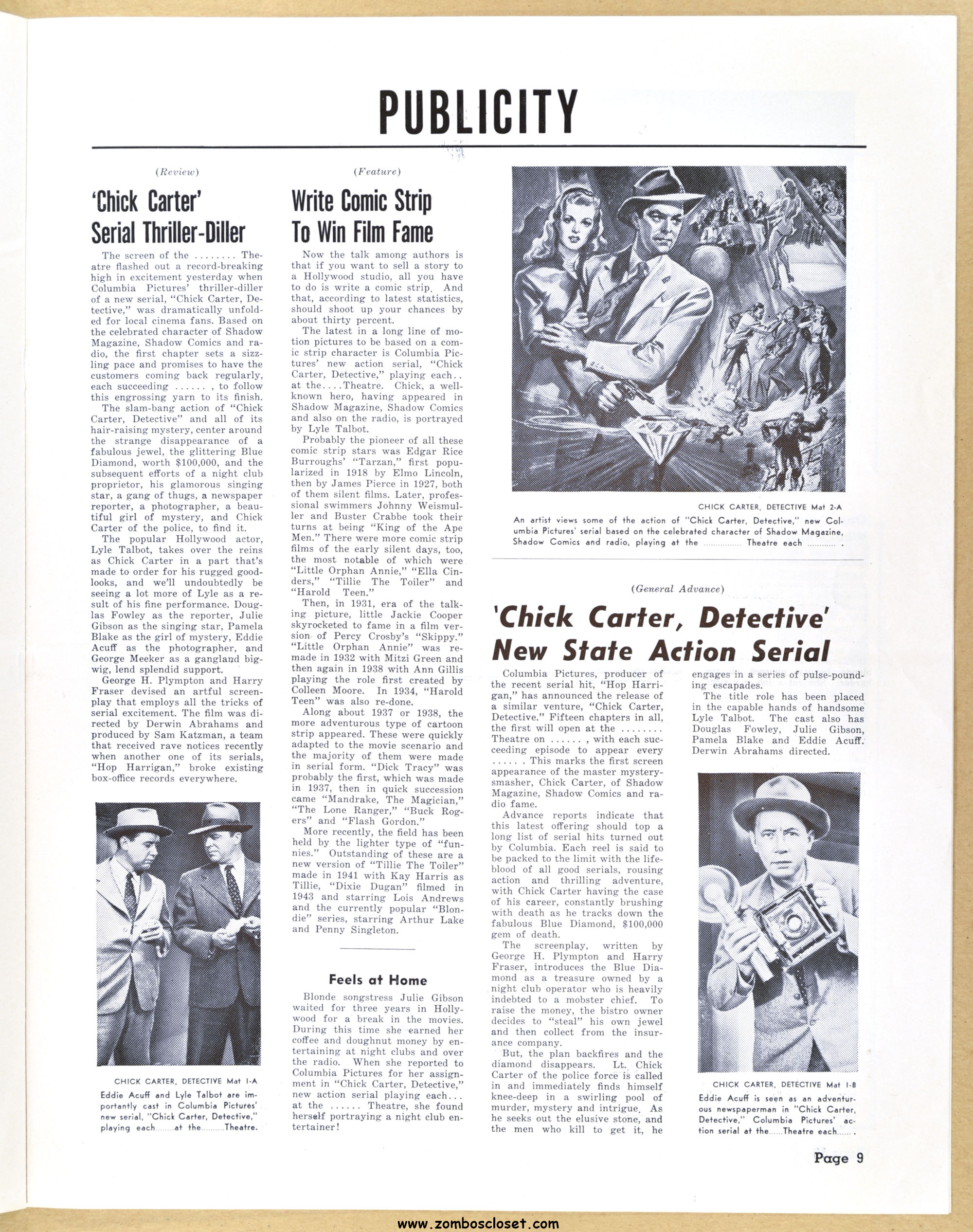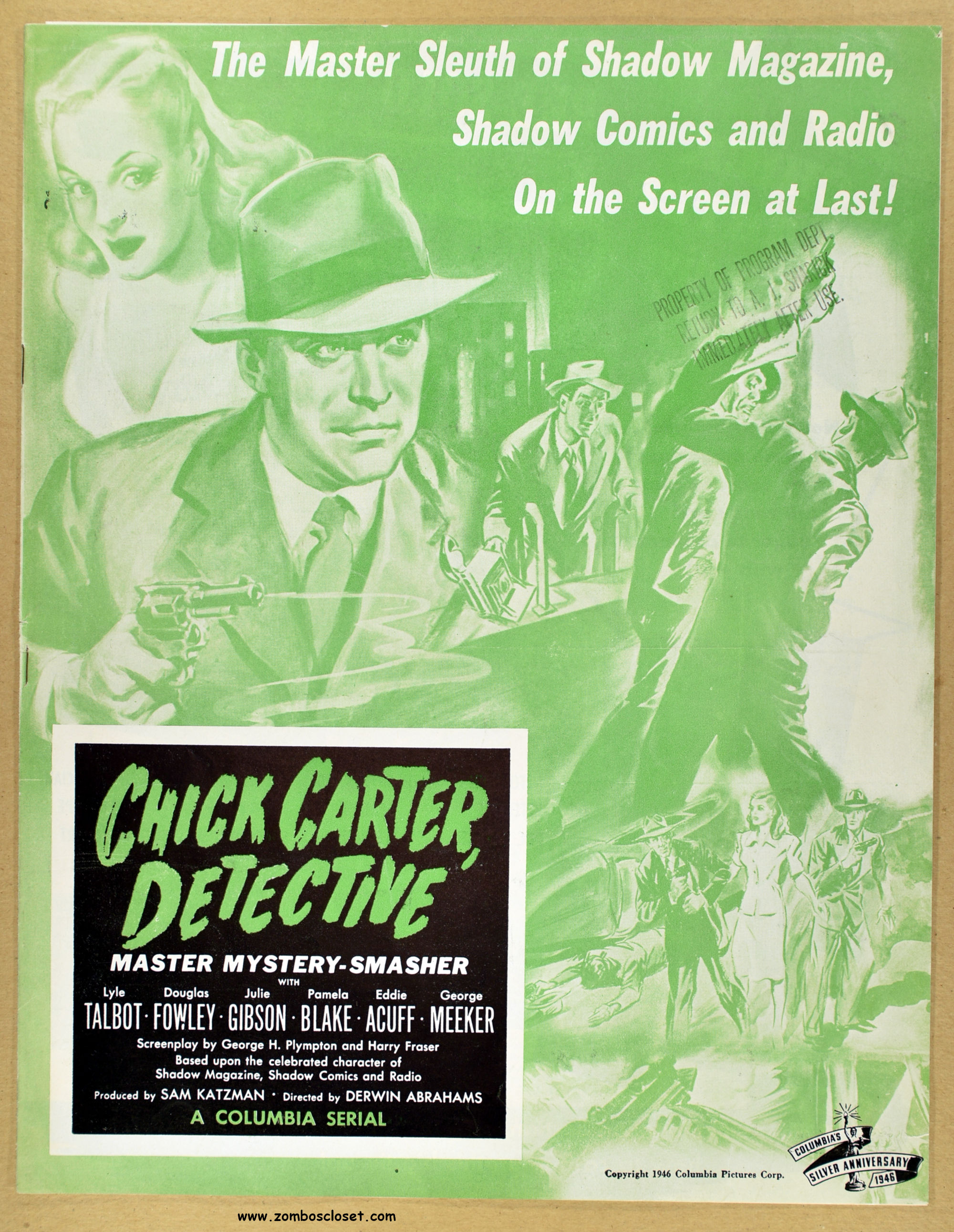 I posted the movie herald and now here’s the pressbook for Chick Carter, Detective: son of Nick Carter, detective. Dailymotion has episodes of the movie online. Julie Gibson (who played Sherry Marvin) also appeared with the Bowery Boys and the Three Stooges. Wikipedia states she’s the oldest living performer from Hollywood’s Golden Age.