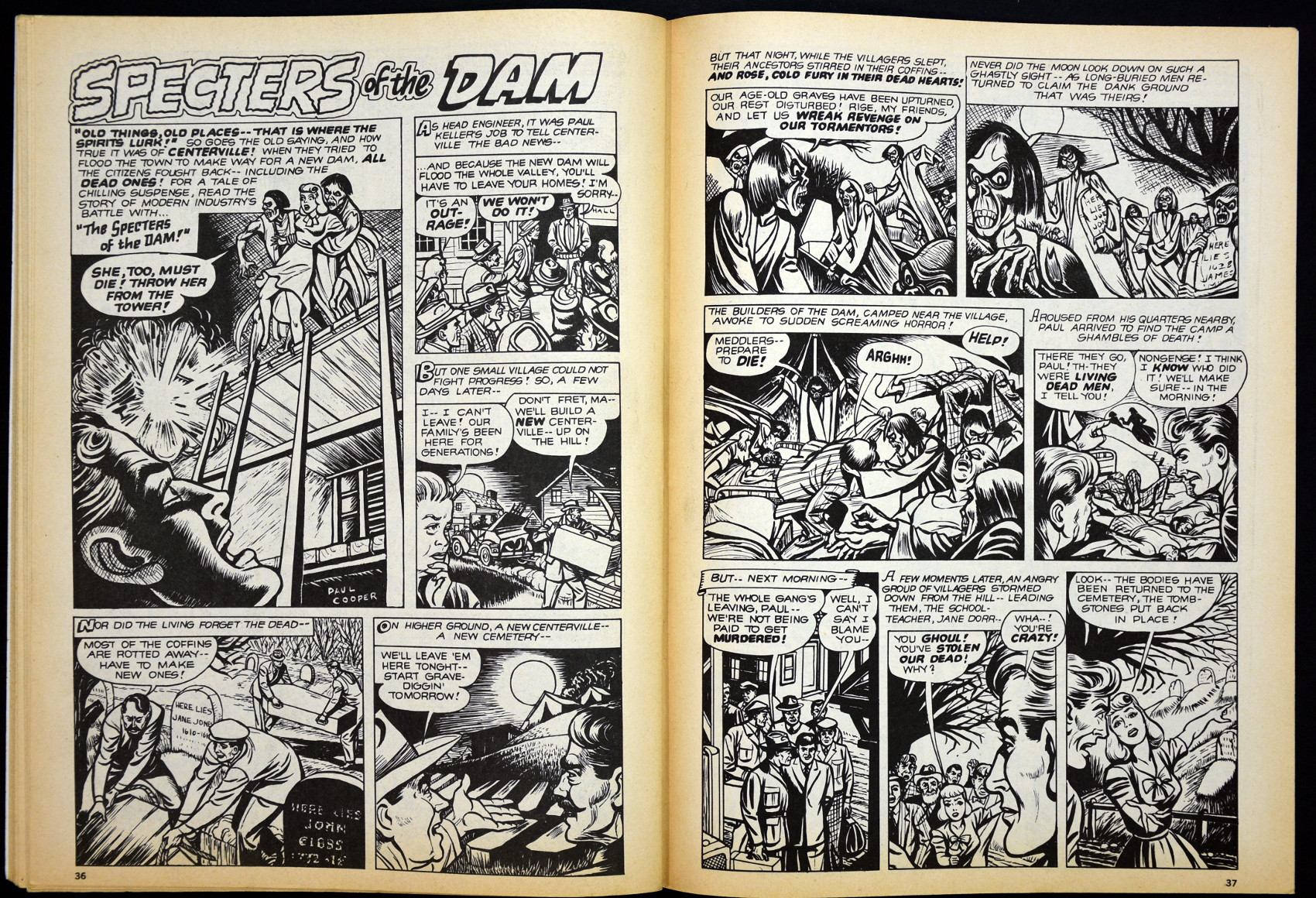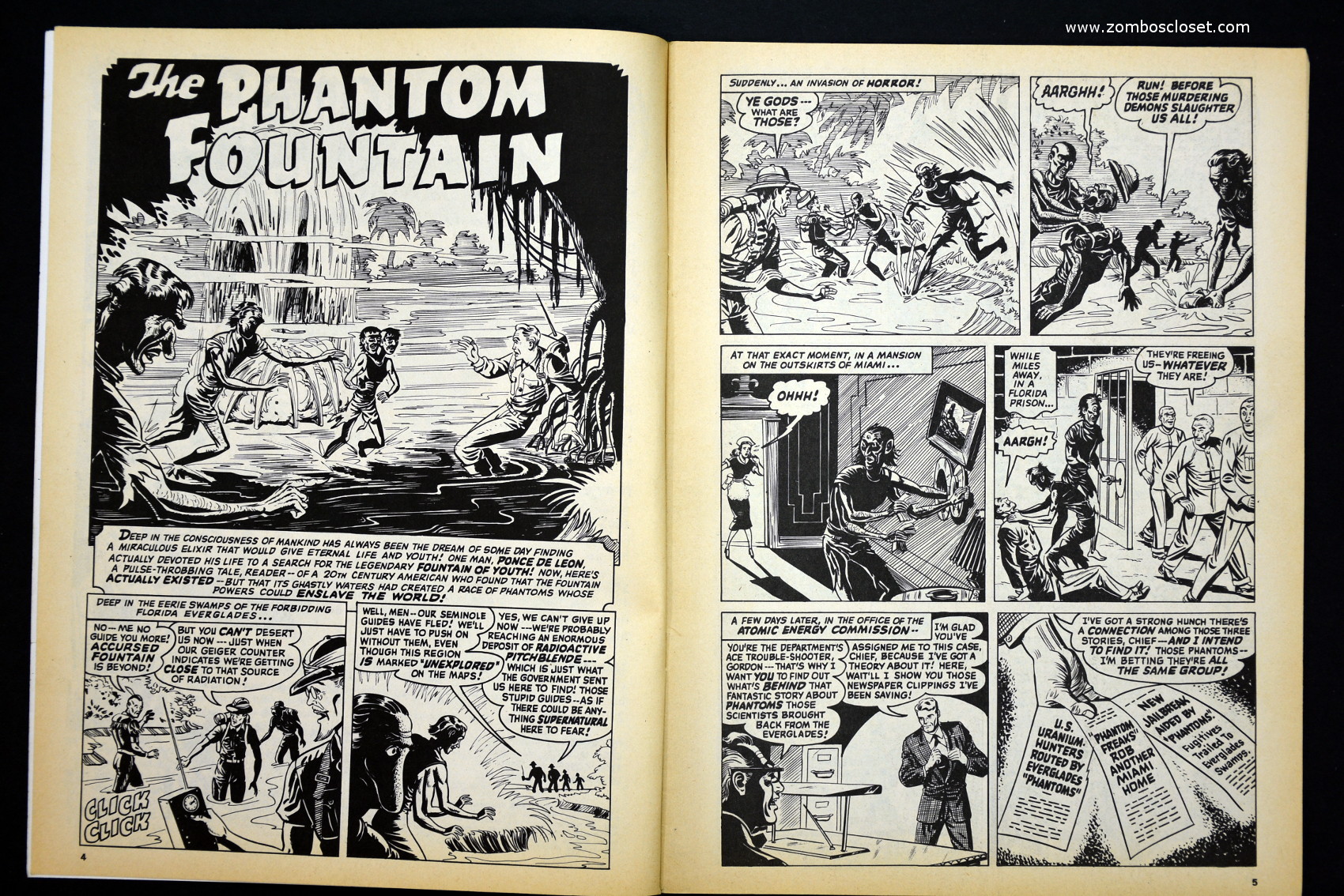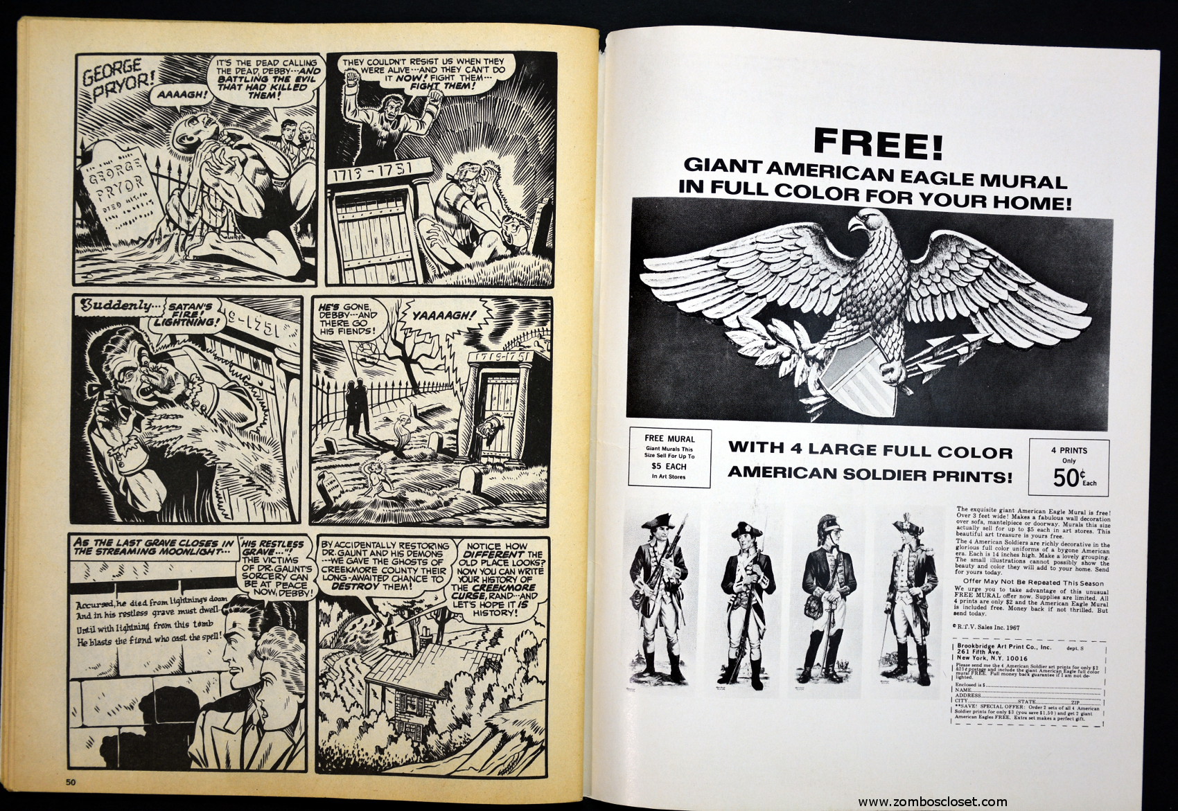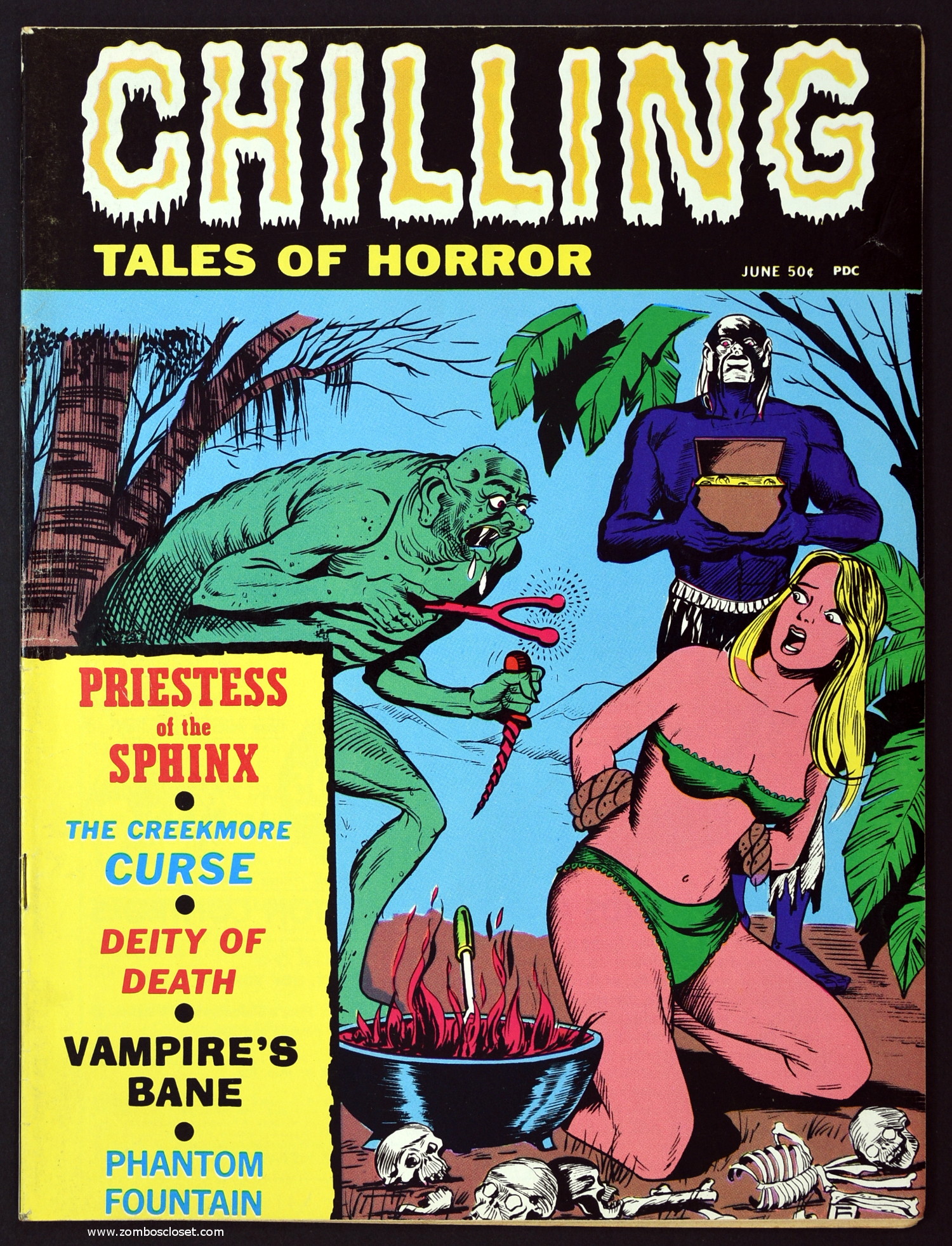 More Chilling Tales of Horror for you: more monsters, dead things, and wicked happenings, all in bold black and white. Color would just spoil the gorgeous line art that's neatly paneled across the pages. Of course, this issue's bondage and torture cover is a lot more, umm, spicy and naughty than the actual stories themselves, but hey, monsters and near-naked women sell, sell, sell. Unless you rather see a near naked man on the cover, of course. Hell, I say we put both a near naked man and a near naked woman on the cover, with leering monsters (better make them near naked, too), and cover all the bases. That's marketing, baby. I wonder how many monster kids got a whoopin' from their moms back in 1971 when they saw this issue in the drawer.
