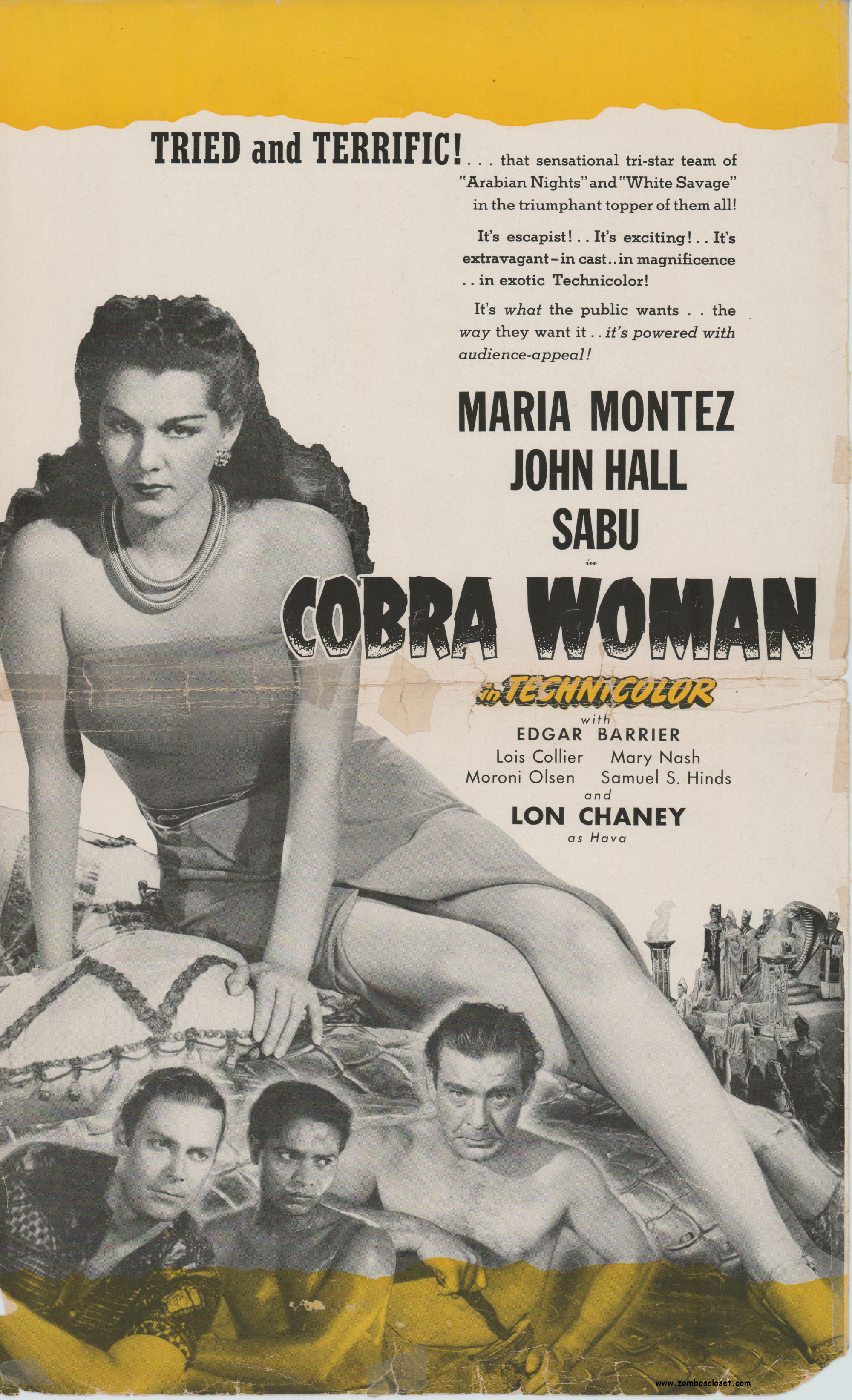 Ah, the good old days when Hollywood idealized, feminized, exoticified, and basically fronted eye-candy appeal stories for pretty women. Such women spent countless hours making themselves attractive to men and simply lounged around until a man came along to get the story moving. And of course they were surrounded by other pretty women, making all men swoon and lust after them. Here's the front cover to the pressbook for Cobra Woman (1944). Maria Montez plays the exotic woman and her twin sister (points for twins!). I wish I had the whole pressbook, but this cover will have to do for now. Leonard Maltin called it a camp classic. You may call it something else. Of course, what's a pretty woman without a tropical locale? Here it's Cobra Island. Along with the prettiness you have Sabu and the not so pretty Lon Chaney Jr. What more can you ask for in a camp classic?