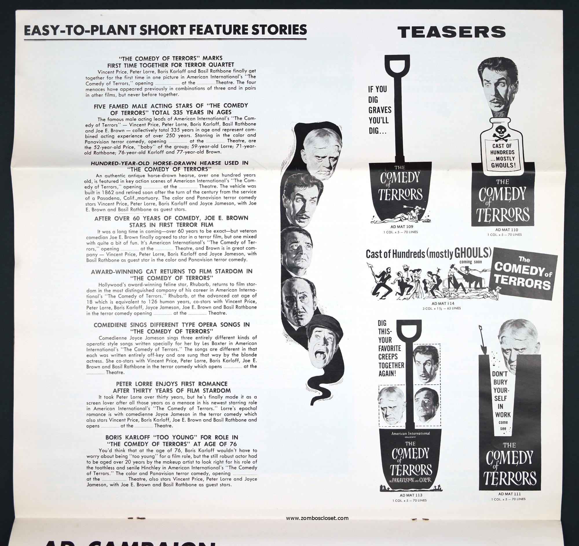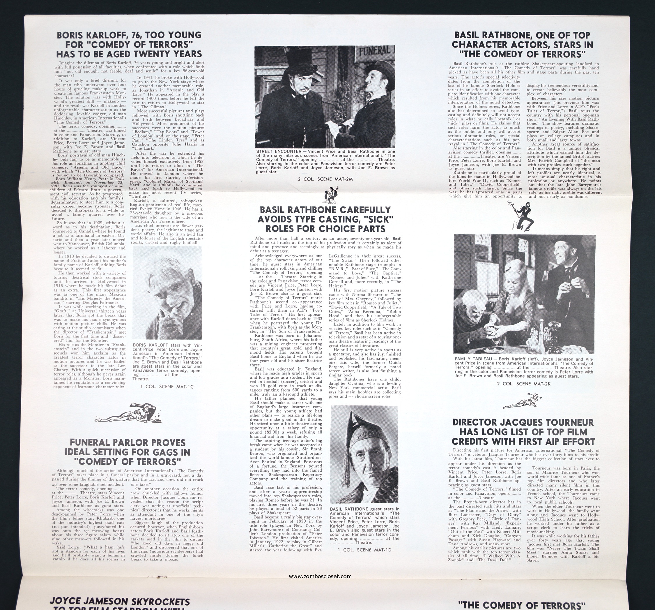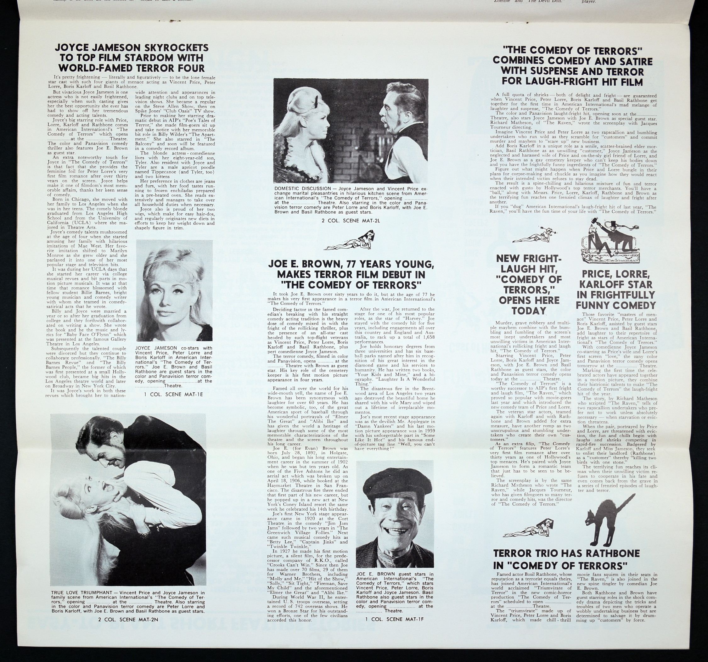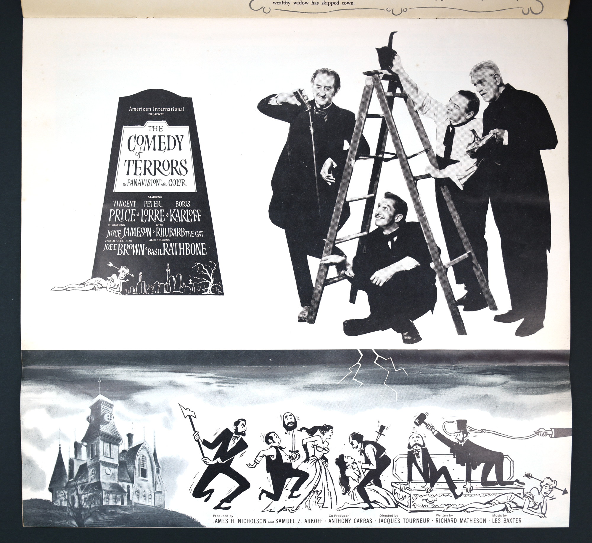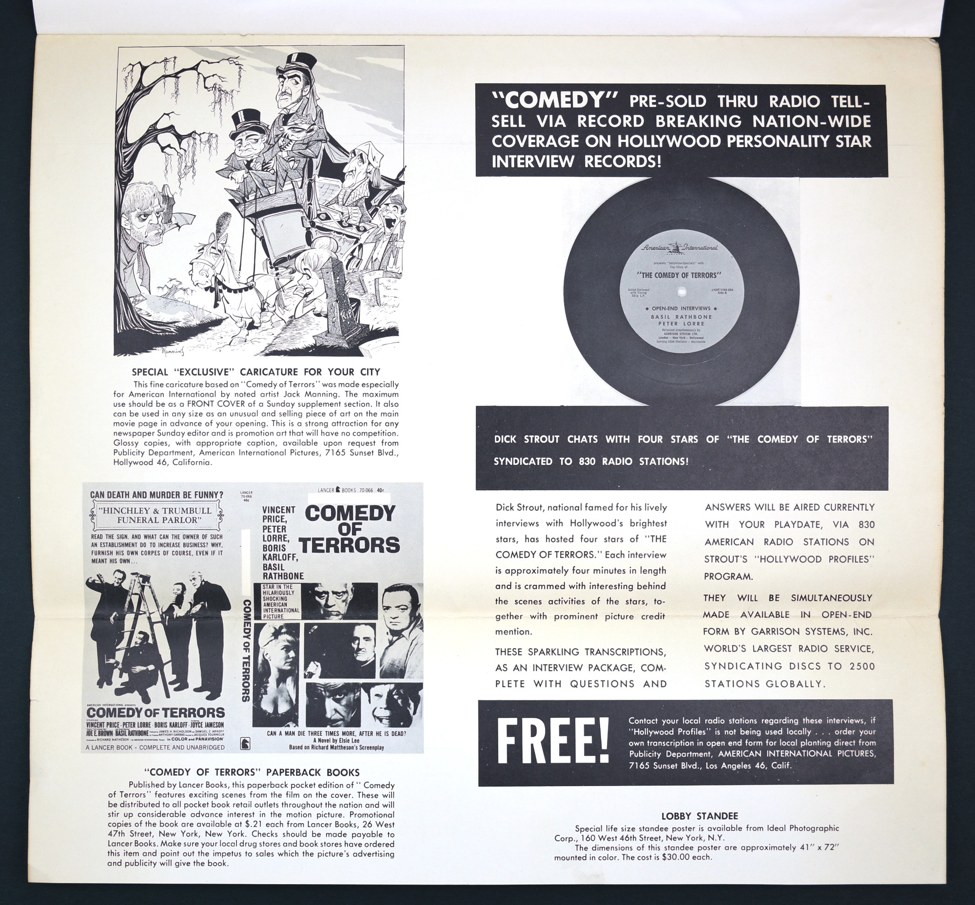 The Comedy of Terrors pressbook is filled with promotion: articles on the notable cast, lots of ballyhoo, and suitably black-humored illustrations. There's even an exclusive caricature and an interview record to hype the movie. Here's the comic book reader version: Download Comedy of Terrors Pressbook