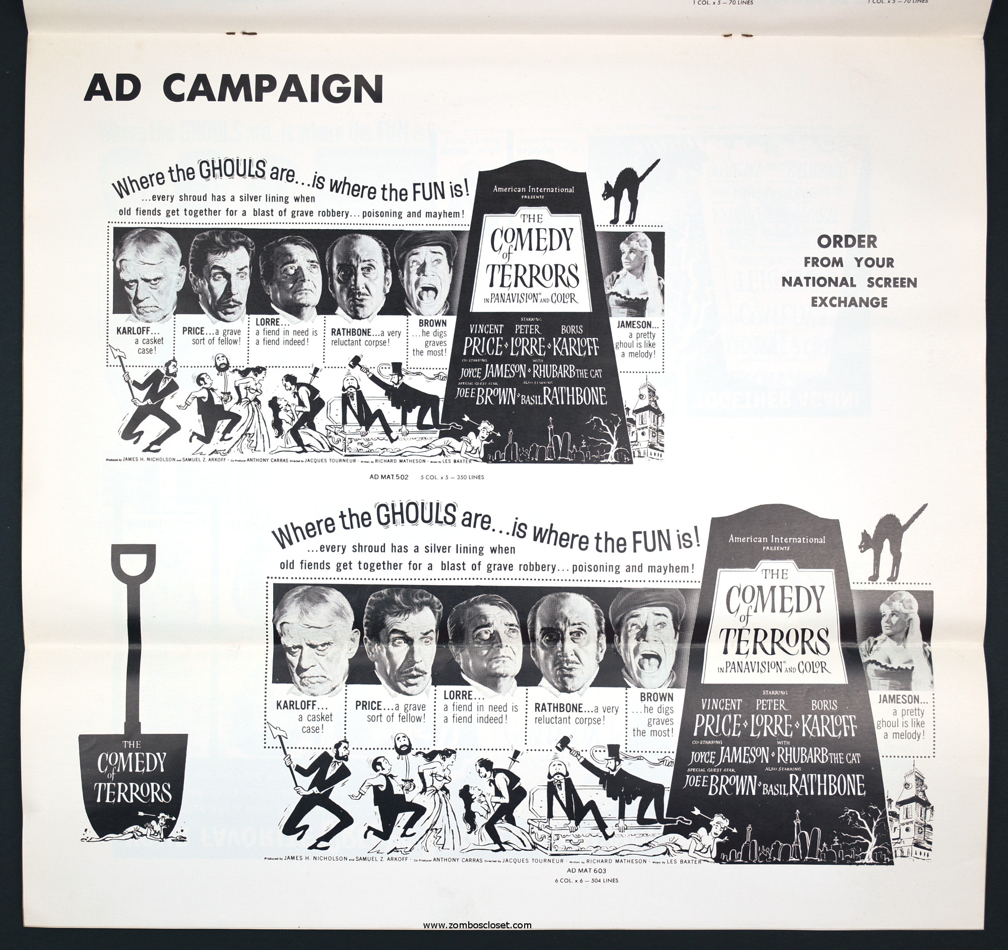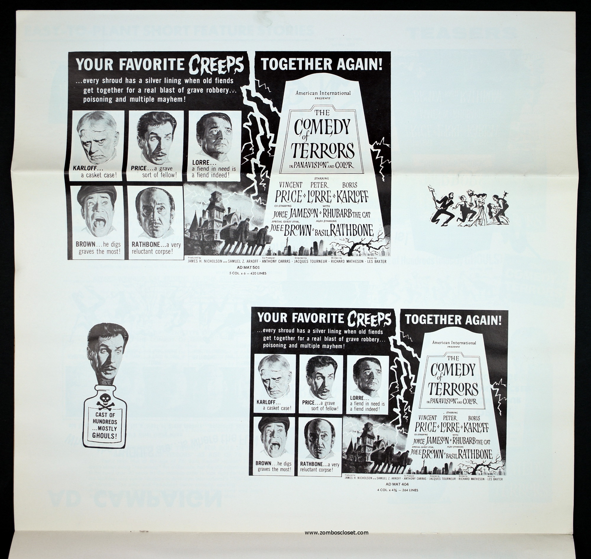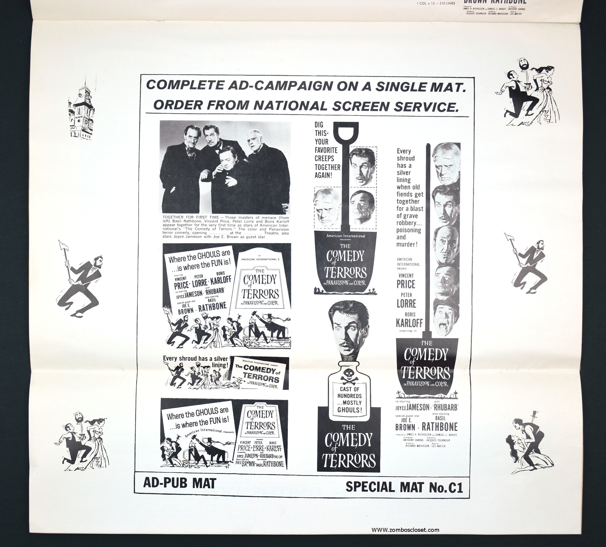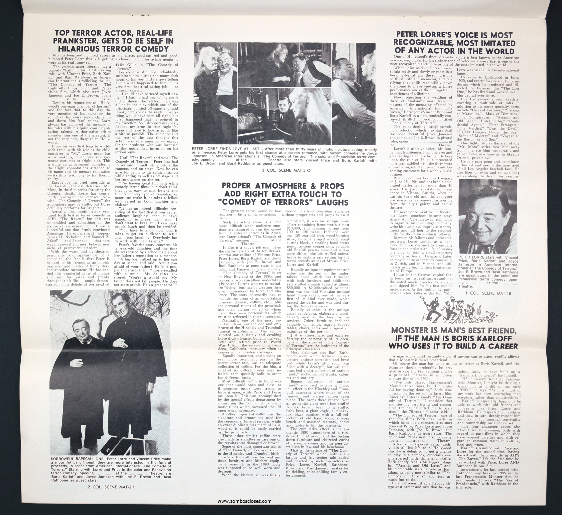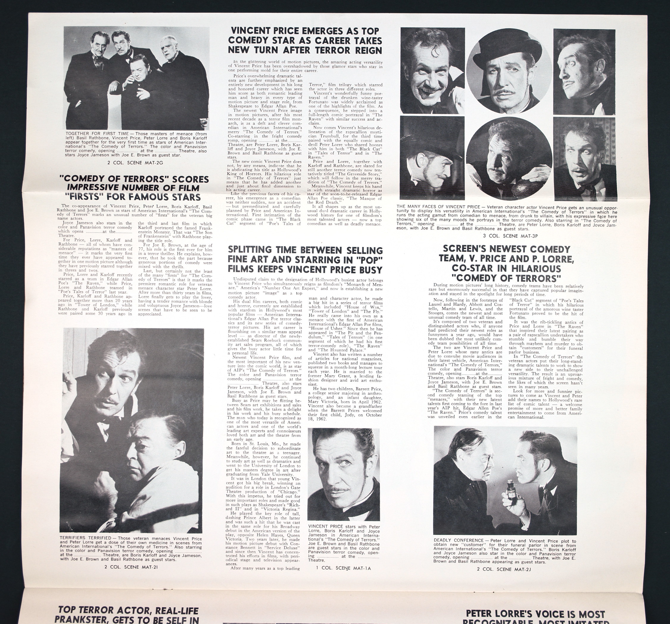 The Comedy of Terrors pressbook is filled with promotion: articles on the notable cast, lots of ballyhoo, and suitably black-humored illustrations. There's even an exclusive caricature and an interview record to hype the movie. Here's the comic book reader version: Download Comedy of Terrors Pressbook